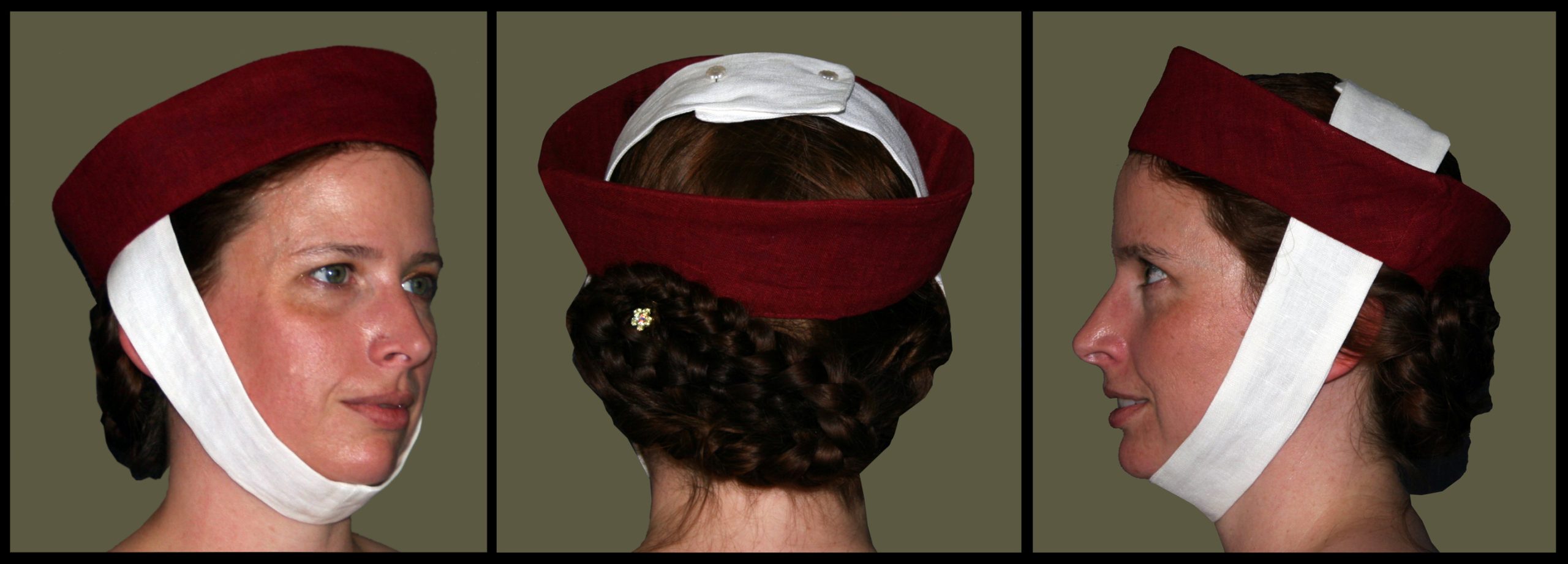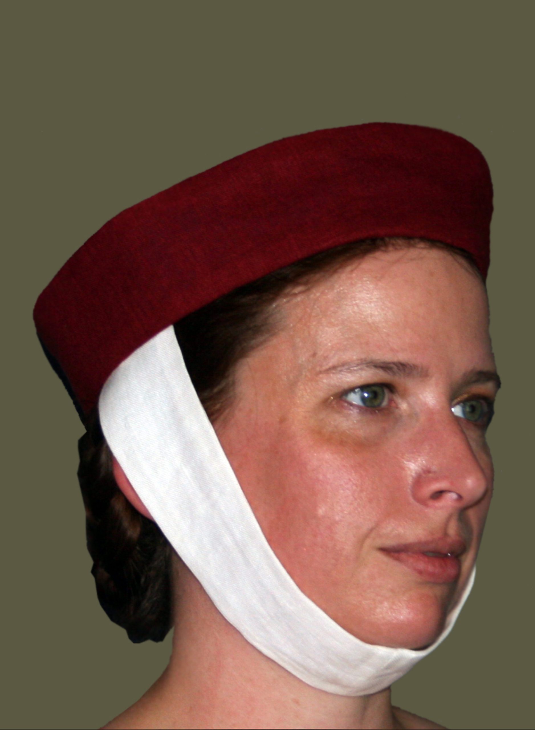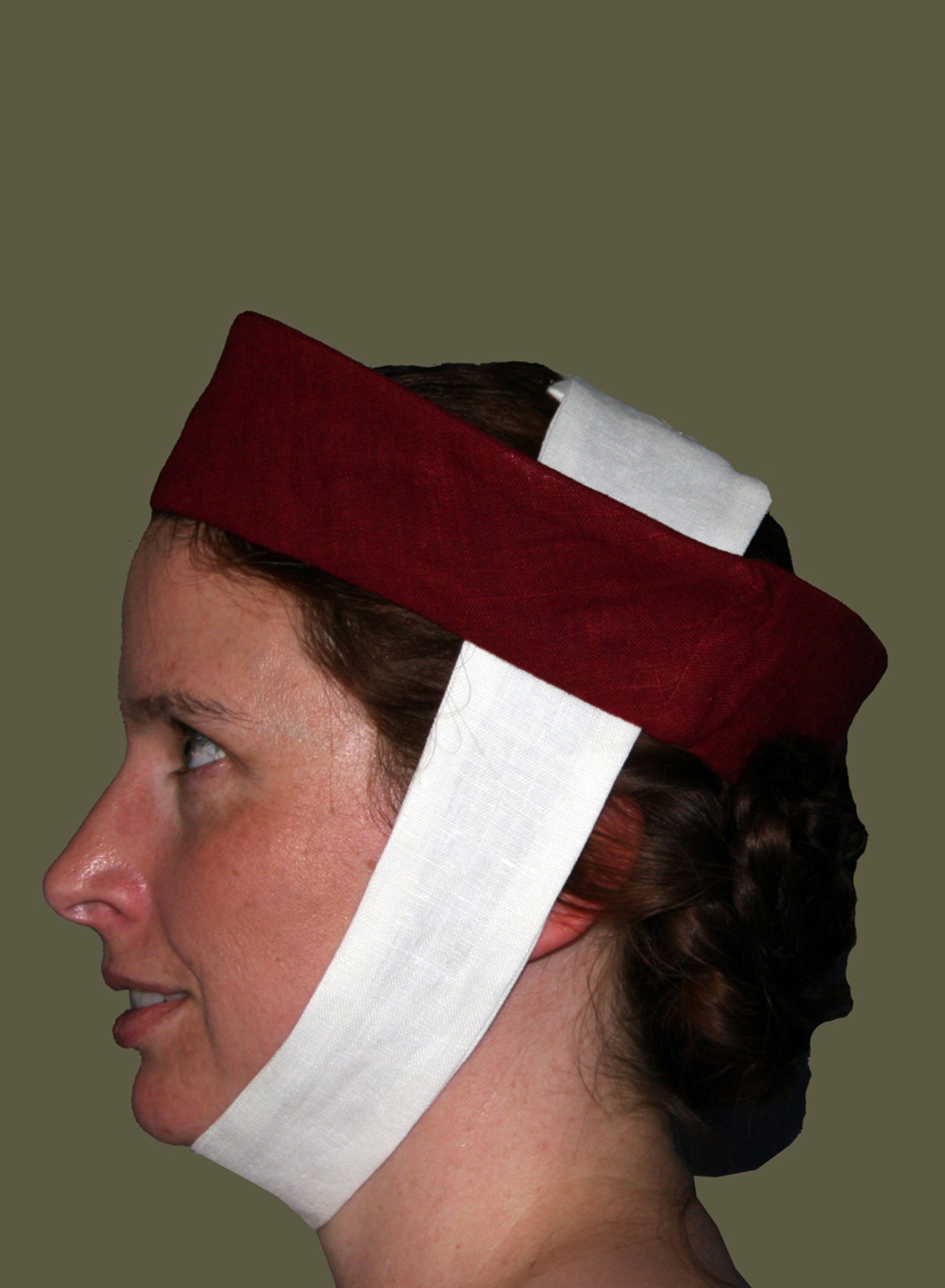 Head-coverings were a critical component of dress in the Middle Ages. Hats were common with men and women of all classes, and came in a wide variety of forms, and made of a wide variety of materials. Men wore their hats alone or over a hood or coif, while women seem to have worn theirs either alone, over a simple veil, or a full veil and wimple. Our decorative fillet is open topped and best secured to head when worn with a Barbette or Wimple using Veil Pins. Our women’s decorative fillet can be dated as early as the mid-13th century Macjieowski Bible and was used throughout the 14th century and are made in 100% linen colors to coordinate with our other medieval styles.