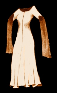This gown’s front closure uses the same placket design as our back-laced gowns, allowing it to be fully adjustable. The lacing, split sleeves and linen construction makes for a perfect dress on hot summer days. Our standard lace is a natural color or you can get black for an additional charge. Made in 100% linen, the split-sleeved frontlace gown is available in the colors listed below in all of our standard sizes. Please note that in our historical references, below, the gown is always pictured as a short-sleeved gown, with the underdress omitted. This is simply so that he lines of the overdress are not obscured in the drawings. Please note that the gown is always shown worn with a long-sleeved underdress. In period, ladies did not brazenly display their arms!