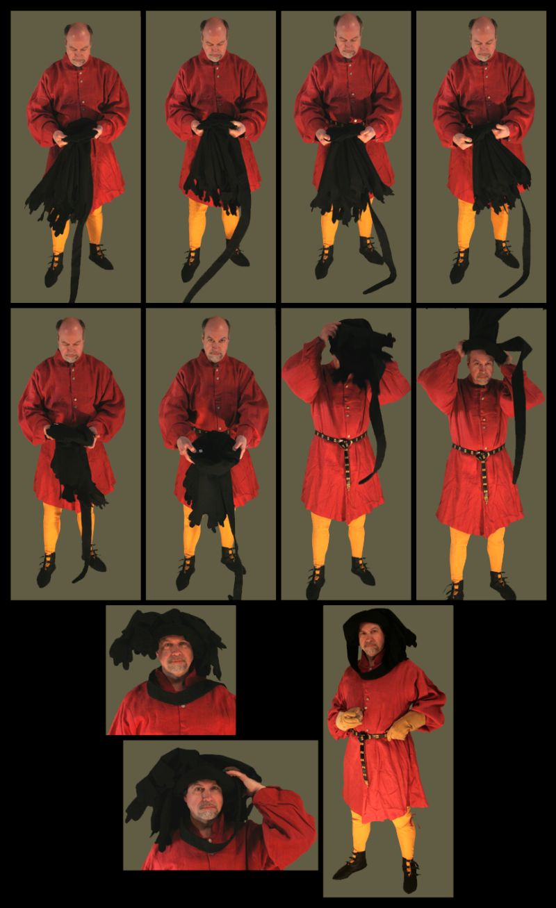 When shopping with us in person our customers often ask us to show them how to make their hoods in chaperones so we decide our long distance web customers also needed a visual primer to refer to. It really pretty simple, just like any new technique it just takes a little practice. Basically take your hood by the ‘face opening’ and start rolling it the outside. Then keep rolling until you almost can’t roll in any further. At that point, you should have a nice, thick roll – this is the brim of your chaperone. Put the chaperone on your head and adjust the the dags accordingly to taste – they can go to both sides, all directions or just one to side. The dags effectively end up looking like crazy, dagged hair and flop in all directions. Other options are draping the liripipe (long tail) around the neck, tucking it into the brim or winding it around the brim. We can document the chaperone worn in all these variations. So, be bold, experiment, have fun!