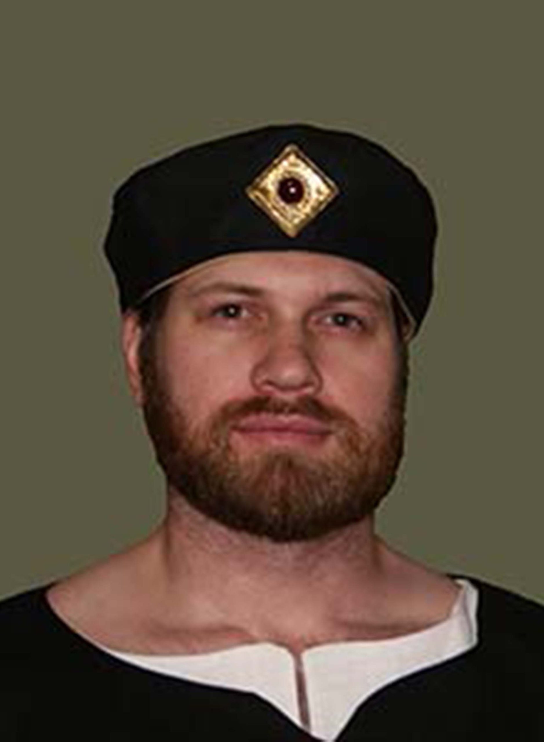 A lord feigns disinterest as he casually displays his wealth with a burgundy and cream velvet brocade houppelande, contrasted with gold simple hose and and a gold turret hat. He finishes the look with some black leather accents: a Simple belt, Ankle boots, and a pair of swordsman’s gloves.