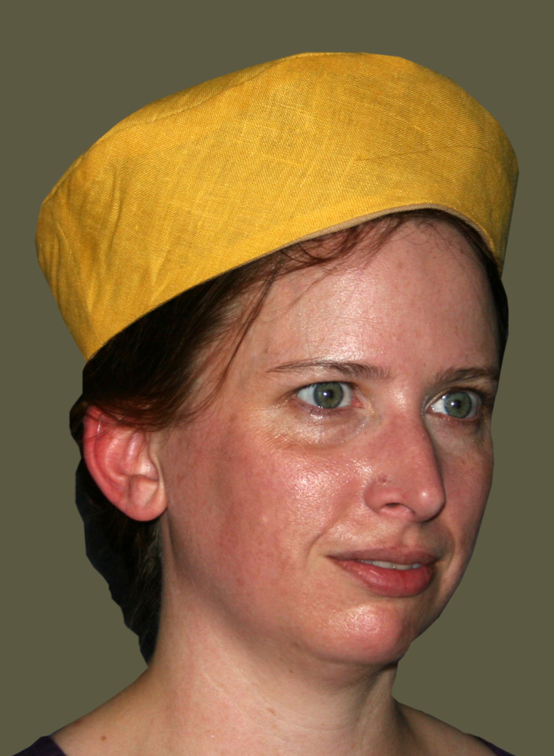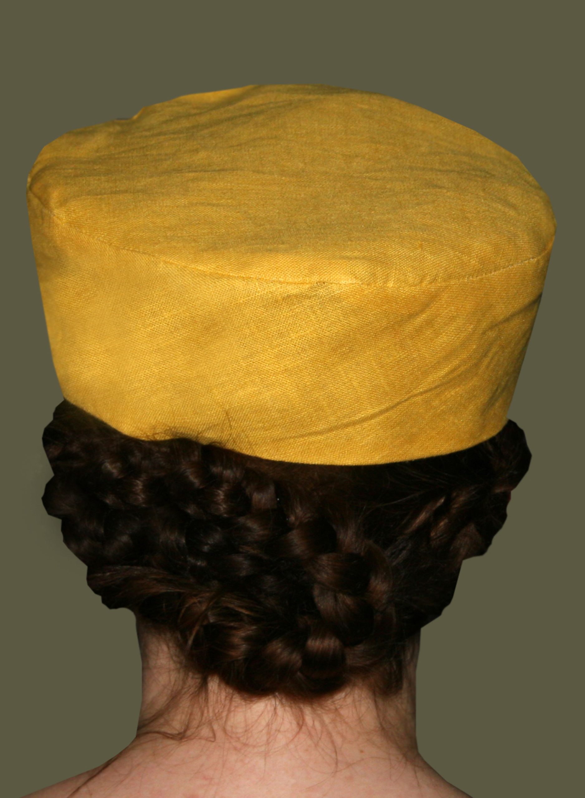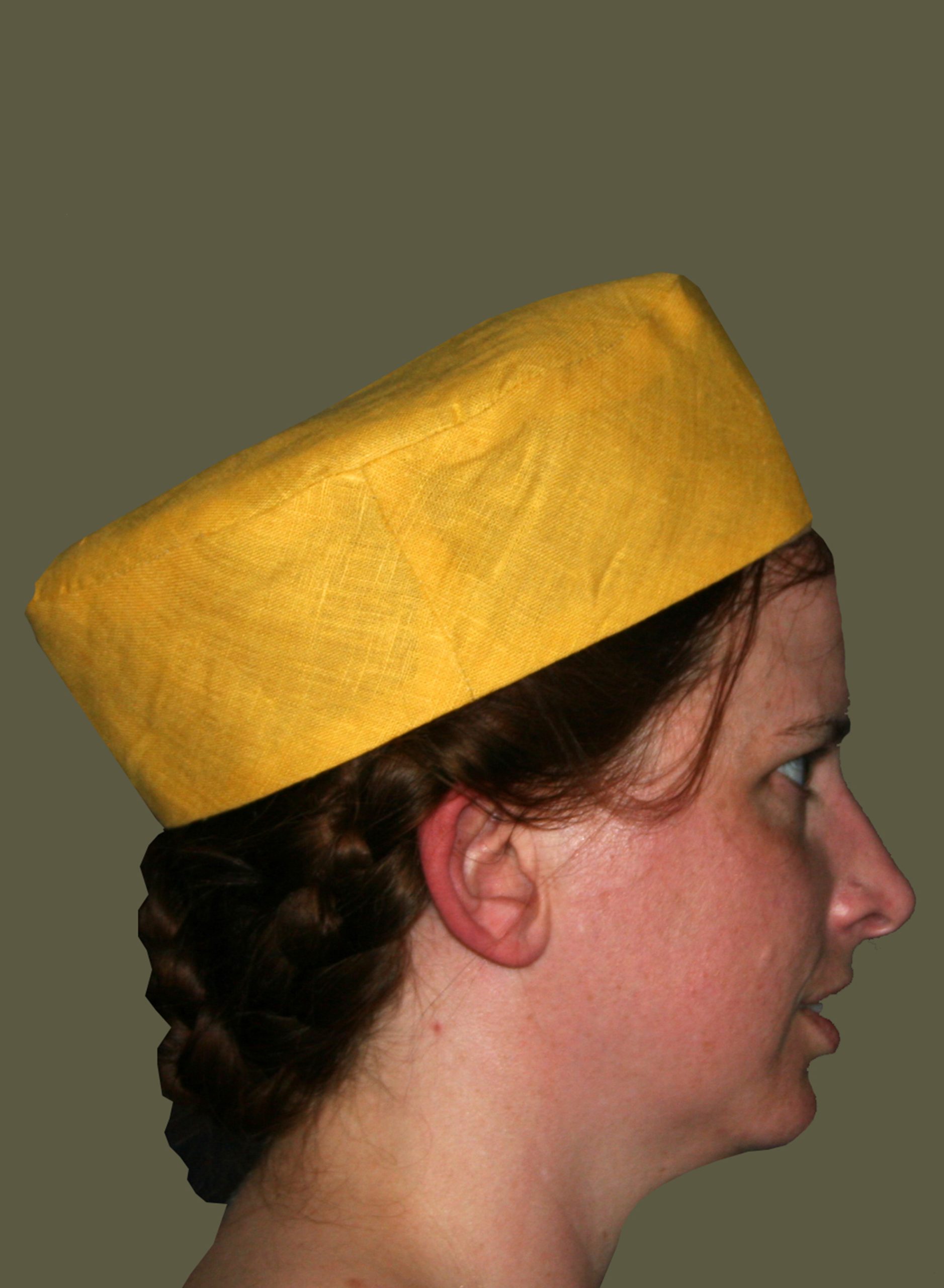 Head-coverings were a critical component of dress in the Middle Ages. Hats were common with men and women of all classes, and came in a wide variety of forms, and made of a wide variety of materials. Men wore their hats alone or over a hood or coif, while women seem to have worn theirs either alone, over a simple veil, or over a veil and wimple. Our Turret Hat can be dated as early as the mid-13th century Macjieowski Bible and was used throughout the 14th century, worn by men and women and are made in 100% linen colors to coordinate with our other medieval styles.