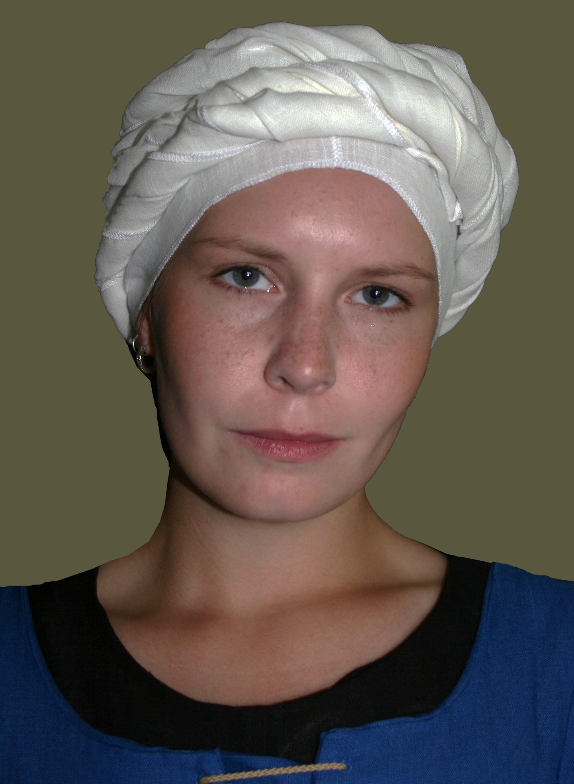 “What do I do with my hair?!?” has been the anguished cry of women frustrated with a “bad hair day” or keeping their long locks out of their way while working for centuries. And, of course, in many times and places throughout the Middle Ages a married woman or lady of station was expected to keep her hair covered. While noblewomen often relied on the veil, or the veil and wimple, a far simple and more practical style developed amongst the working classes in the 13th century, and became a common fashion for the next two centuries, particularly in the Italian and German principalities and free cities. Likely developed from a practical “ad hoc” solution by bathers wishing to keep their hair dry, a long piece of linen was wrapped about the head into a tight turban, sometimes worn with a rectangular veil added over top, especially in Italy. A perfect, simple, comfortable and historical way to keep your hair out the way and in the heat of summer you can even soak it with cool water before wearing – kind of medieval air conditioning!