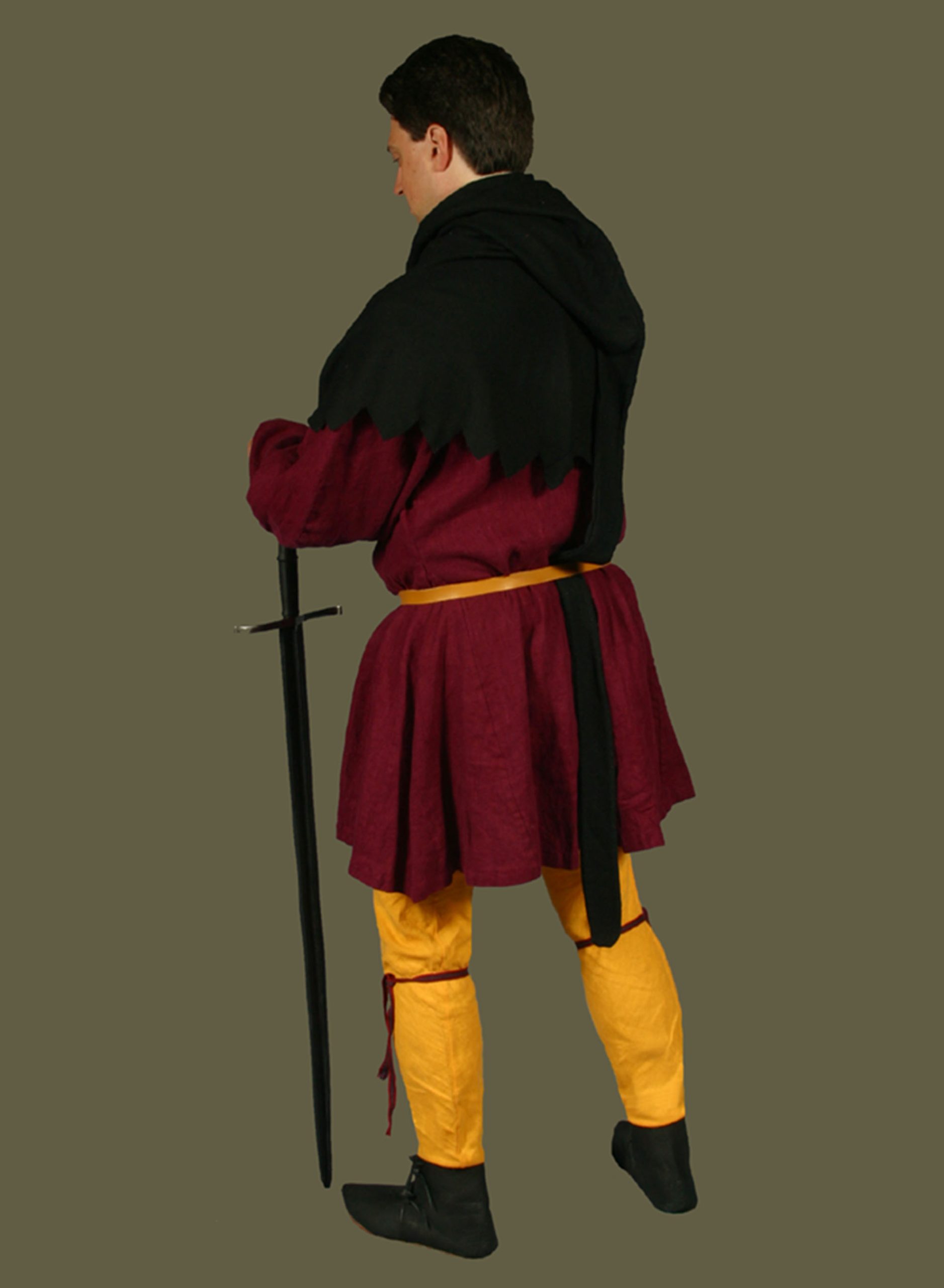 This Lord stands valiantly in a red linen Cotte and gold linen Chauses. Hidden beneath are his Shirt and Braies. He narrows his waist with a decorated Belt. His black Ankle Boots match with his black wool Dagged Hood