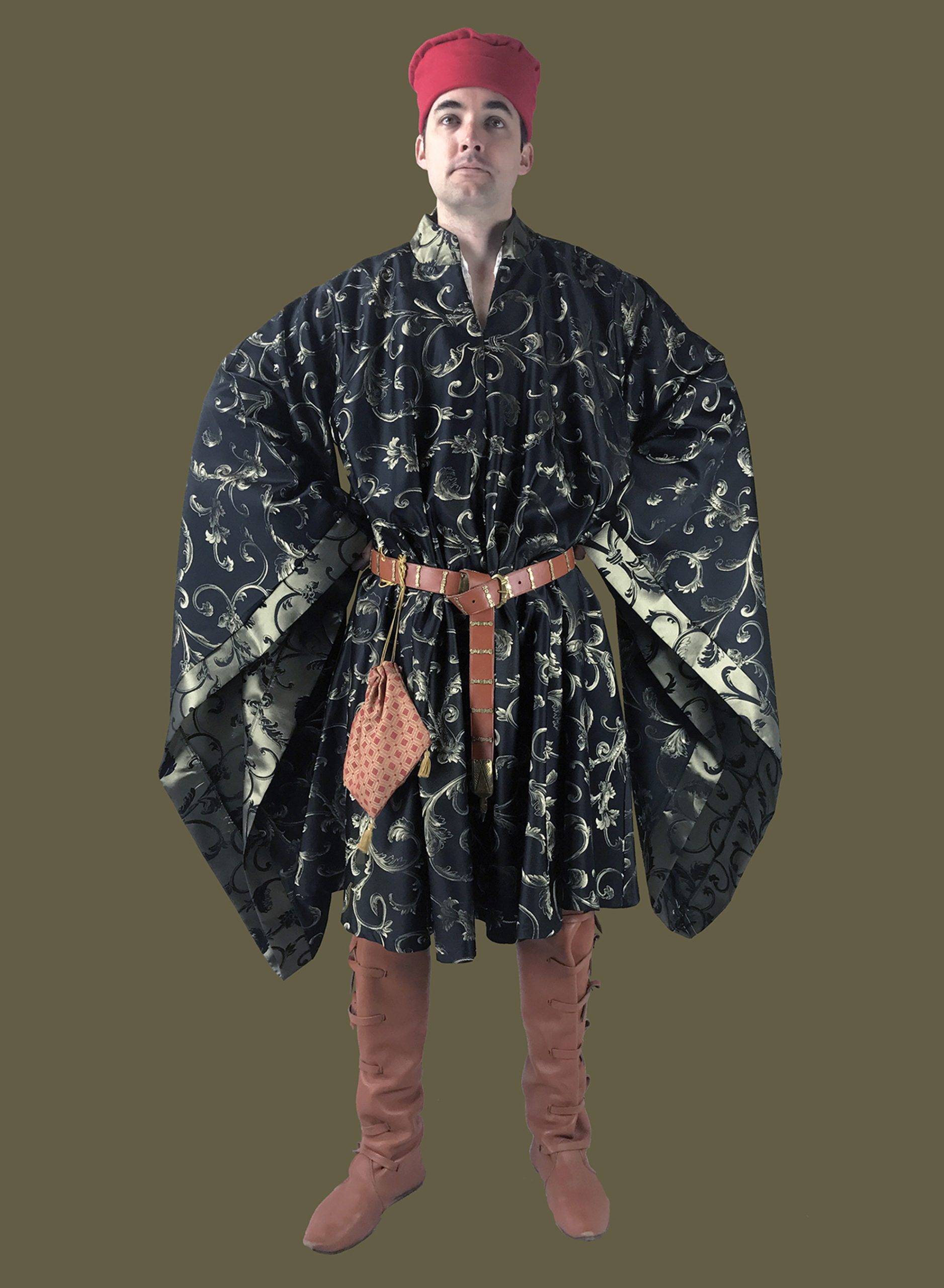 This Lord dons a black and silver Brocade Houppelande. He accents with a red Italinate Hat for a splash of color. His brown Tall Boots match his Decorated Belt. To complete his look he places his valuables in his custom brocade tasseled Pouch. Beneath he wears his Collared Shirt , Cotehardie and Simple Hose