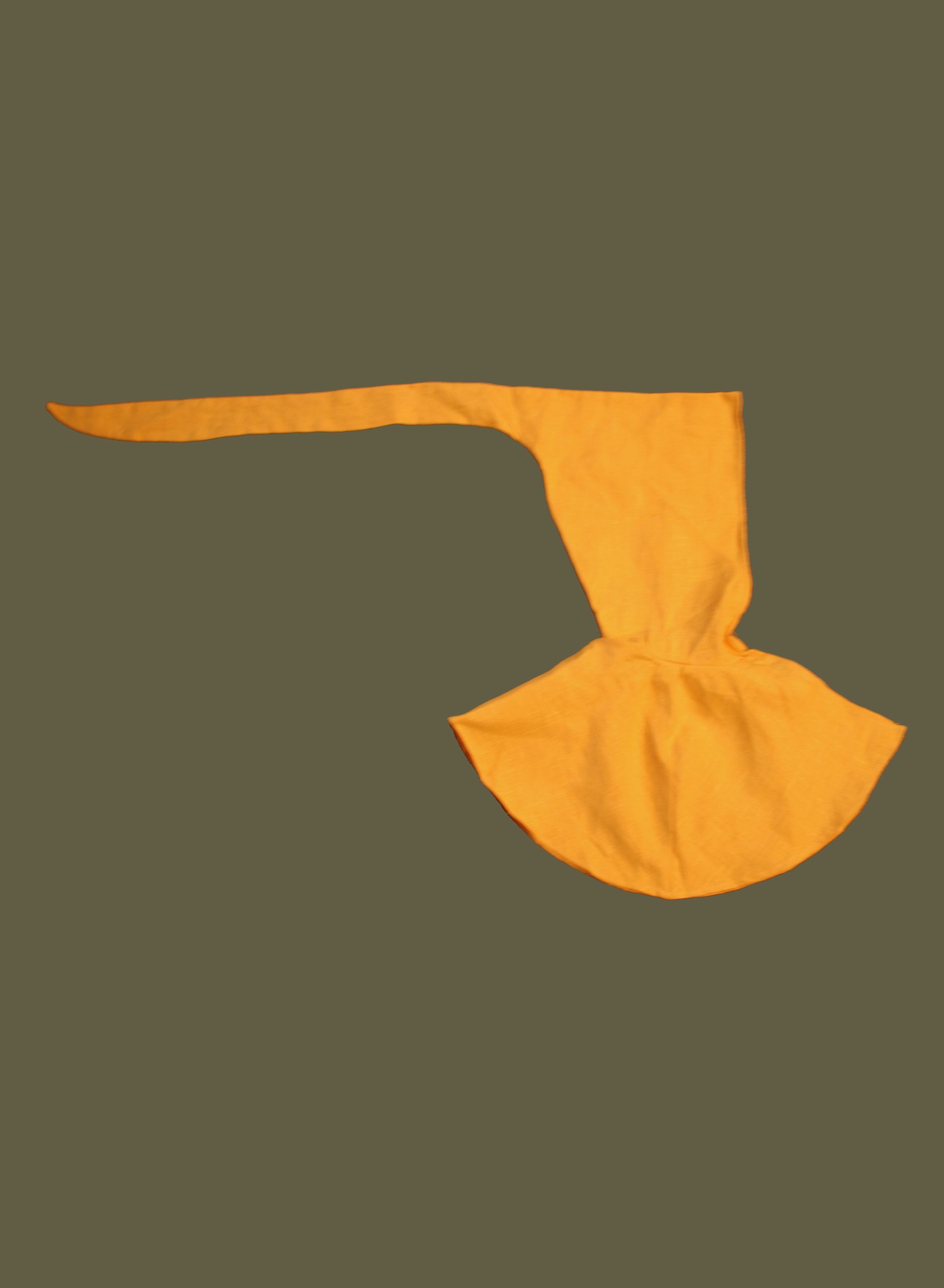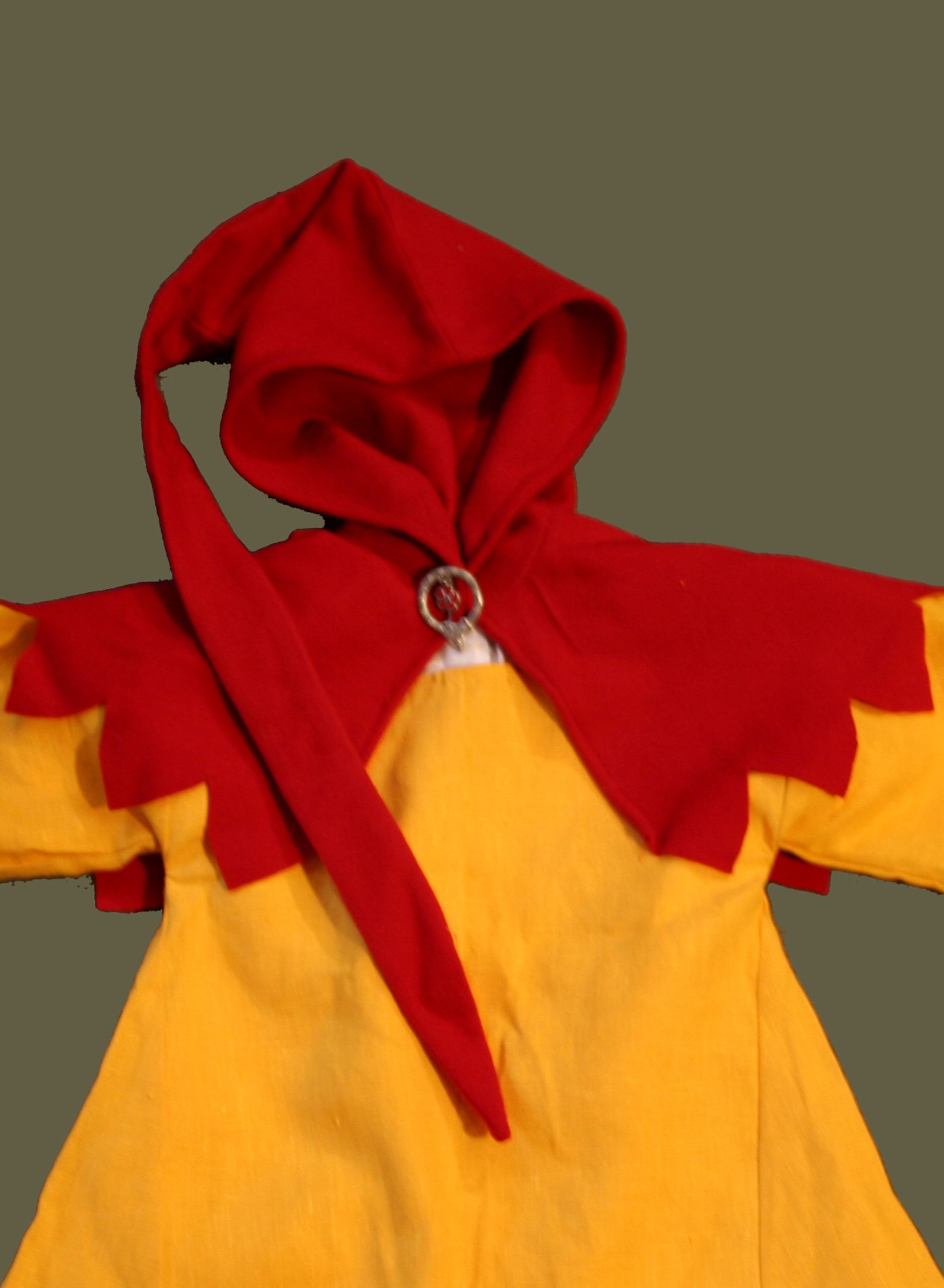 Our children’s wear line is based on smaller simplified, versions of our adult clothing, as it was in period. Head-coverings were a critical component of dress in the Middle Ages. Hoods were common with men and women of all classes, and came in a wide variety of forms: long and short tailed, dagged or straight hems, either pull-over or with an open front that was buttoned or pinned closed. Only the sumptuousness of the fabric, elaborateness of the dagging, or extreme length of the tail distinguished the hood of a duke from that of a villein. In general, the most extreme version of this style with the longest tail was typical in the mid to late fourteenth century, while the shorted tail was most common before and after this time. This design has an open front that can be closed with your own pin, or you can add your buttons to customize its look. Any of these hoods can be ordered with short or long tail in any of the colors listed (subject to fabric availability).