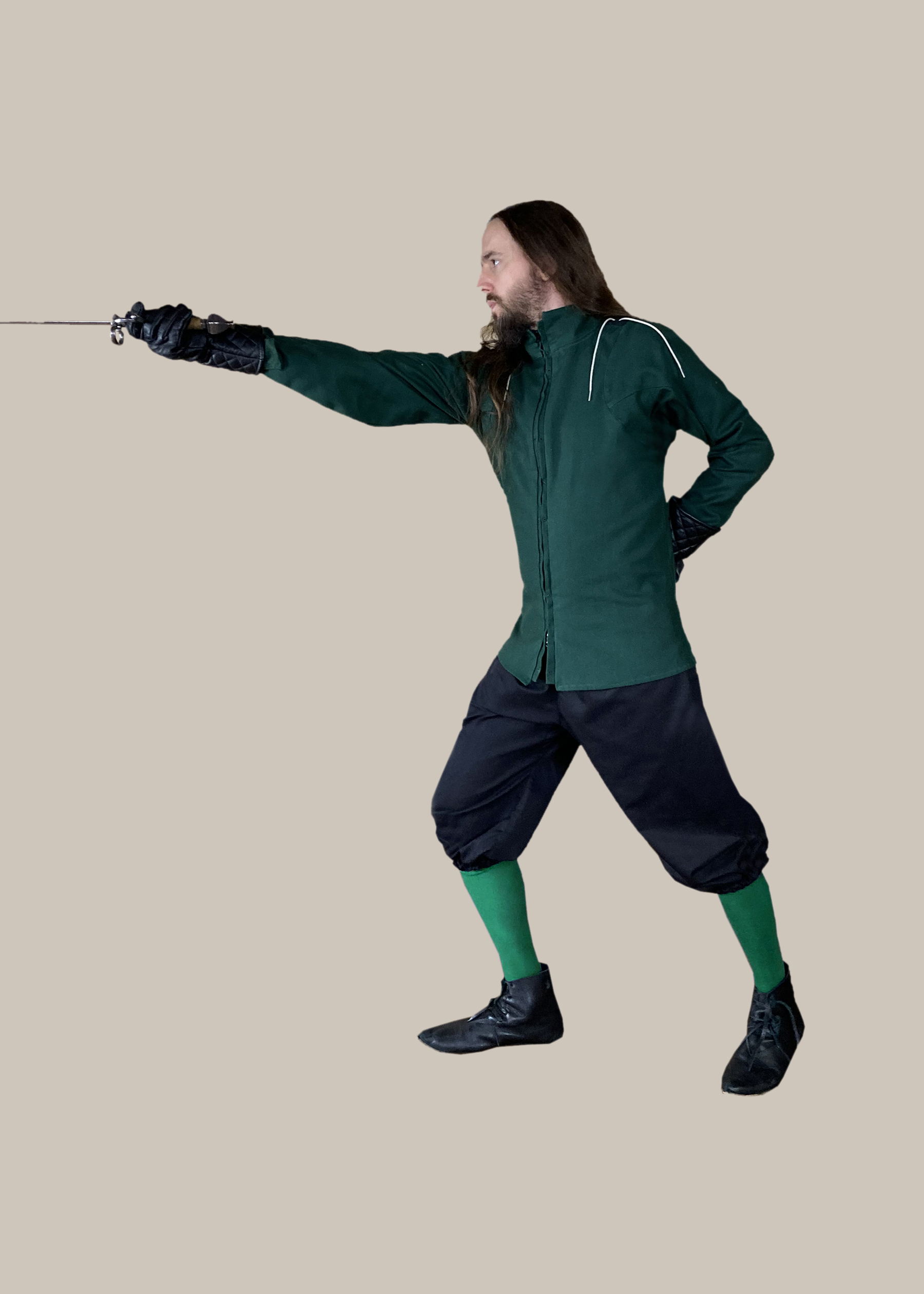 A confident fencer practices his forms in a dark green Premium Padded HEMA Jacket, a pair of Fencing Knickers, green Athletic Socks, and finishes the look with some black Medieval Tie Ankle Boots.