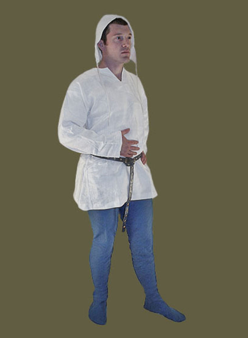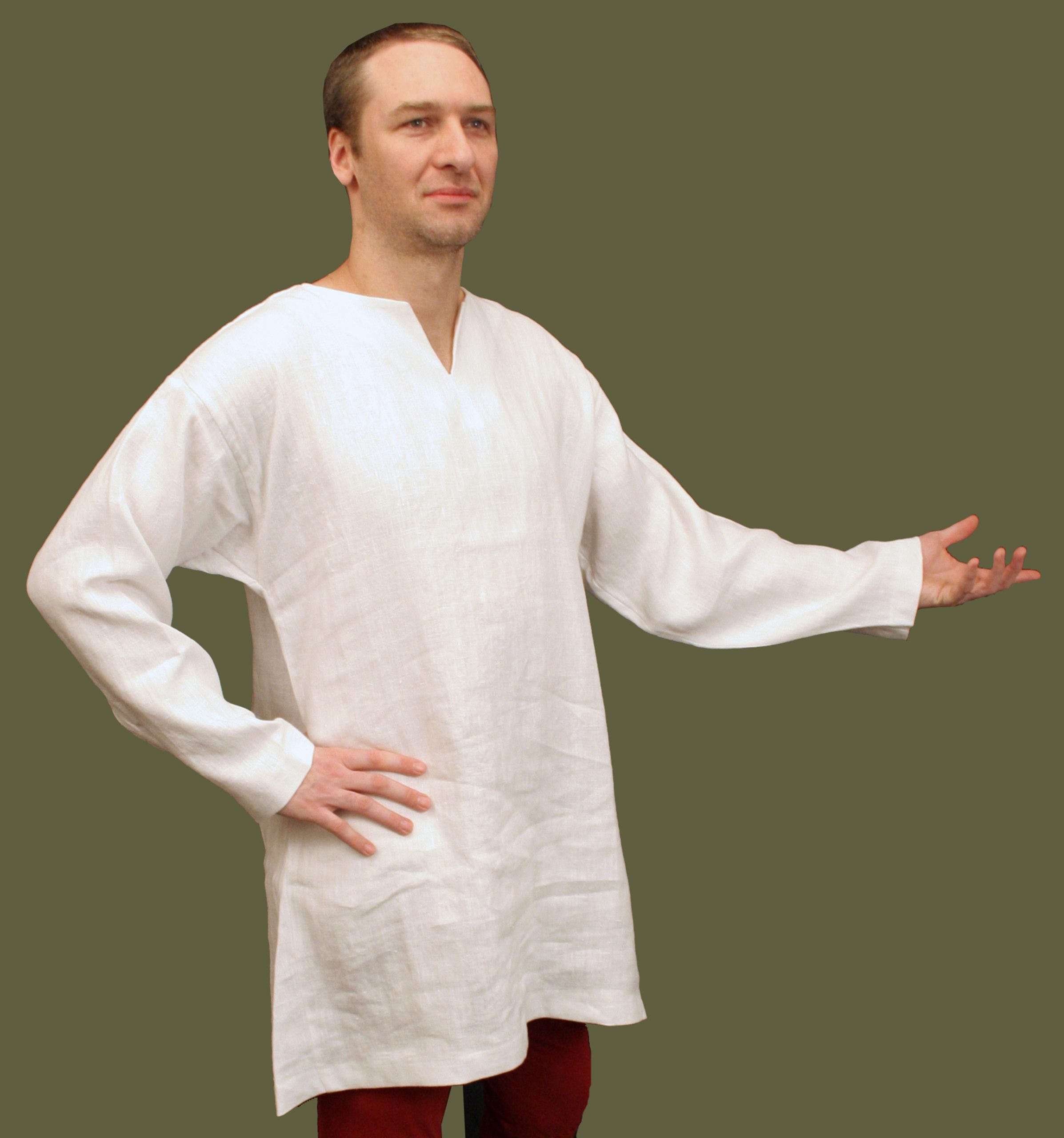 The shirt went through subtle, but important changes in the century that followed, as it evolved to conform to the new, closer-fitting outer garments of mens fashion. Beginning with the St. Louis shirt as a reference, we have based our shirt on contemporary artwork, to produce a garment that maintains all of the key elements of the period. Made of a heavy-weight, white linen, the body of the shirt is cut like that of the cotte and is specifically designed to be worn with it. The shirt has a keyhole neckline which can show from under the cotte and can be worn open or closed with a broach. Worn with chausses and braies, this ubiquitous shirt forms the foundational dress of medieval man, from duke to cotter.