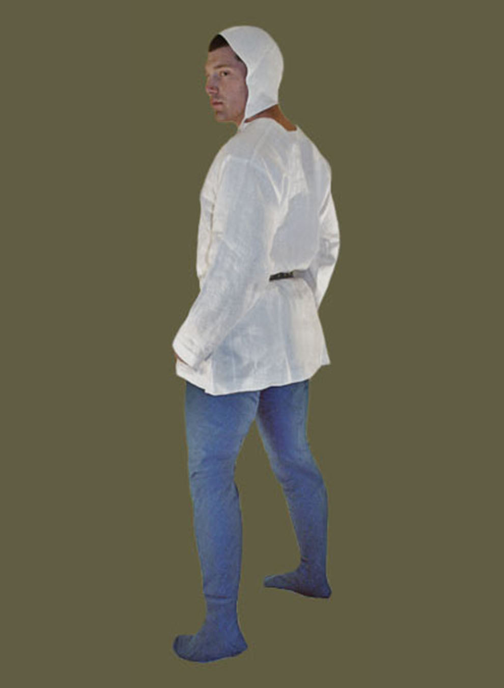 This peasant begins his morning with his basic underwear. Here he is pictured in his Coif, Linen Shirt, and blue linen Chauses. He fastens a Belt around his waist.