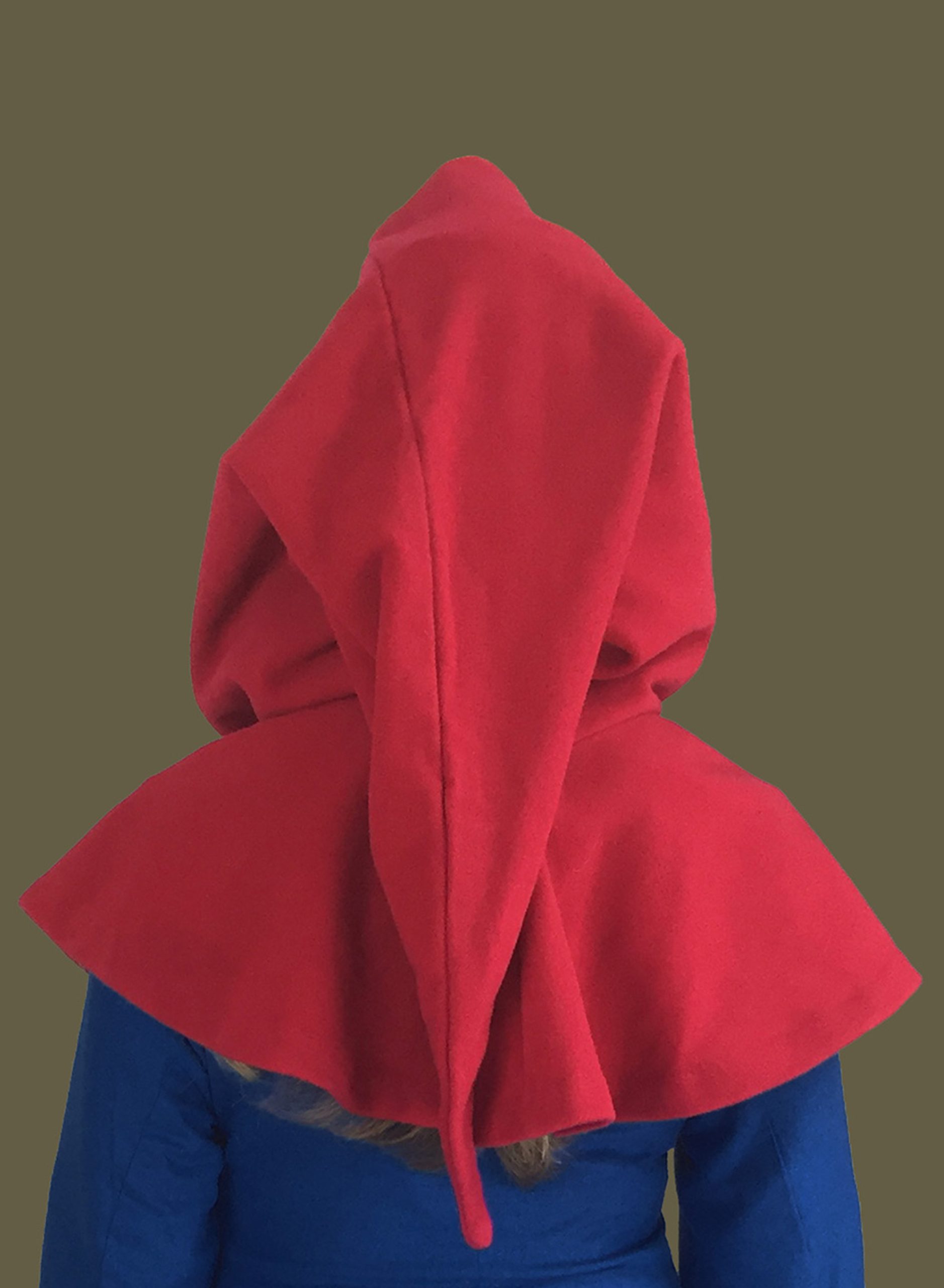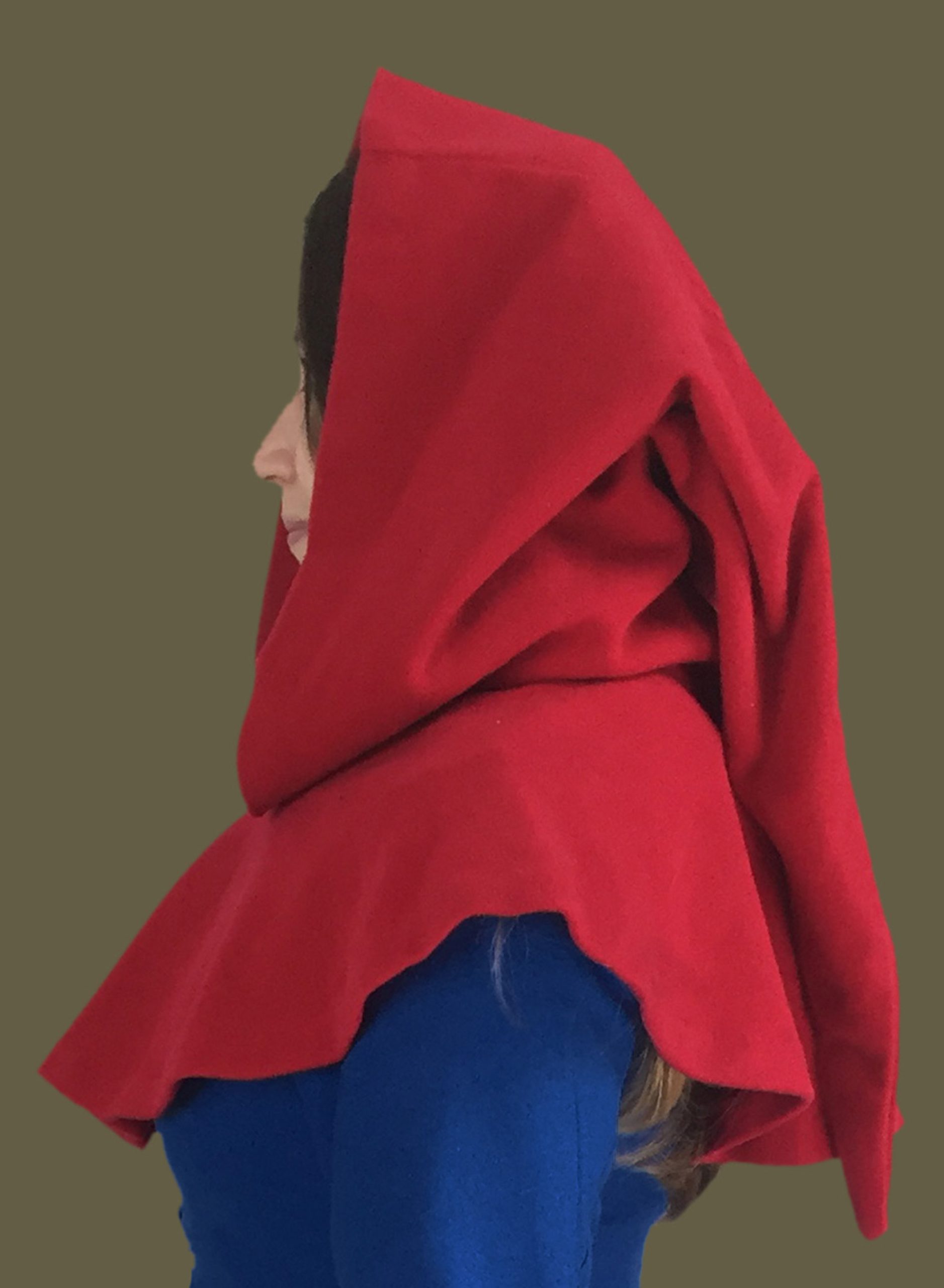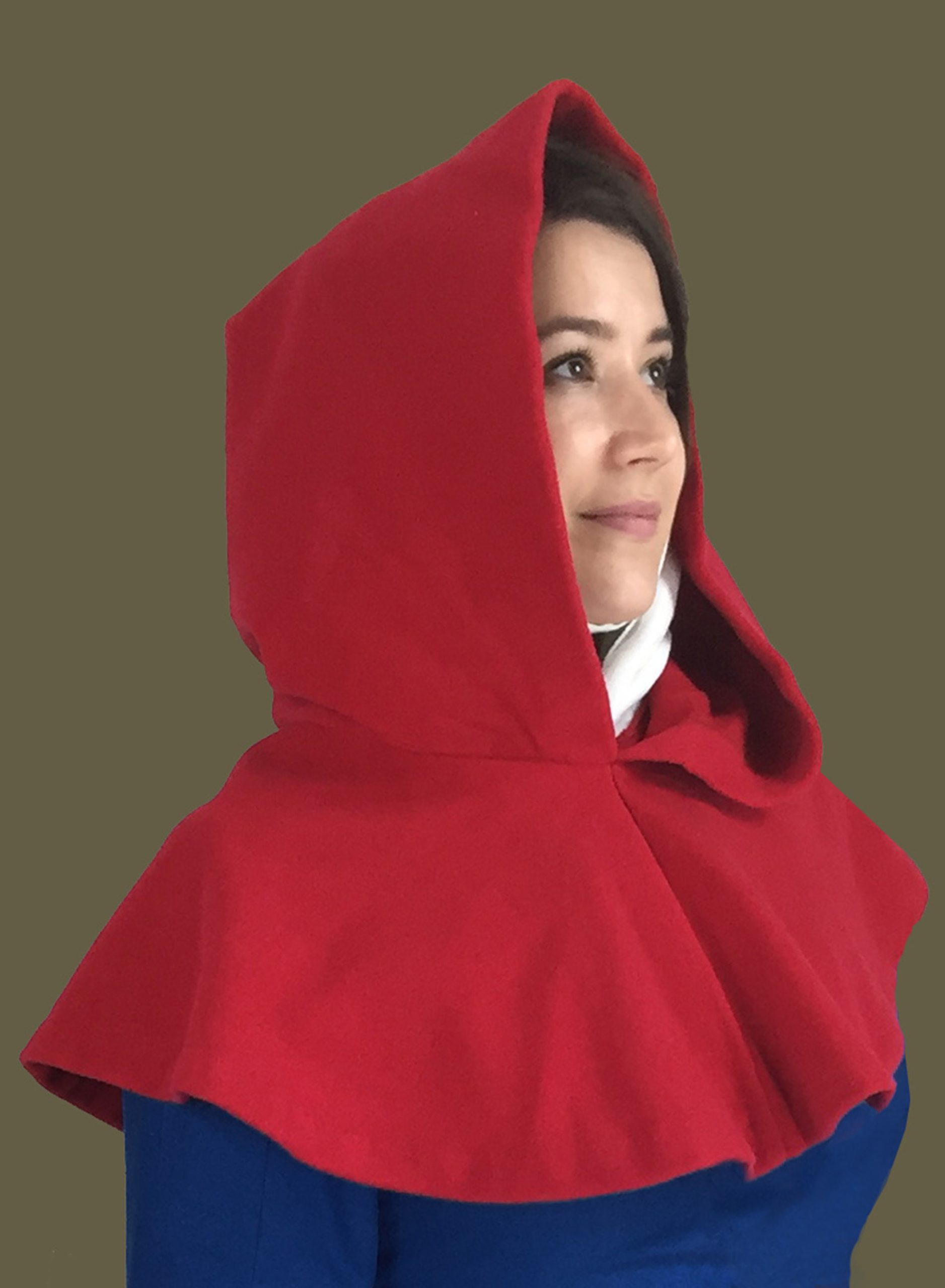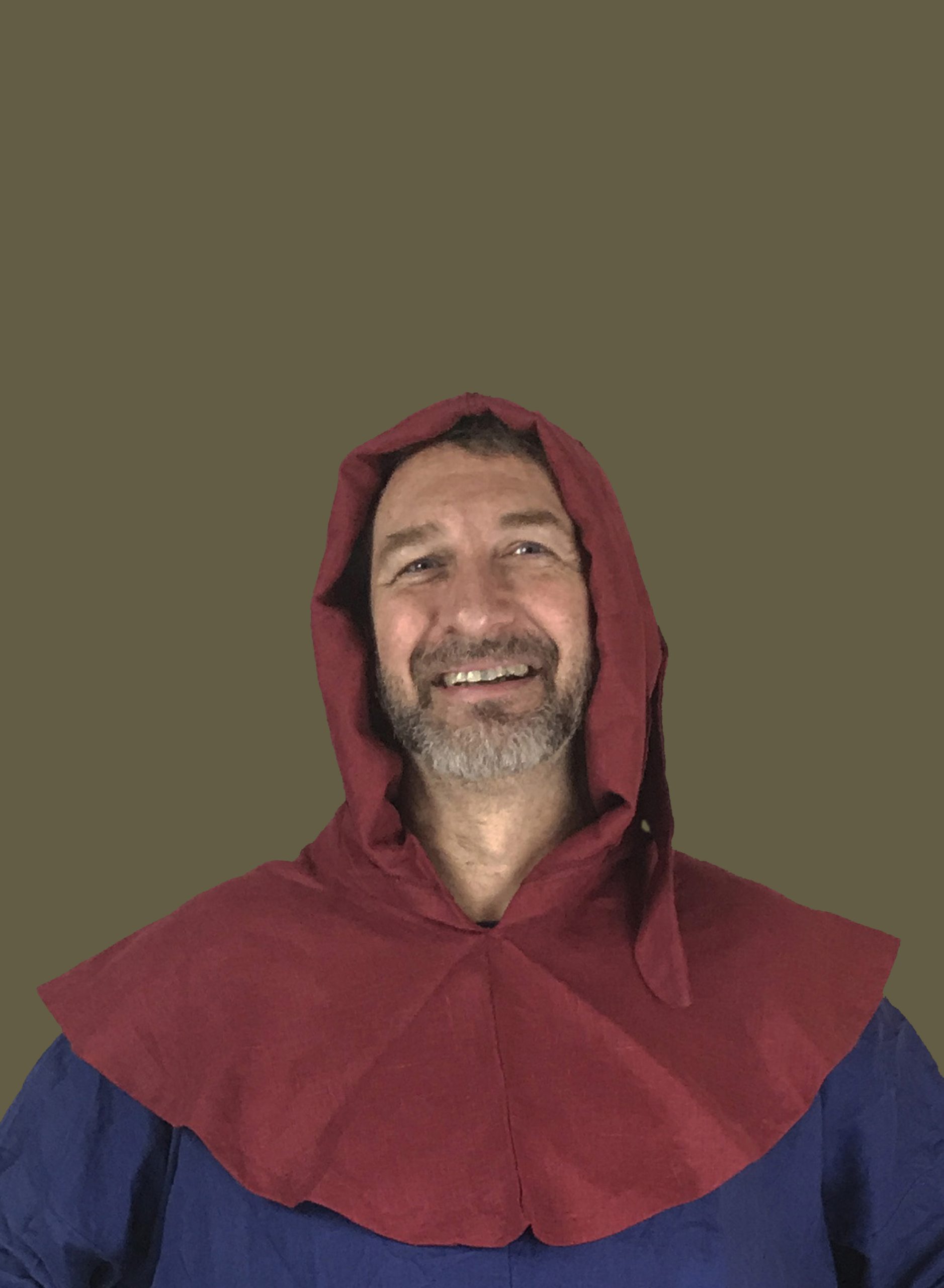 Head-coverings were a critical component of dress in the Middle Ages. Hoods were common with men and women of all classes, and came in a wide variety of forms: long tailed or liripipe, short-tailed, dagged or straight hems, either pull-over or with an open front that was buttoned or pinned closed. Only the sumptuousness of the fabric, elaborateness of the dagging, or extreme length of the tail distinguished the hood of a duke from that of a villein. Men wore their hoods alone or with a plain linen coif beneath or a hat over, while women seem to have worn the hoods alone or with a wimple. In general, the most extreme version of this style with the longest tail was typical in the mid to late fourteenth century while our short-tailed version is more typical of earlier fourteenth century portrayals. It is offered in a small selection of basic colors. Made of a linen blend this hood is joined in the front for the ease of pull-over wear and is a cool and authentic solution to keeping the sun at bay.