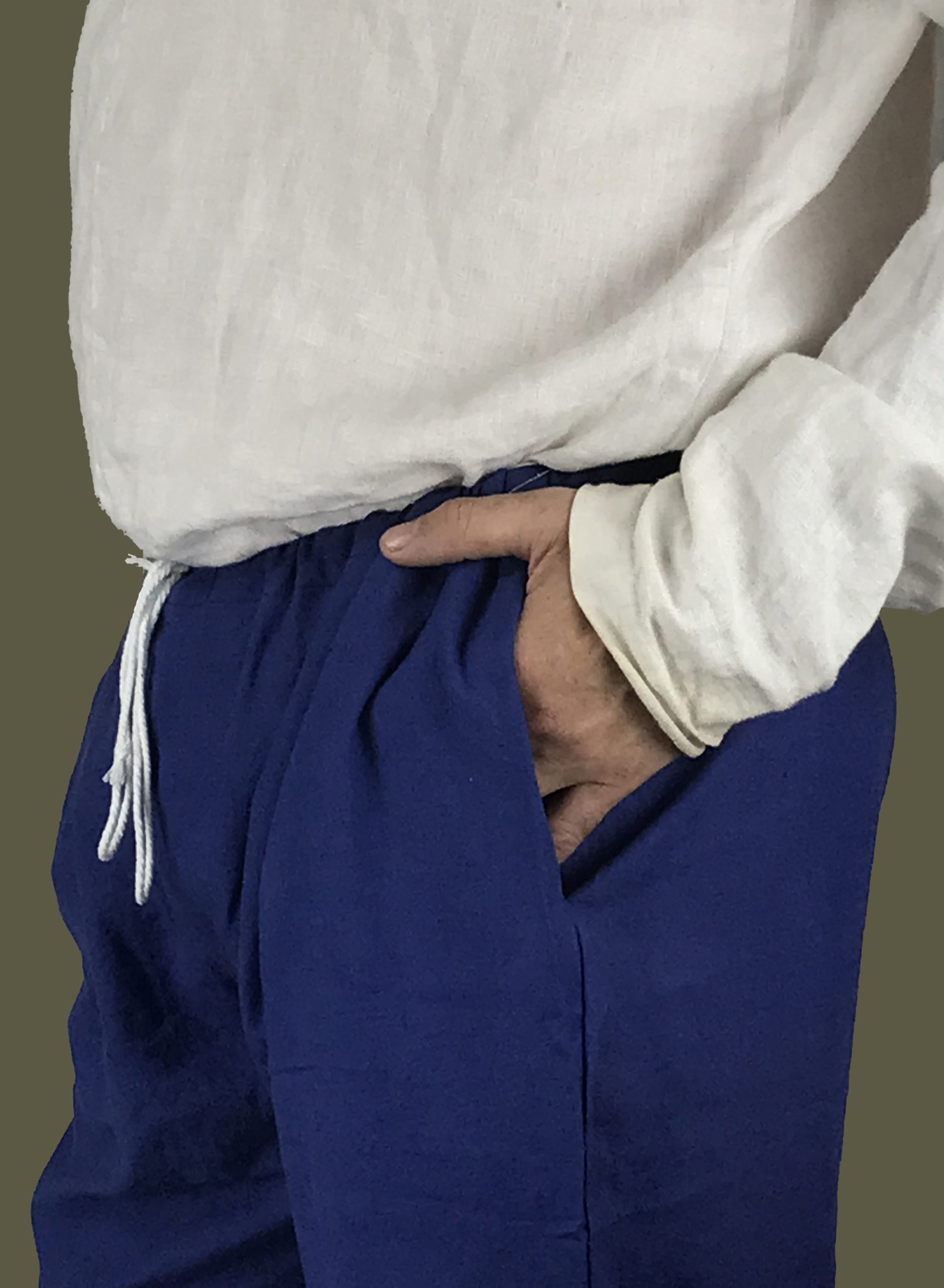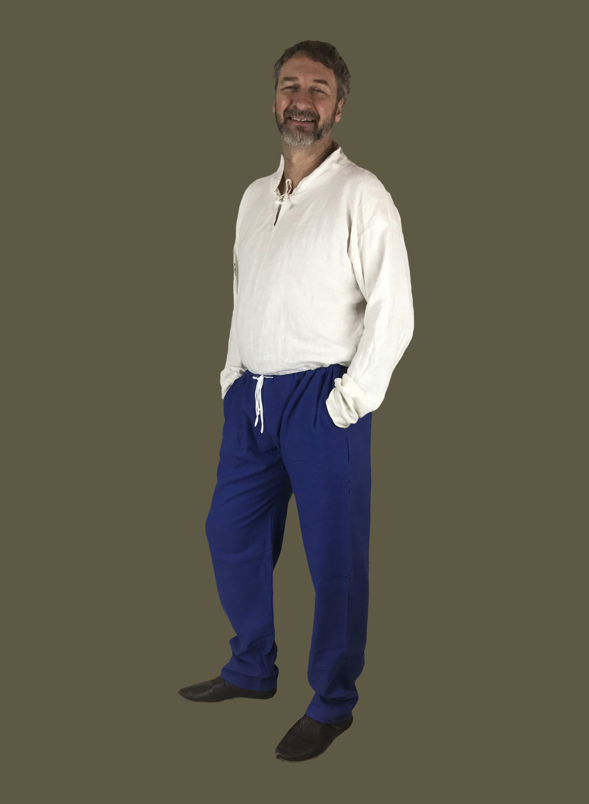 Don’t want to fuss with braies and chauses? Not brave enough for hose? Then these basic medieval pants are for you! These basic medieval pants are a common style that can be worn for a variety of different time periods and cultures. They feature a drawstring waist, pockets and a gusseted crotch for freedom of movement. They are made to be loose and comfortable like pajama pants. These basic medieval pants will help to bring a comfortable fit, and authentic look to your ensemble. One size fits most.