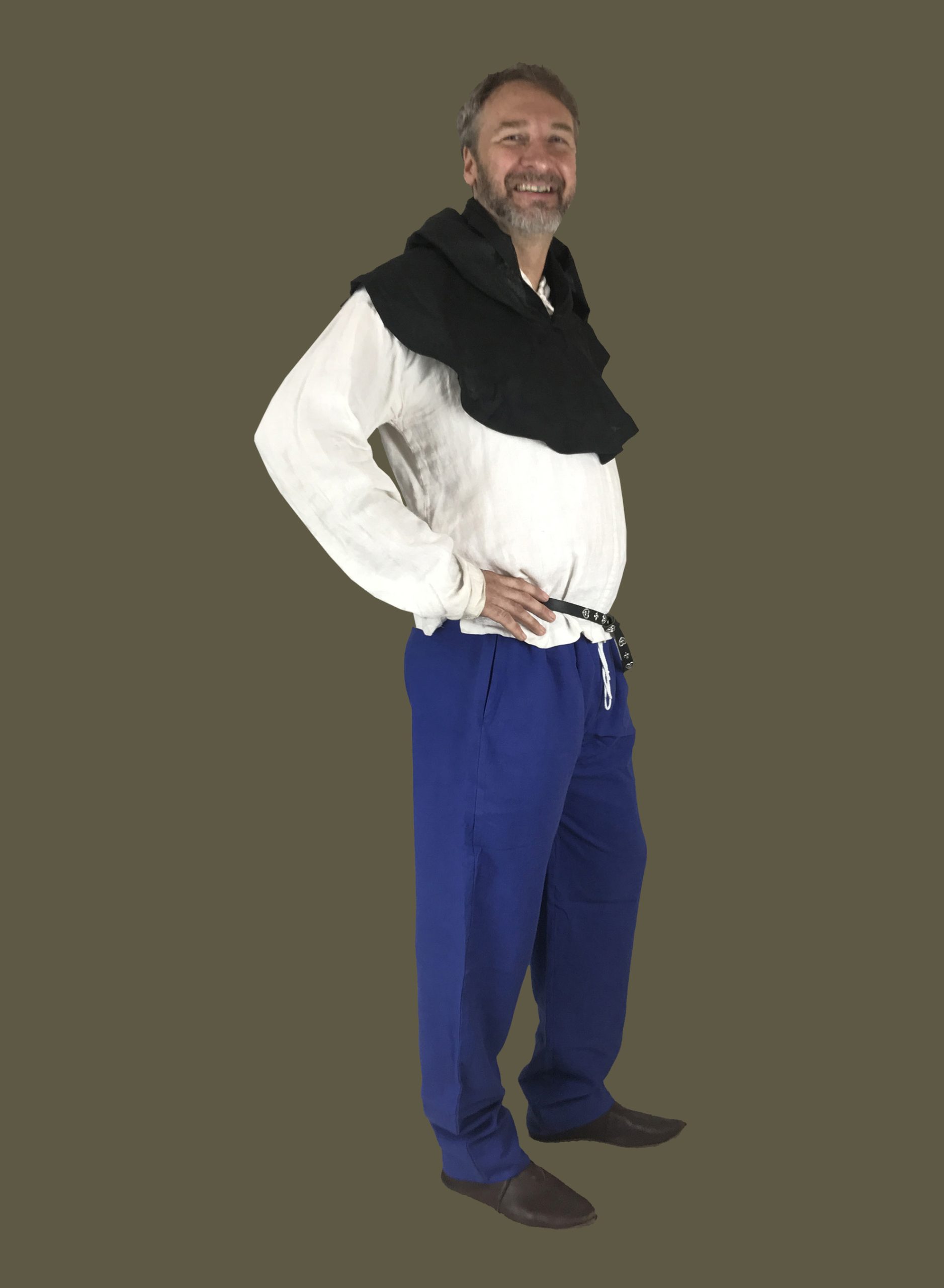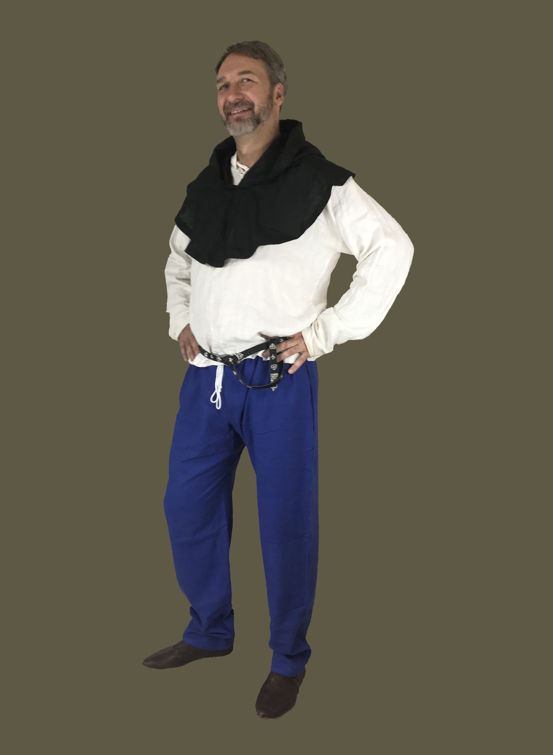 This gentleman is comfortably attired in his 15th C Collared Shirt, and blue Basics Pants. He dons Ankle Boots