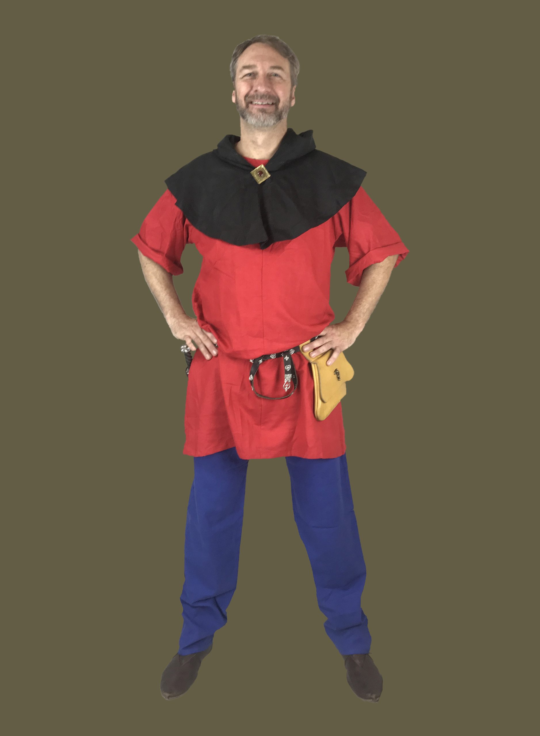 This peasant wears a red Basics Short Sleeved Tunic along with his black Basics hood. He finished off his very simple look with a black Decorated Belt, and Ankle Boots , and Brooch .