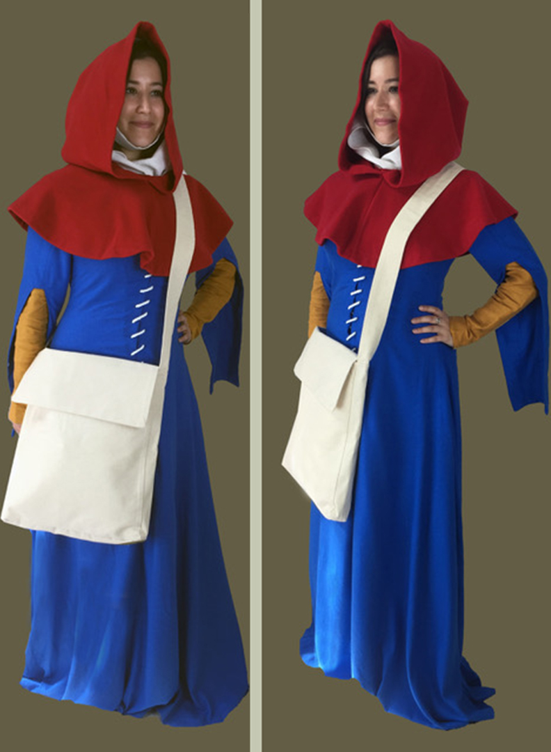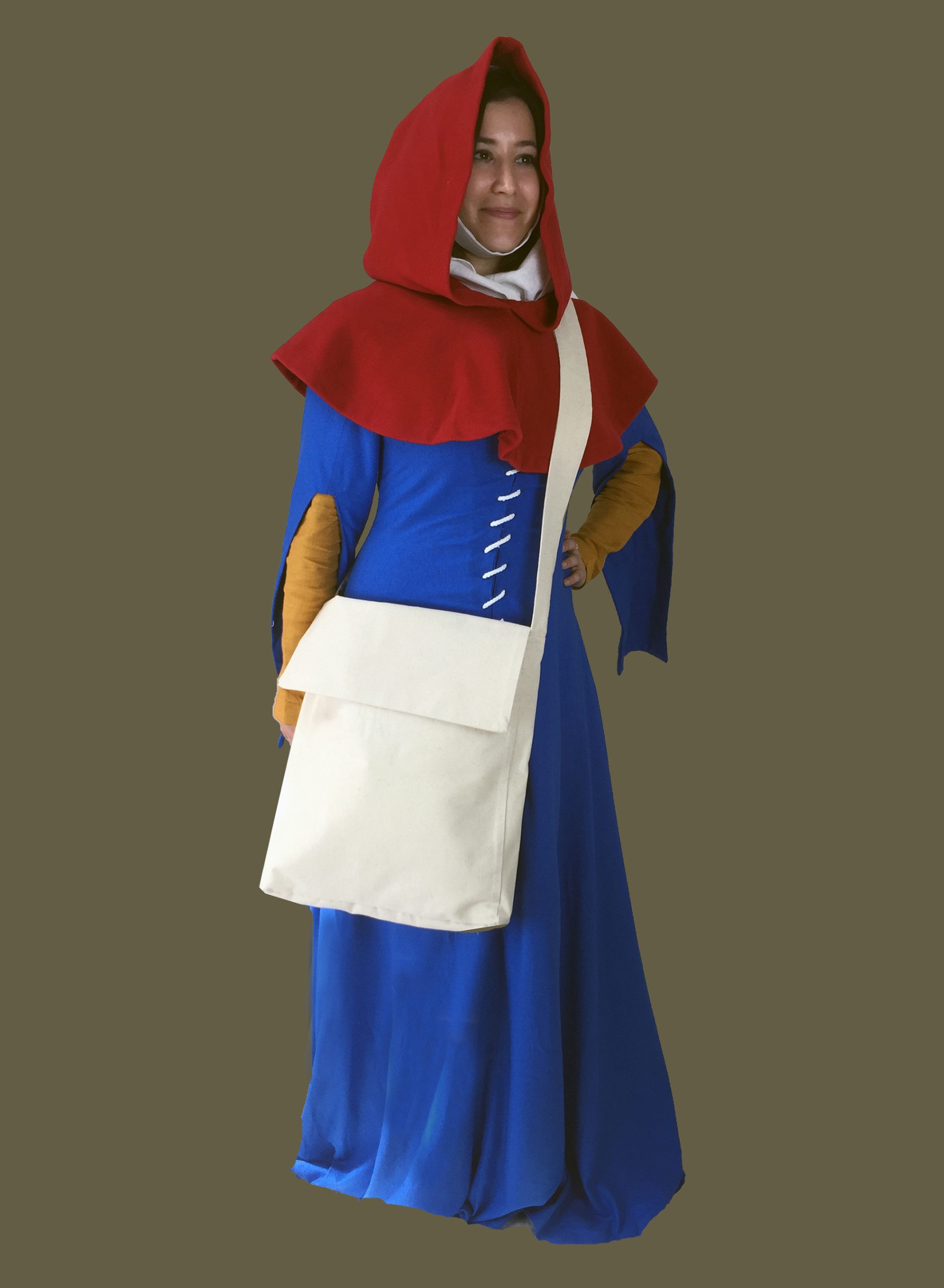 Our Market Bag with our Frontlace Gown, Kirtle, Wimple, Wool Short Tail Hood
