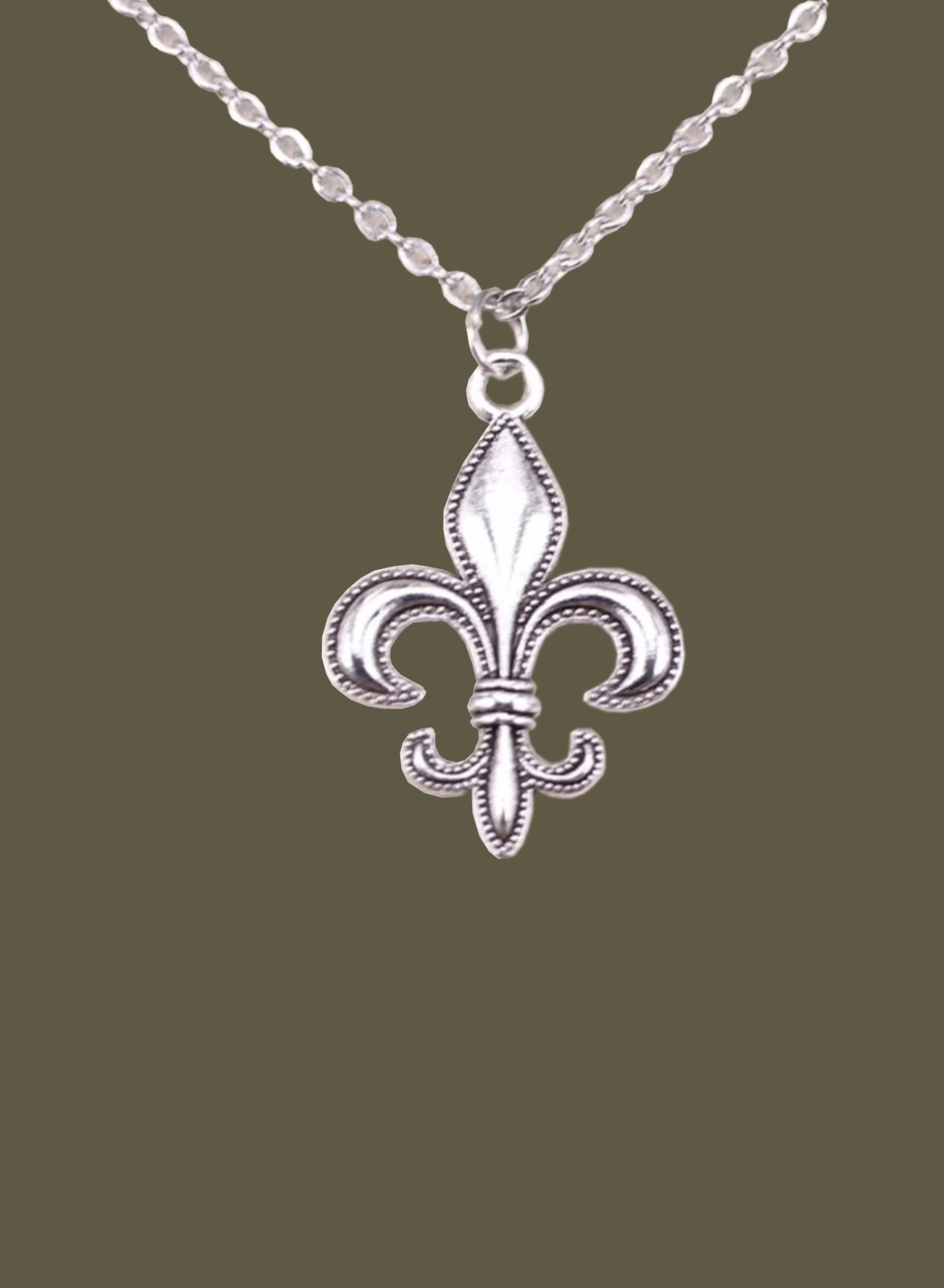 Our Fleur de Lis Pendant is antiqued silver color. 18″ chain with clasp included. A bit over 1″