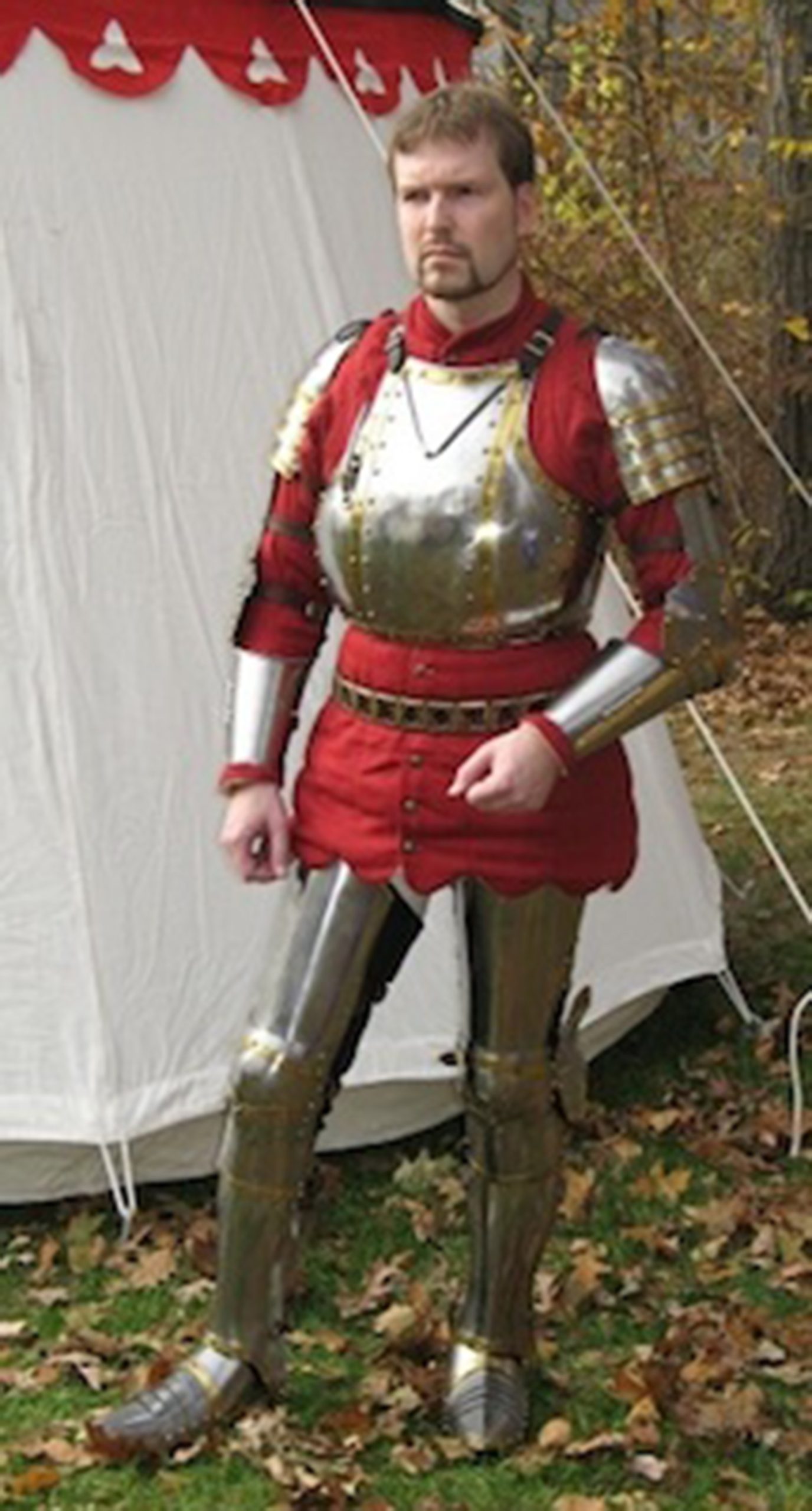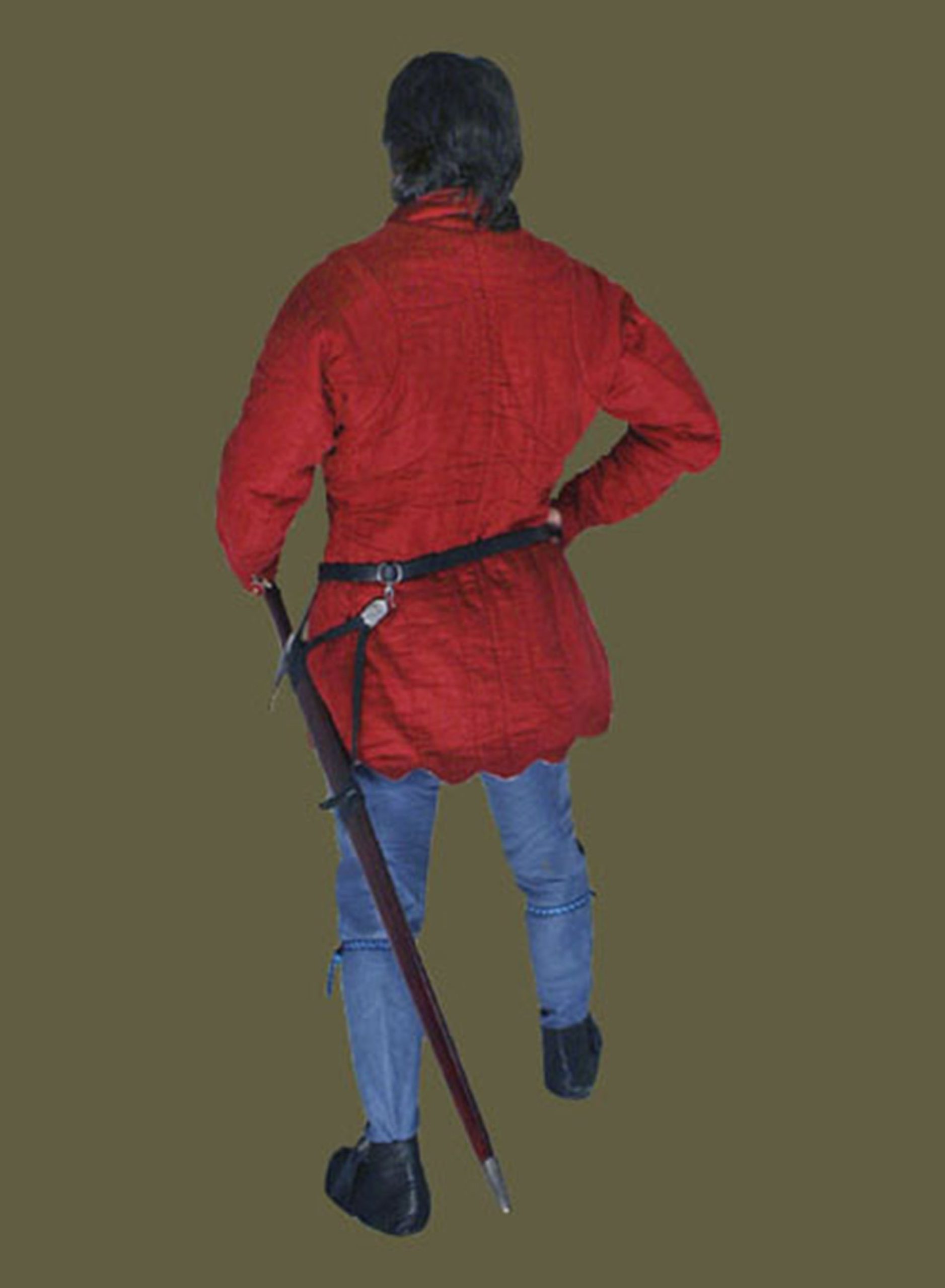 Its closely cut arms make it well suited for use with fitted arm harness. Taking inspiration from period garment quilting designs, we have added a collar for additional comfort. Metal shank buttons are used similar to those used in period.