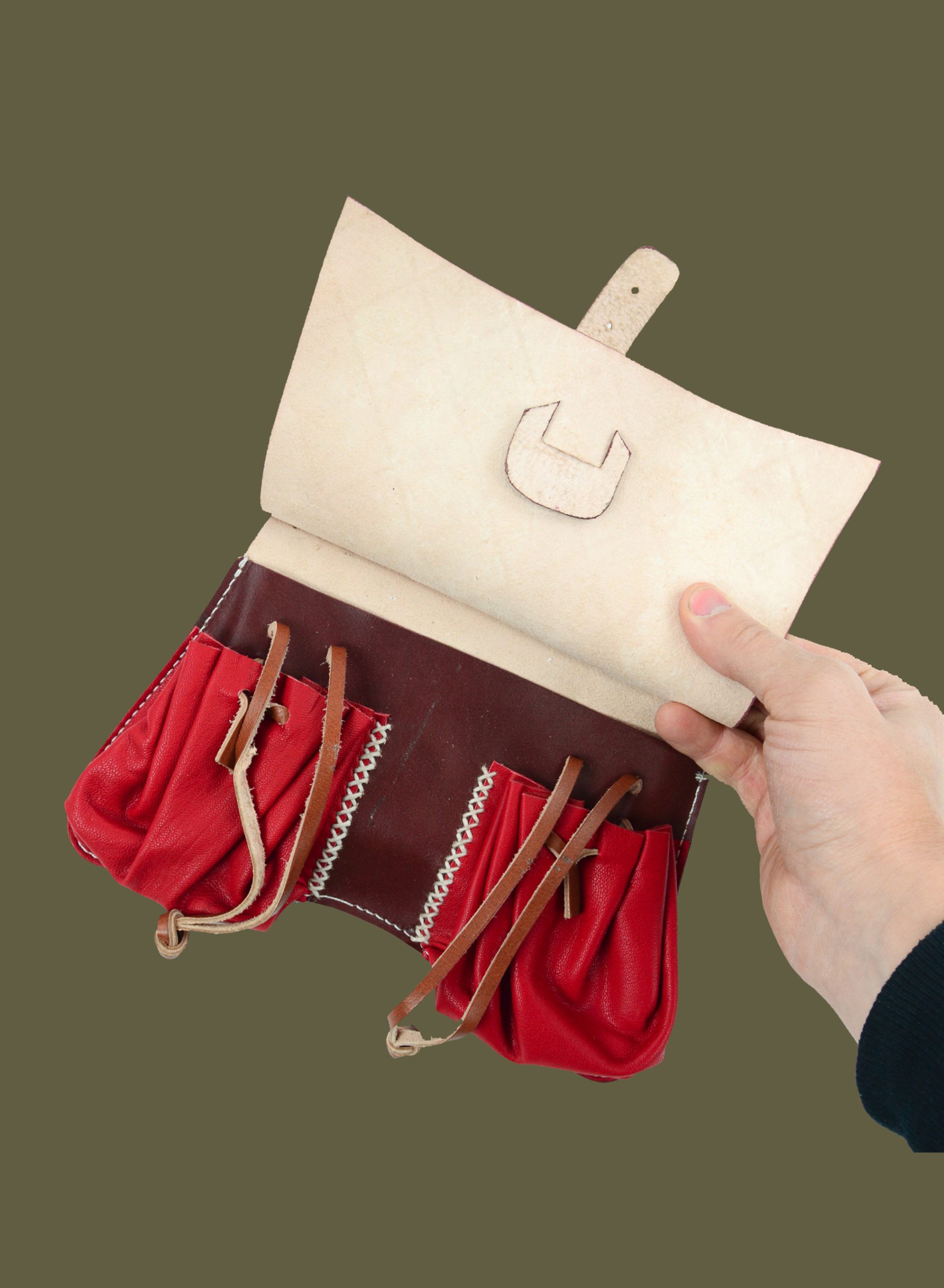 Based on designs from the 14th and 15th century, our 3-in-1 pouch has a flap embossed with diagonal tiled grid design, a larger main compartment and smaller front pouches that are closed with a fitted cord. It is secured with a brass buckle. It made in combination of dark and bright red leather. This detailed pouch is the perfect way to take your medieval look to the next level.