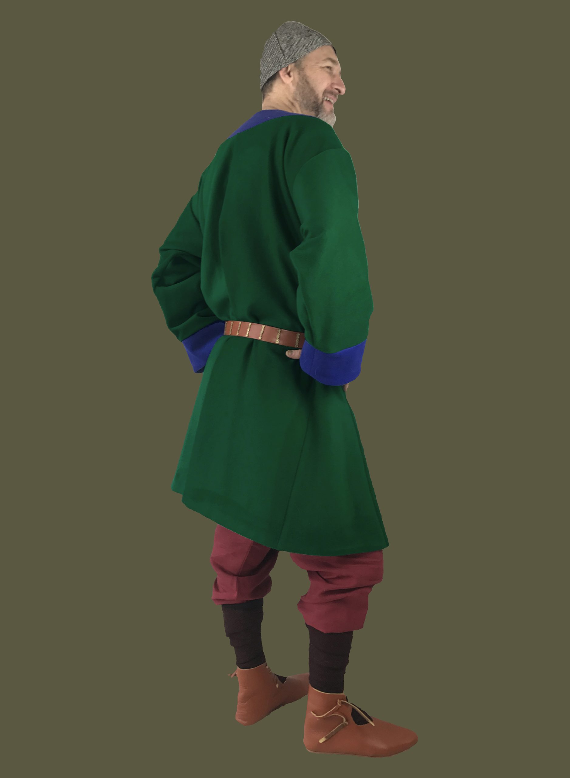 This Viking stands with his hands on his hips in his green wool Viking Coat, wool Tunic, and burgundy Pants. He wraps his legs with brown wool Leg Wraps and tucks them into his Viking Boots. He cinches his waist with a tan Viking Belt