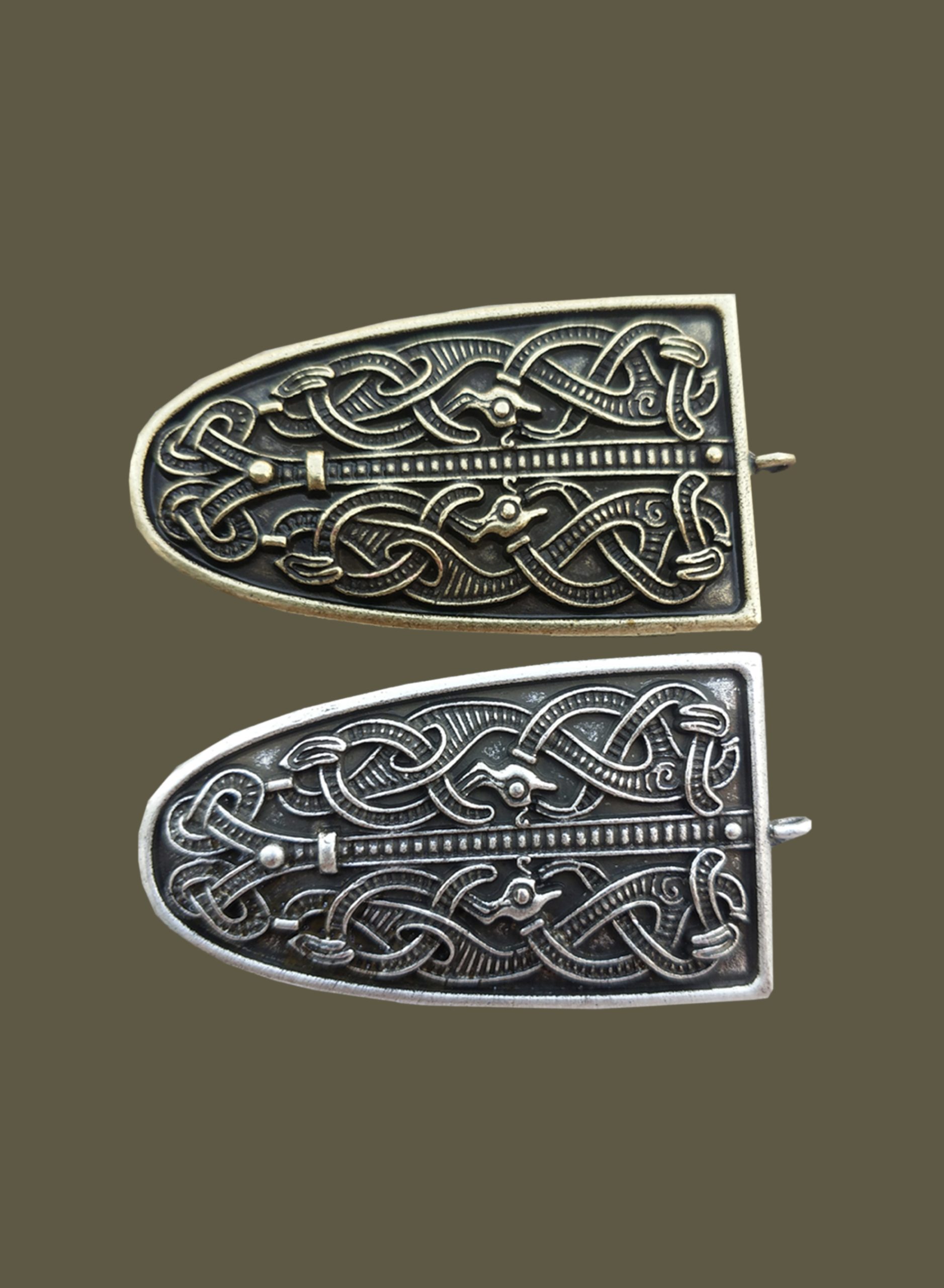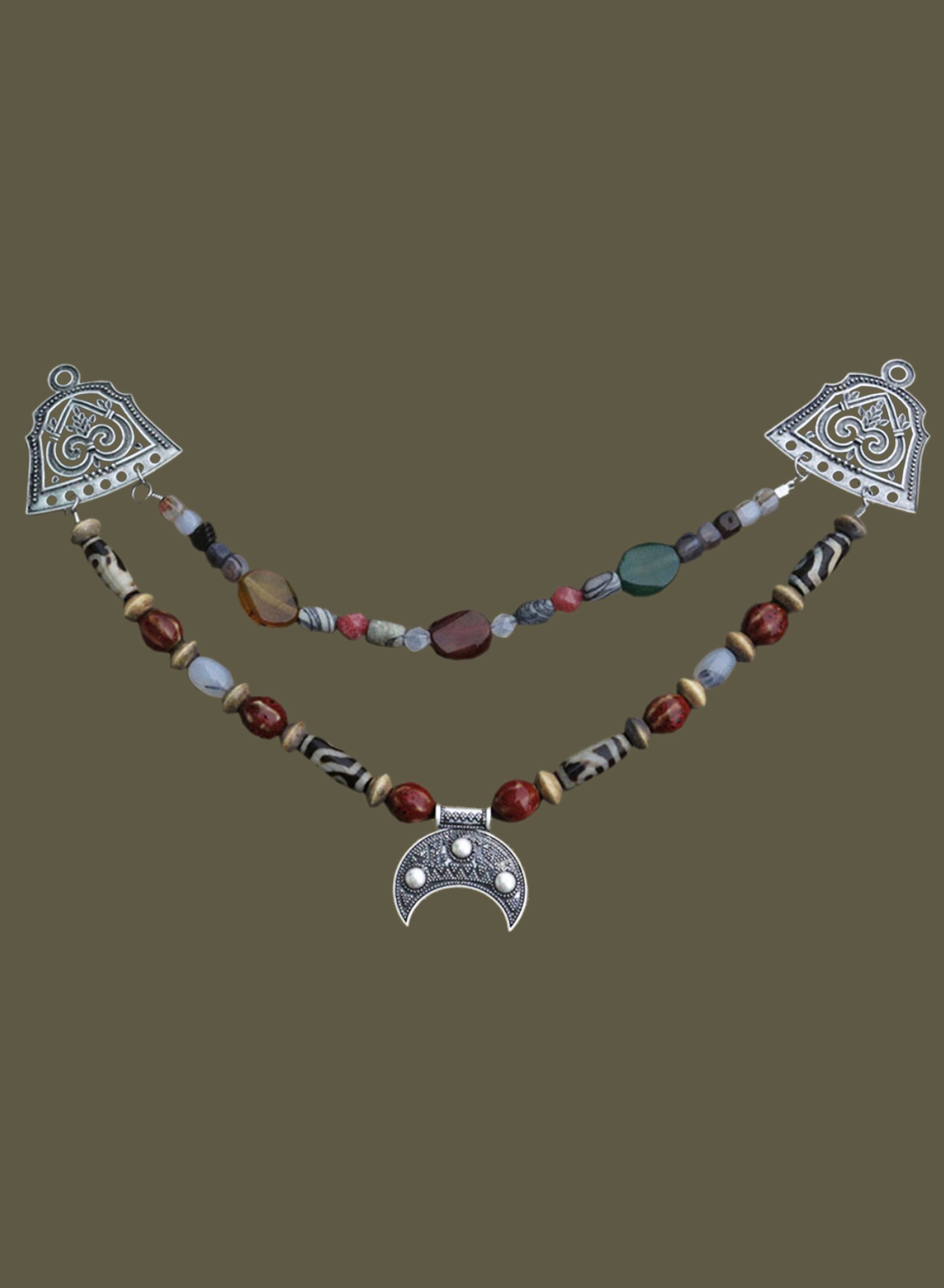 Viking Women were renown for wearing their wealth on their person. Our Viking Chain Brooch Finials are just what you need to make your own viking chain to adorn your apron dress. They include a pin back so all you need to create your own custom chain are the beads to string between them. Below are pictured our pre-made examples; three strand beaded chain is the most lavish example of dress decoration of the period, we also offer a 2 strand version. You can also attach these pre-made chains to the finial brooches.
