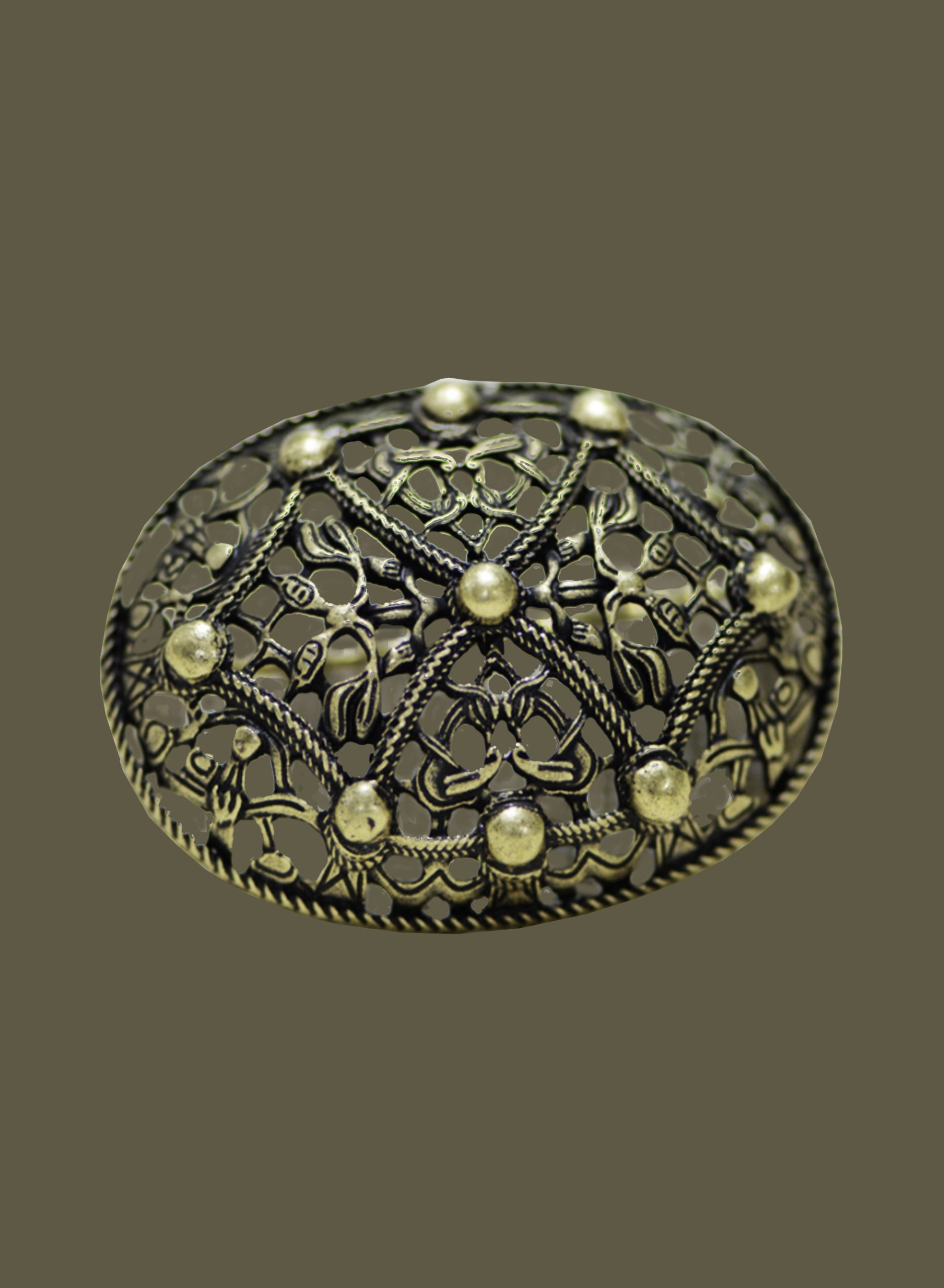 Sold individually or as a pair, the Large Oval Knobbed Brooch features a unique knotwork design accented with nine roundels. The large size makes this a striking statement piece for your early period portrayal. Available in bronze color with a modern pin back closure. They are perfect to decorate your Apron Dress, Viking Coat or Tunic, Cloak and more. 2.5″ long.