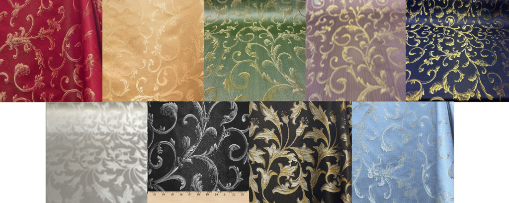 Burgundy w/ Gold, Gold w/ Burgundy, Blue w/off-white, Off-white w/ Blue, Gold on Gold, Gold w/ Dark Gold, Chocolate w/ Cream