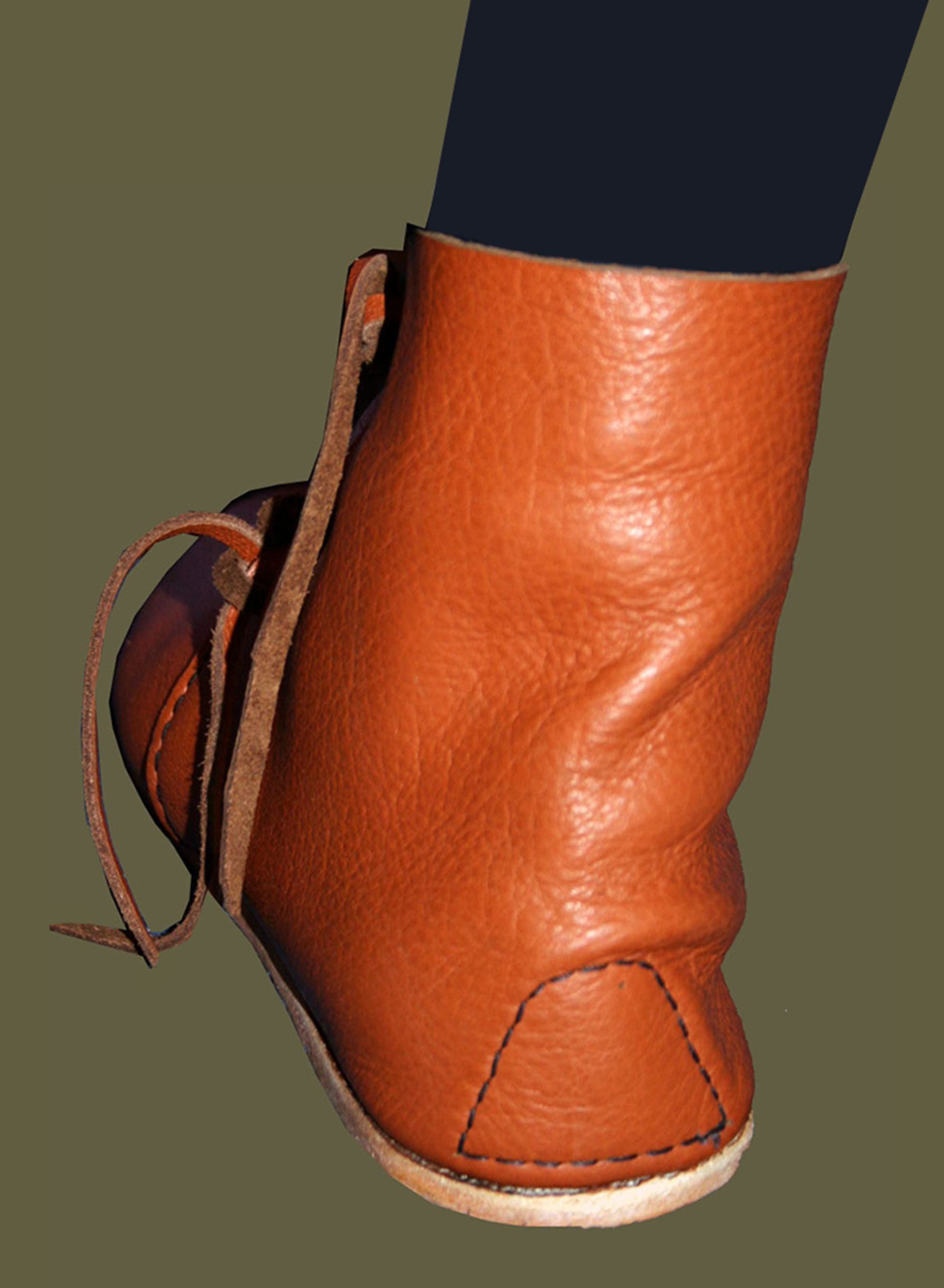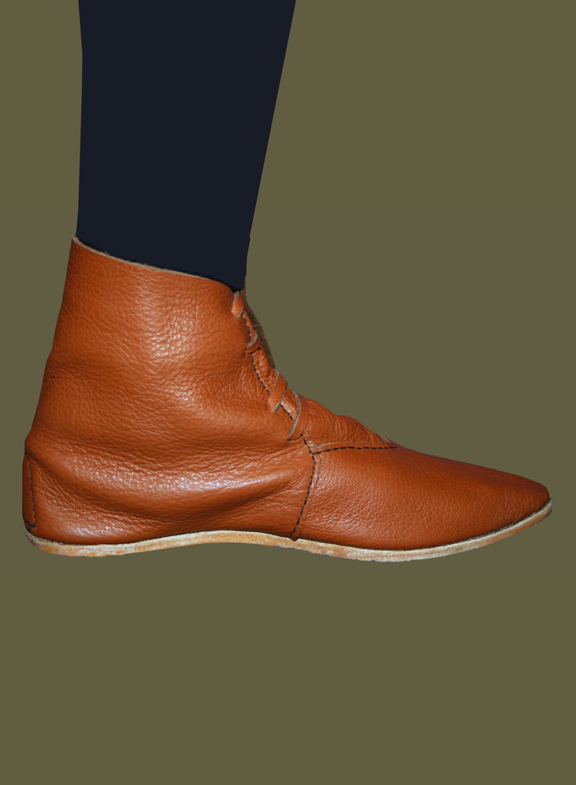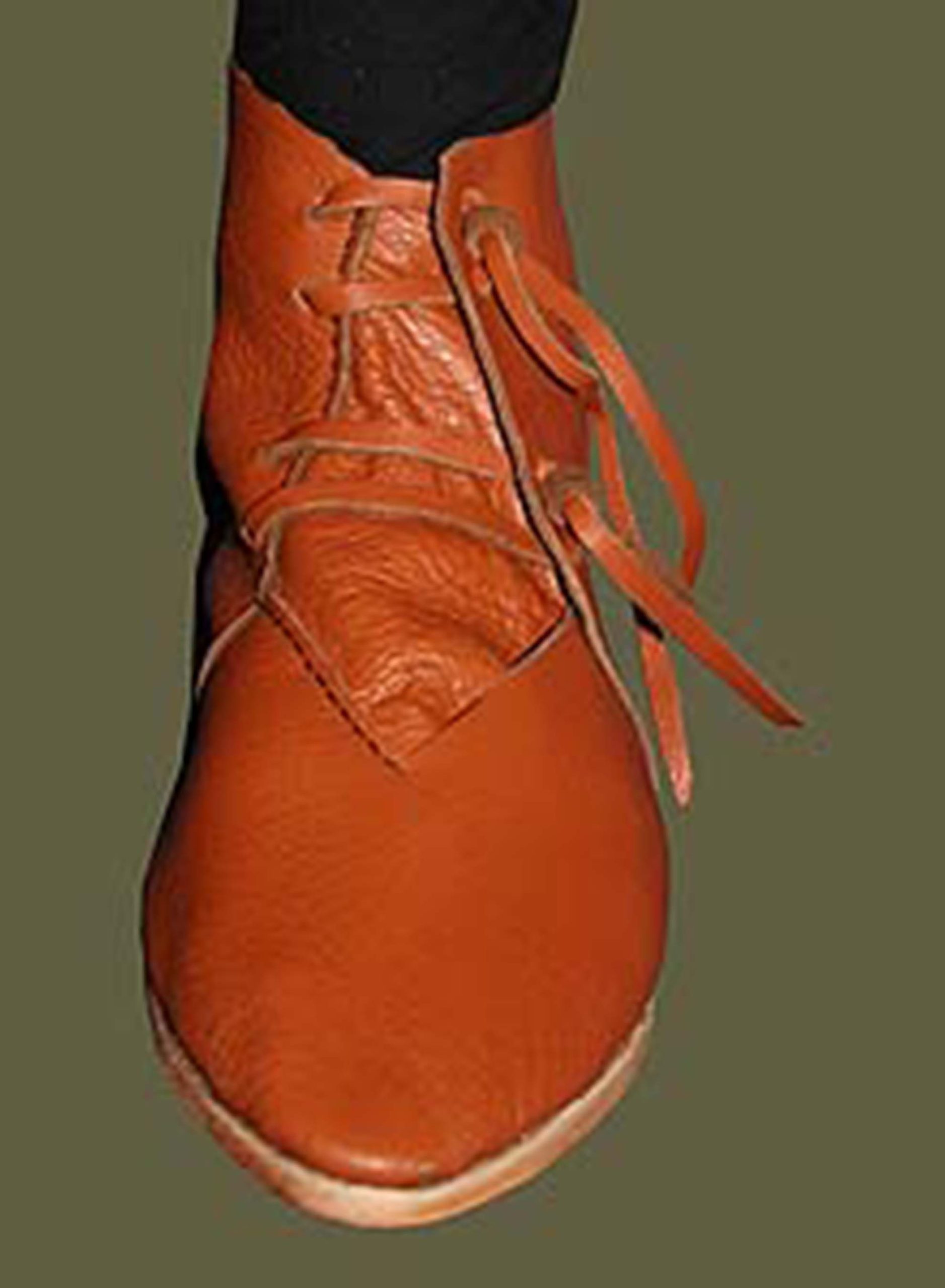 Our tied ankle boot takes its inspiration from 13th-14th century boots found in central Europe, particularly drawing on examples excavated in Germany, and dated to c.1300 – 1325. We chose this example because it is similar to numerous surviving examples found throughout Western and Central Europe. Although laced-ankle boots are a popular item to reconstruct, we have made a point to pay particular attention to the shape of the toe. This “neither rounded nor pointed, but somewhere between” toe, with no visible seam or fold at the tip, is a defining trait of surviving examples, and many off-the-rack reconstructions often fail to replicate it properly.