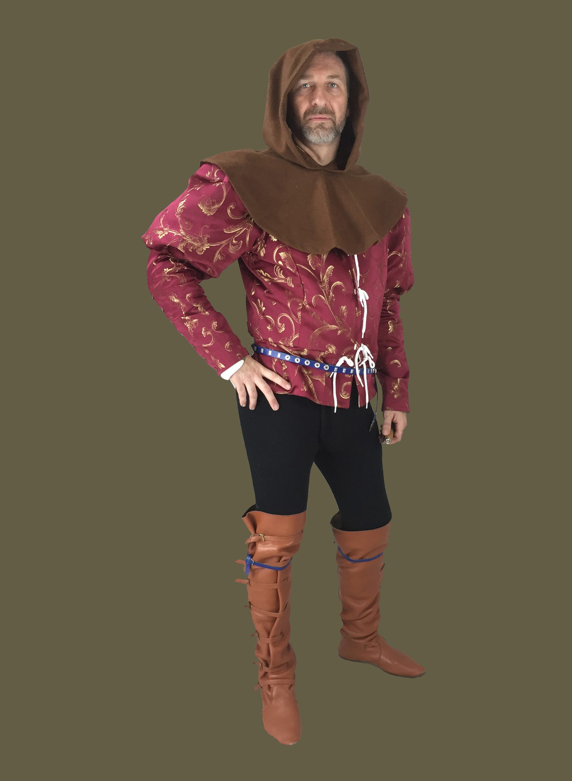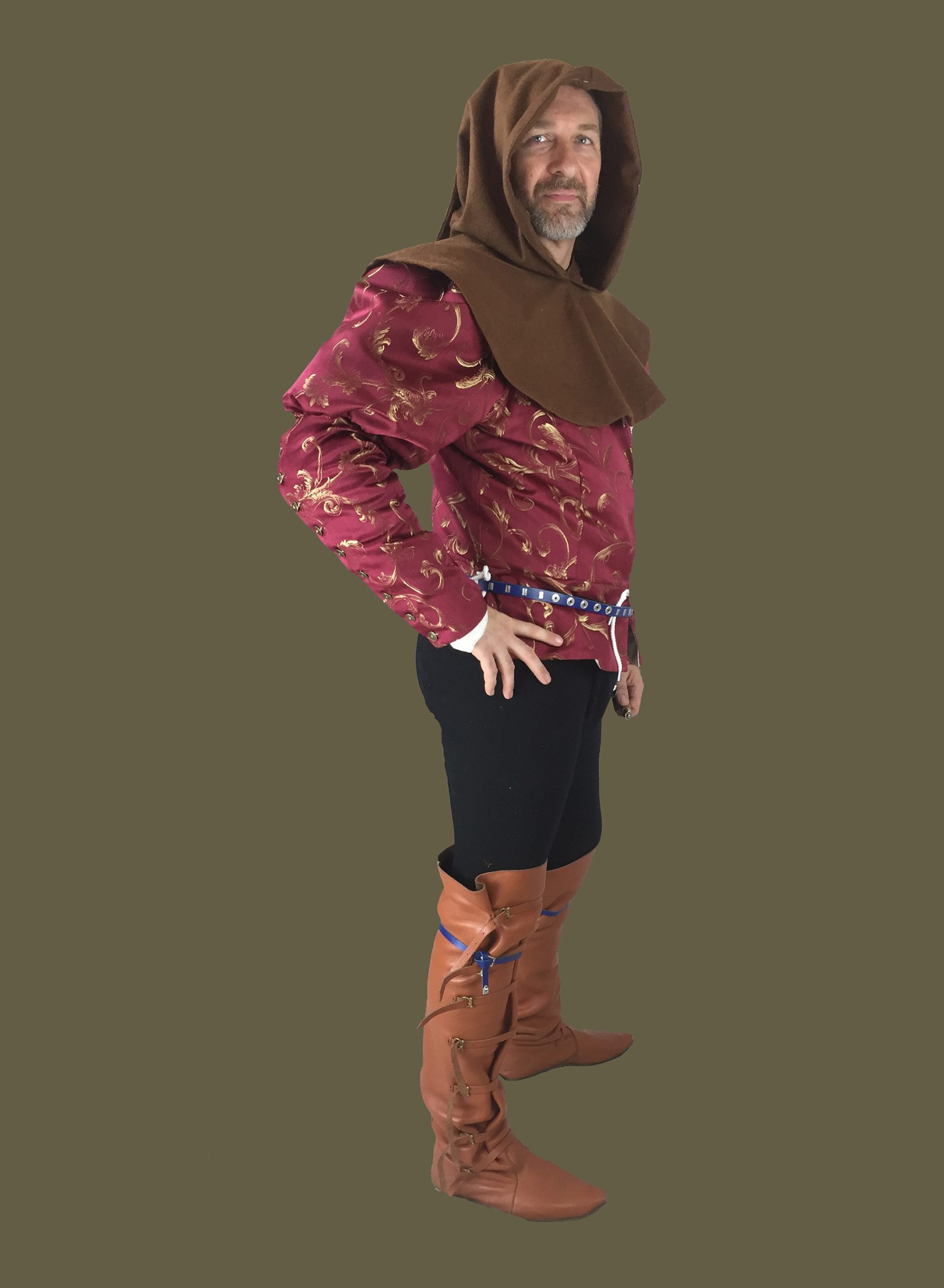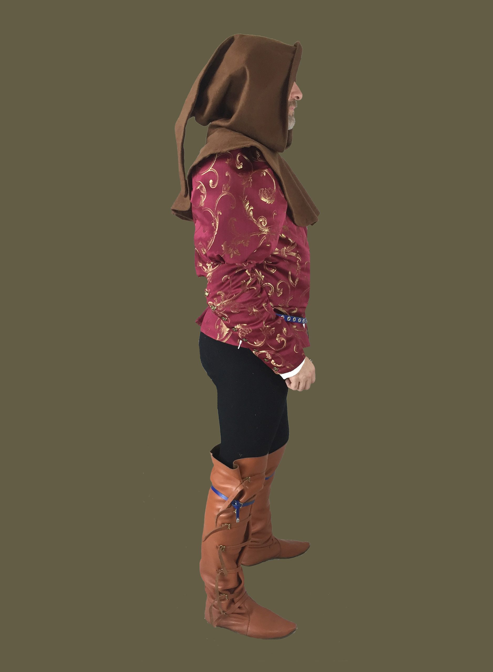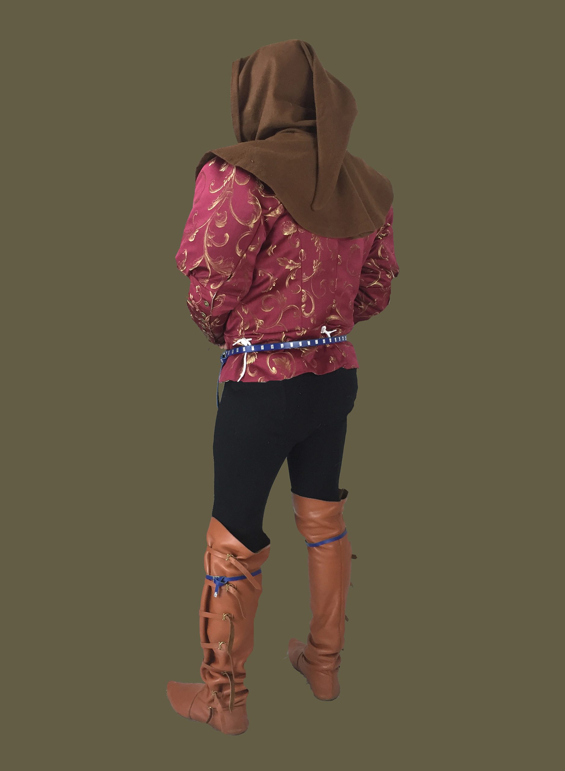 At last, a proper 14th century tall boot! Tall boots appear artistically for the first time in the second half of the 14th century as part of the “working wardrobe” of huntsmen. By the end of the century, the had been adopted by the nobility for wearing on the hunt themselves. The boots continued to grow taller, as the cotehardie/doublet grew shorter, until they became a popular fashion for well-dressed men at court in the early decades of the 15th century and throughout the next century.