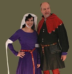These authentic coordinating medieval outfits for Bride and Groom in 100% silk are currently featured in Renaissance Magazine’s 2008 wedding issue. Her gown is backlaced