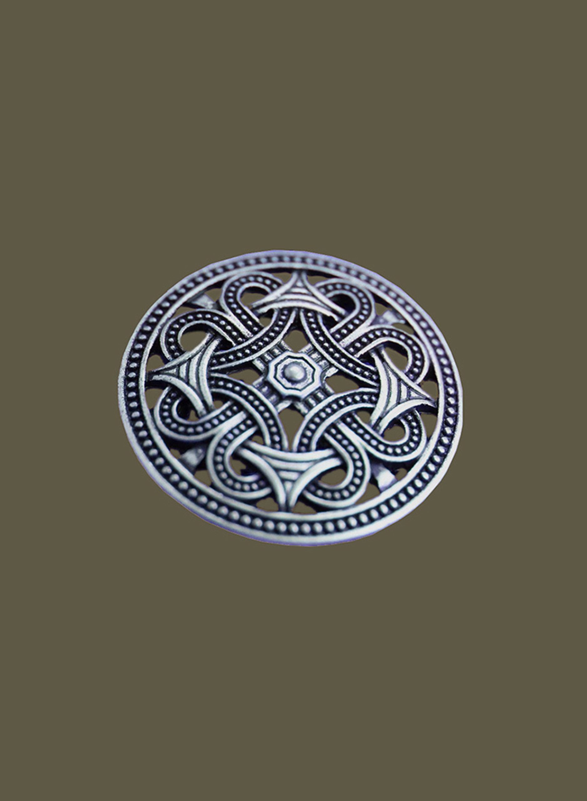 Sold individually or as a pair, the Small Round Knotwork Brooch features an open knot work design. They are made of pewter and have a modern pin back closure. They are perfect to secure an Apron Dress, Chitons, Viking Coats, Cloaks and more. 1.5″ long.