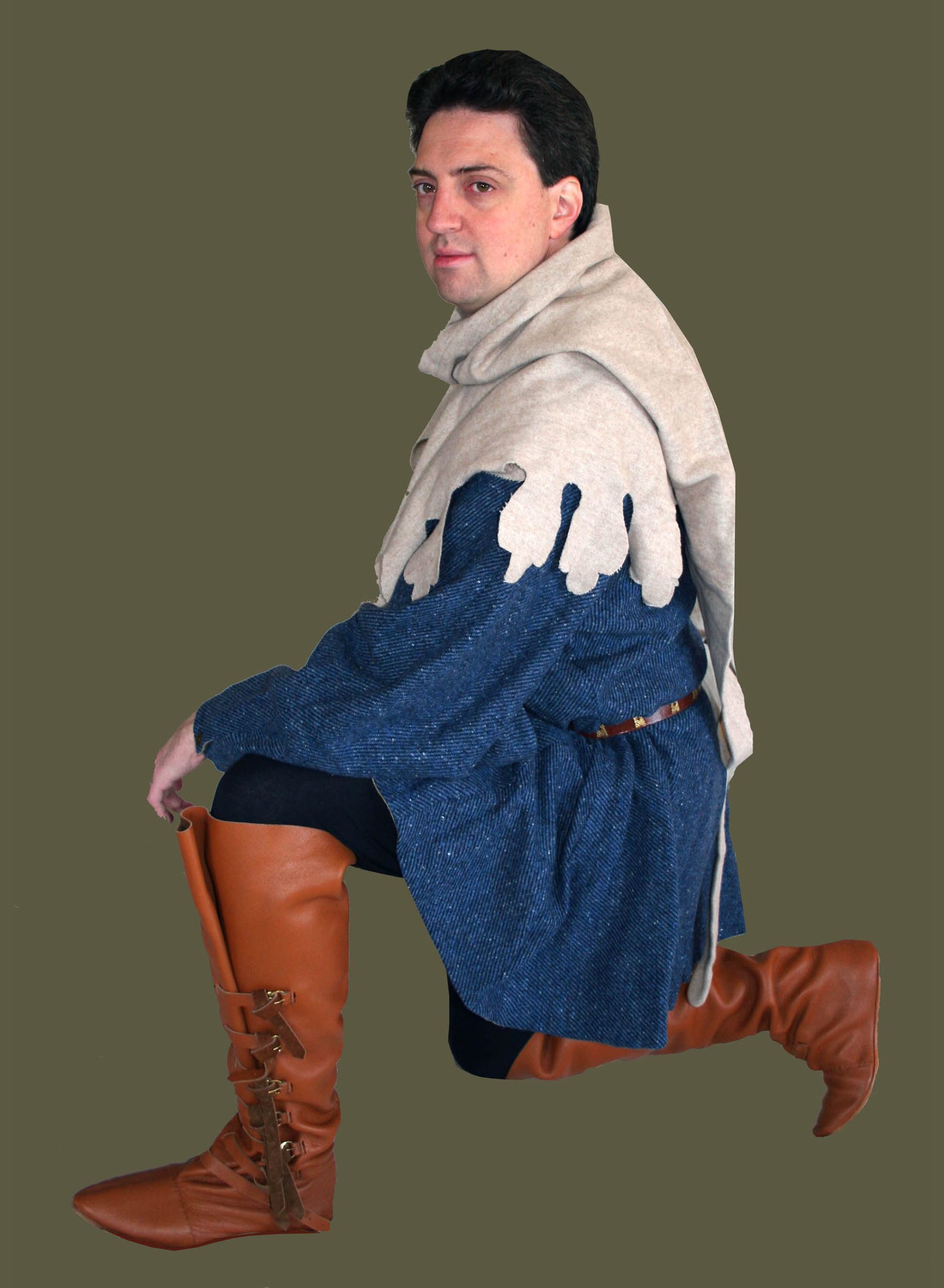This lord sports one of our black wool dagged hoods over sharp red linen Cotte with a complimentary pair of gold linen Chauses. Underneath he wears a medieval shirt and a pair of 14th c. braies. he completes the set with a Quatra-bar decorated belt around his waist, and a pair of our black medieval tie ankle boots.