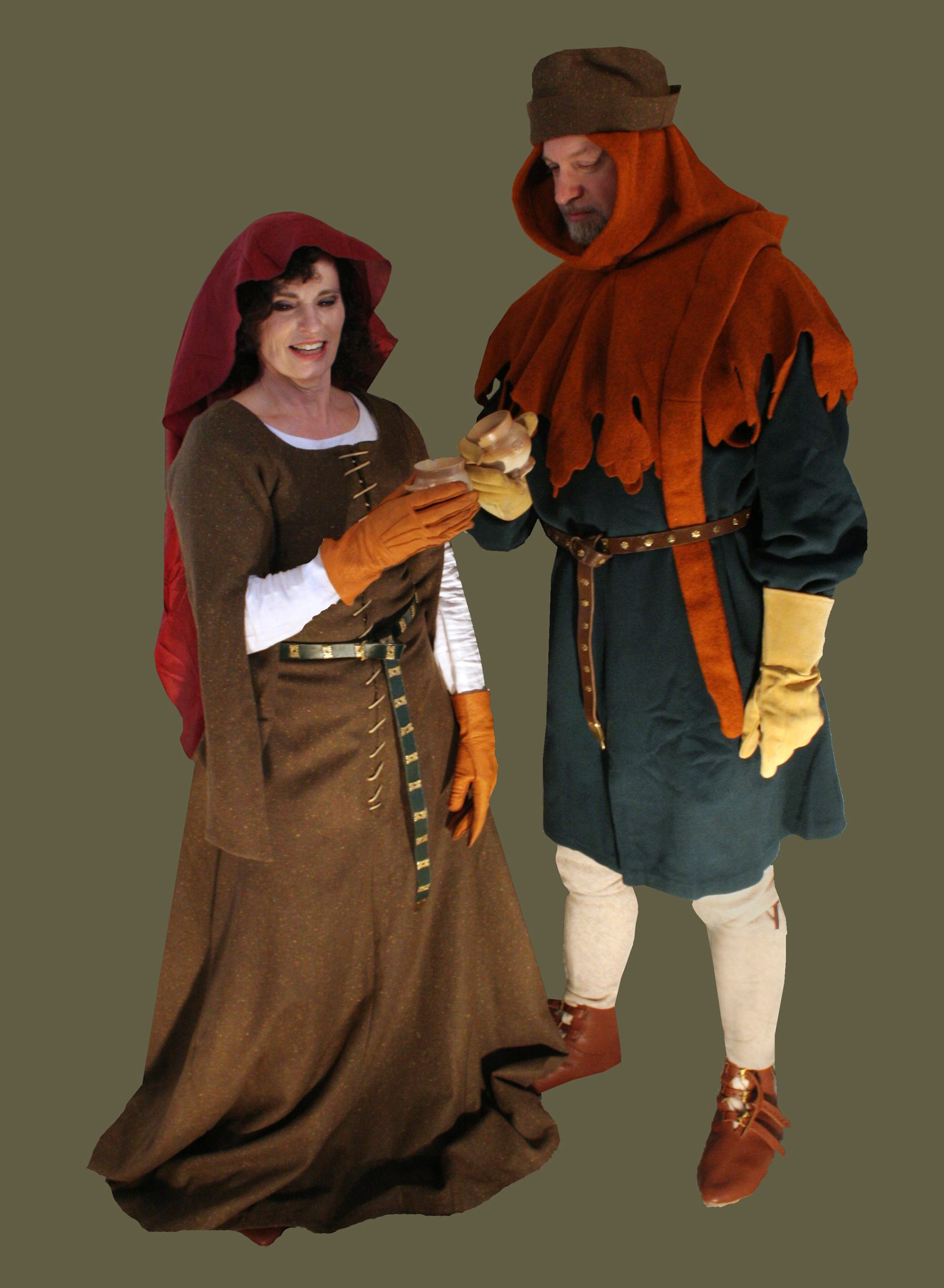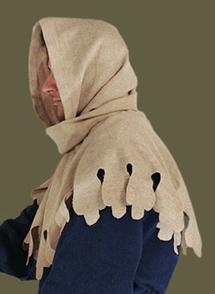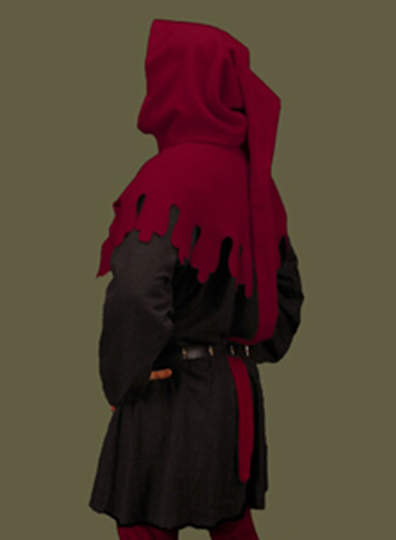 Head-coverings were a critical component of dress in the Middle Ages. Hoods were common with men and women of all classes, and came in a wide variety of forms: long tailed or liripipe, short-tailed, dagged or straight hems, either pull-over or with an open front that was buttoned or pinned closed. Only the sumptuousness of the fabric, elaborateness of the dagging, or extreme length of the tail distinguished the hood of a duke from that of a villein. Men wore their hoods alone or with a plain linen coif beneath or a hat over, while women seem to have worn the hoods alone or with a wimple. In general, the most extreme version of this style with the longest tail or, liripipe, was typical in the mid to late fourteenth century while our short-tailed version is more typical of earlier fourteenth century portrayals. Made in fulled woo, so that the dagg edges won’t fray, this hood is joined in the front for the ease of pull-over wear and is a stylish solution to keep warm while being completely authentic. It can also be rolled into chaperone hat.
