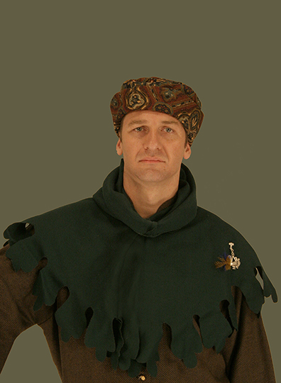 A lord in a purple dagged hood with a brown wool brimmed hat. He wears a green wool tunic and a white undershirt. he completes the look with a Quatra-bar decorated belt and a brown kidney pouch.