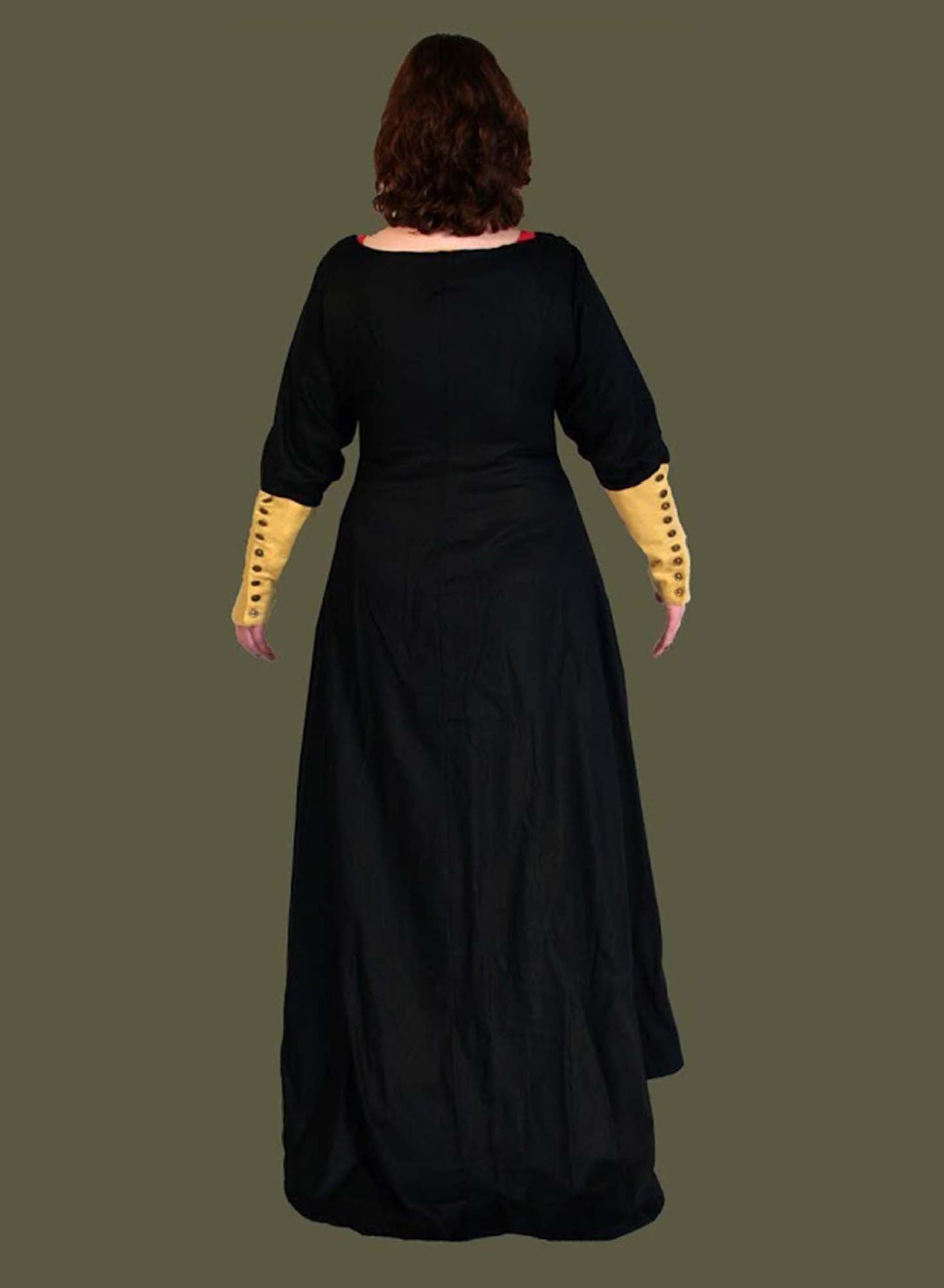 This Lady struts confidently in her black linen Lancelot Gown with gold linen sleeves. Also shown is a red linen Liripipe Hood . Beneath she dons a red linen Kirtle, linen Stockings, wool Garters, and Boots.