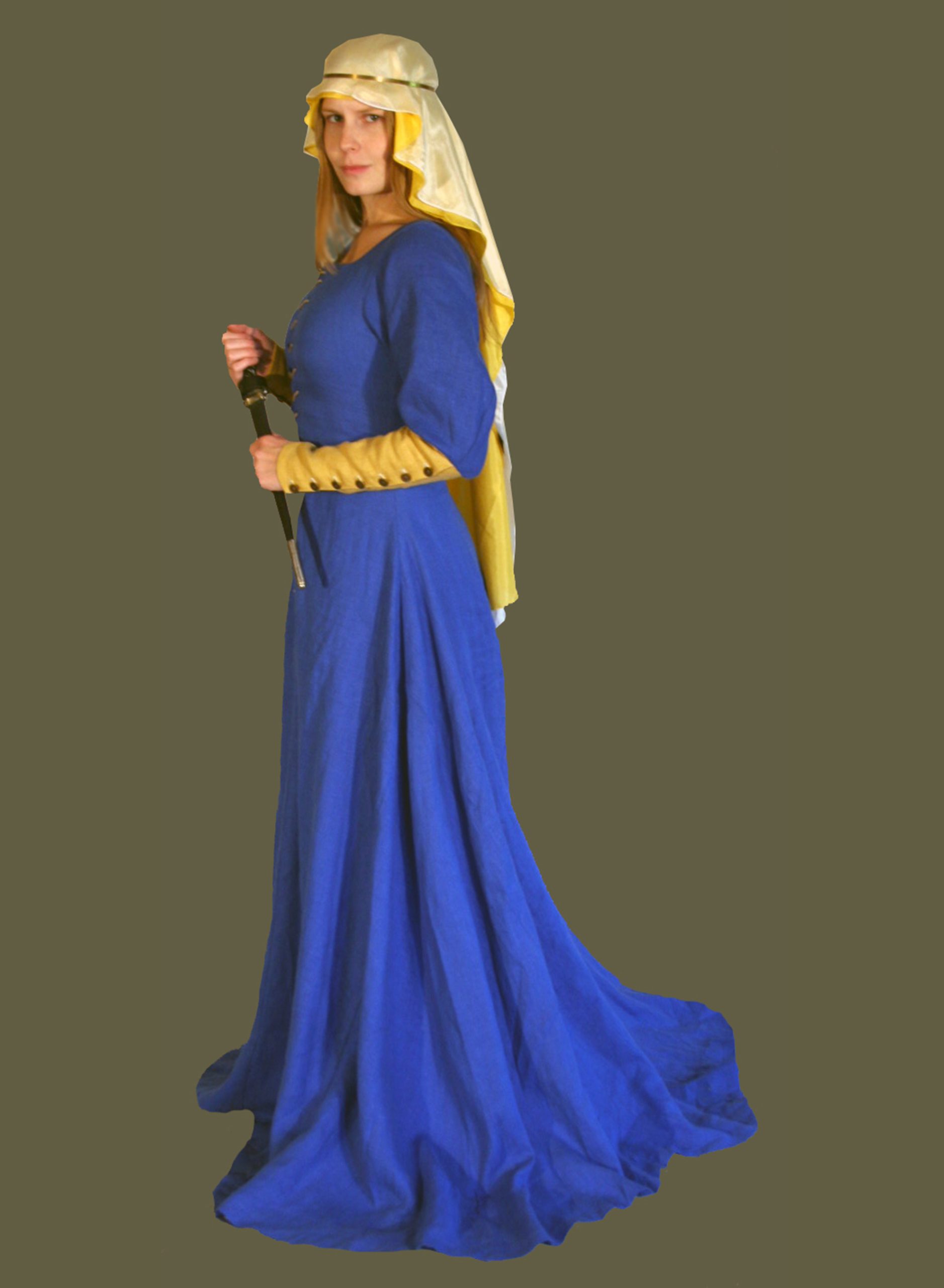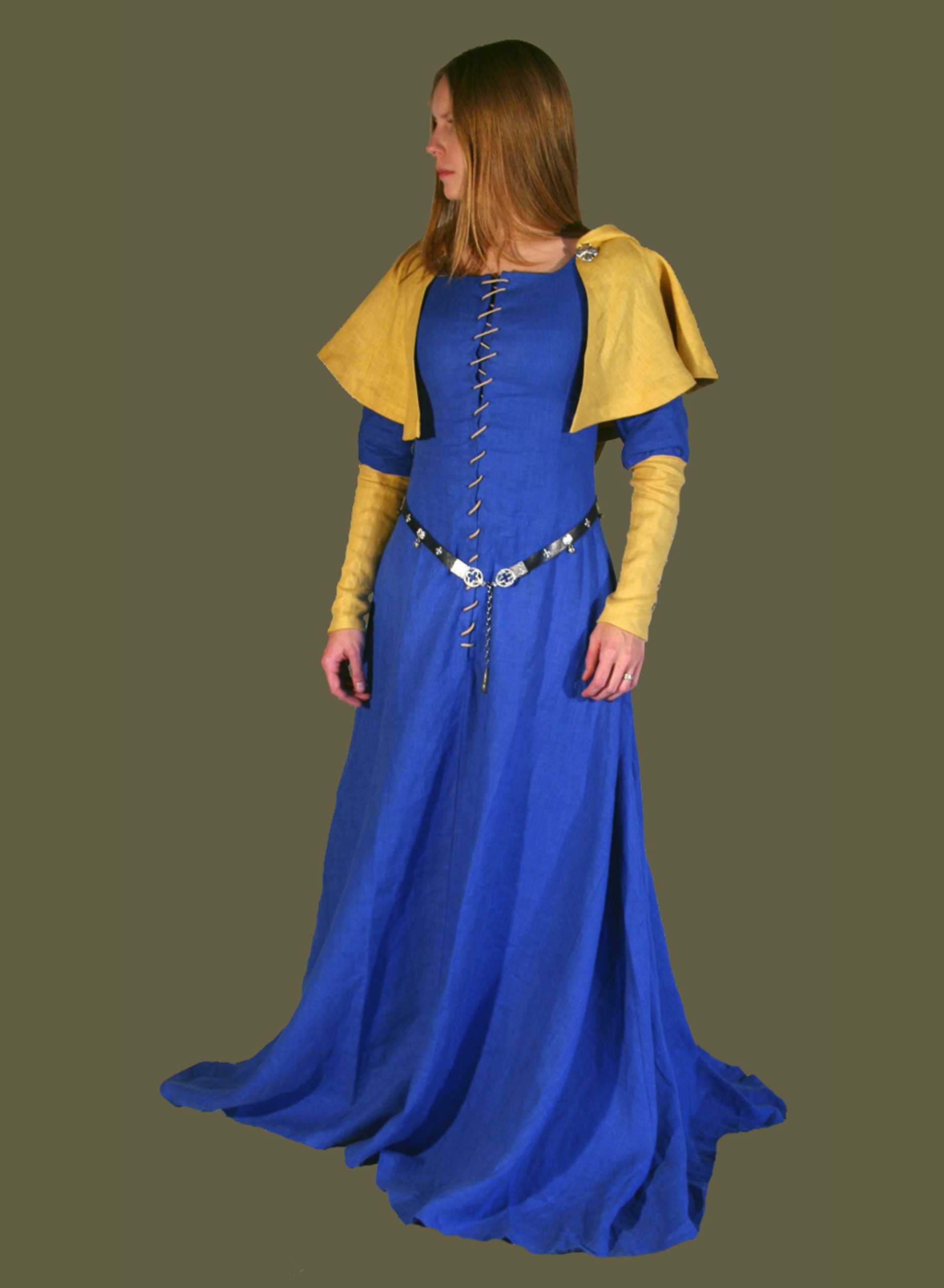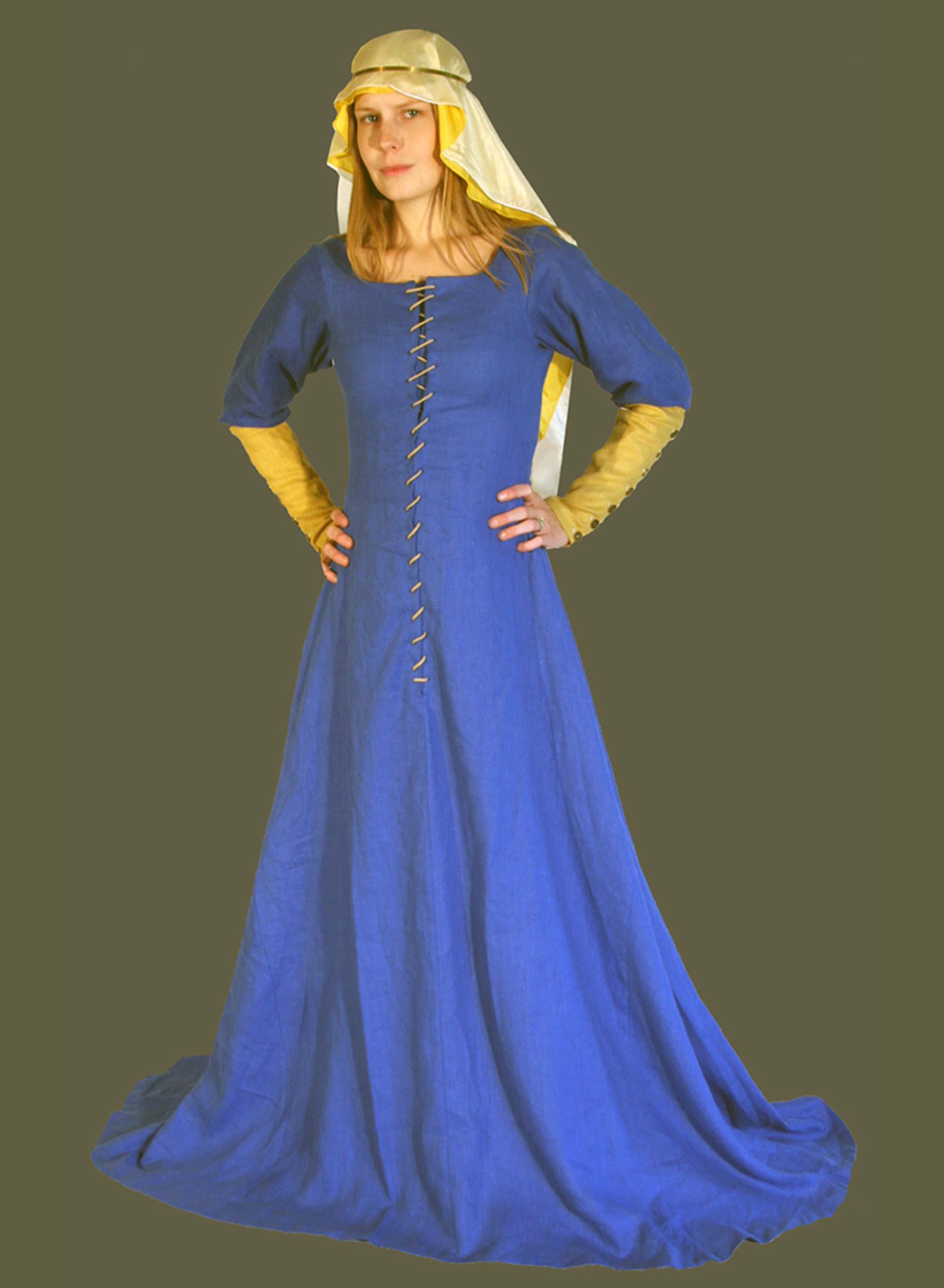 This Lady struts confidently in her royal blue linen Lancelot Gown with gold linen sleeves. Beneath she dons a linen Chemise, linen Stockings, Garters, and Boots. Also shown is a Gold linen Liripipe Hood. She finishes her look with a Decorated Belt.
