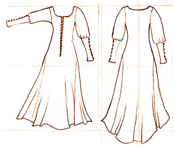 The gowns depicted in Lancelot are of a classic form that was particularly popular in northern Italy and France during the last quarter of the 14th century: a gown fitted in the torso with a front-closure, flaring from the hips into full skirts and a short train. The arms are generously full to the elbow, at which point they significantly taper to follow the line of the forearm. The sleeve buttons from elbow to the cuff with cast, metal buttons, as is depicted in the manuscript. We have followed contemporary artwork by seaming the sleeve at the elbow and making the lower sleeve out of a contrasting color of fabric. This was a common, and particularly attractive, feature of the Italian cyprianae, which we have faithfully reproduced.