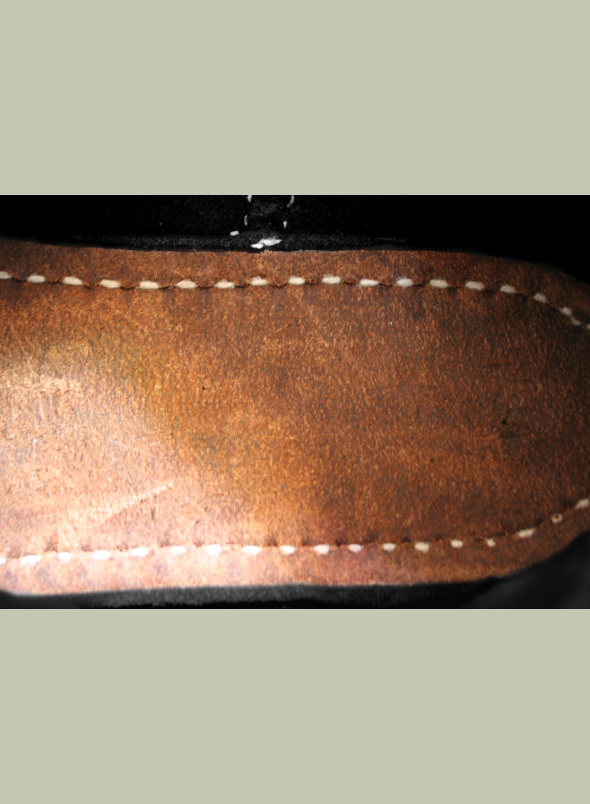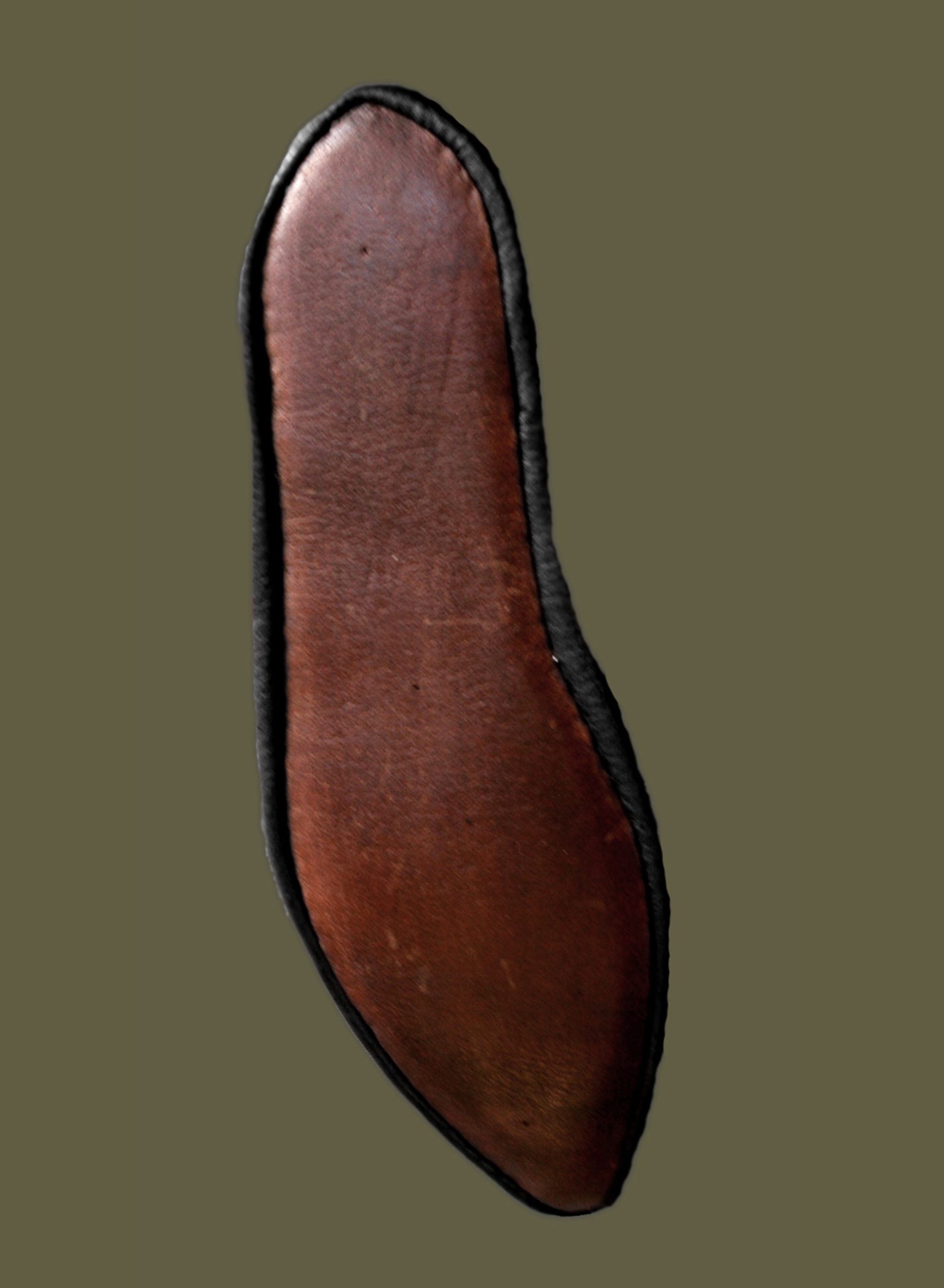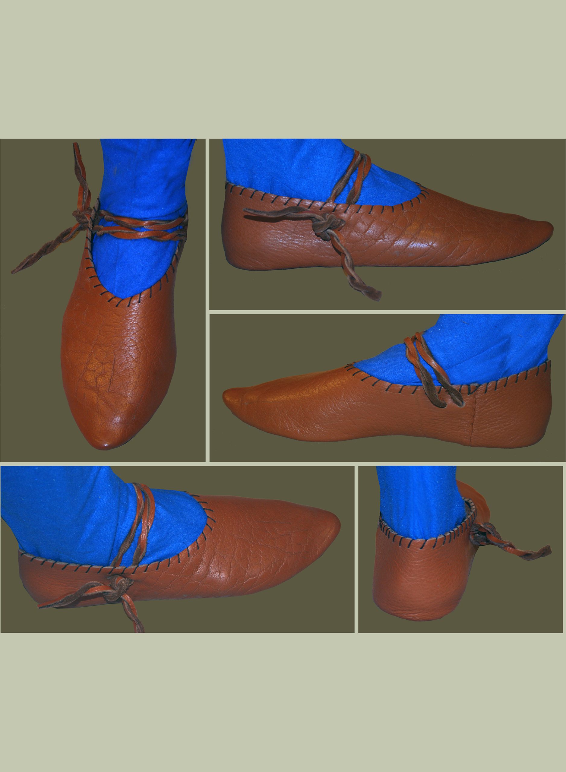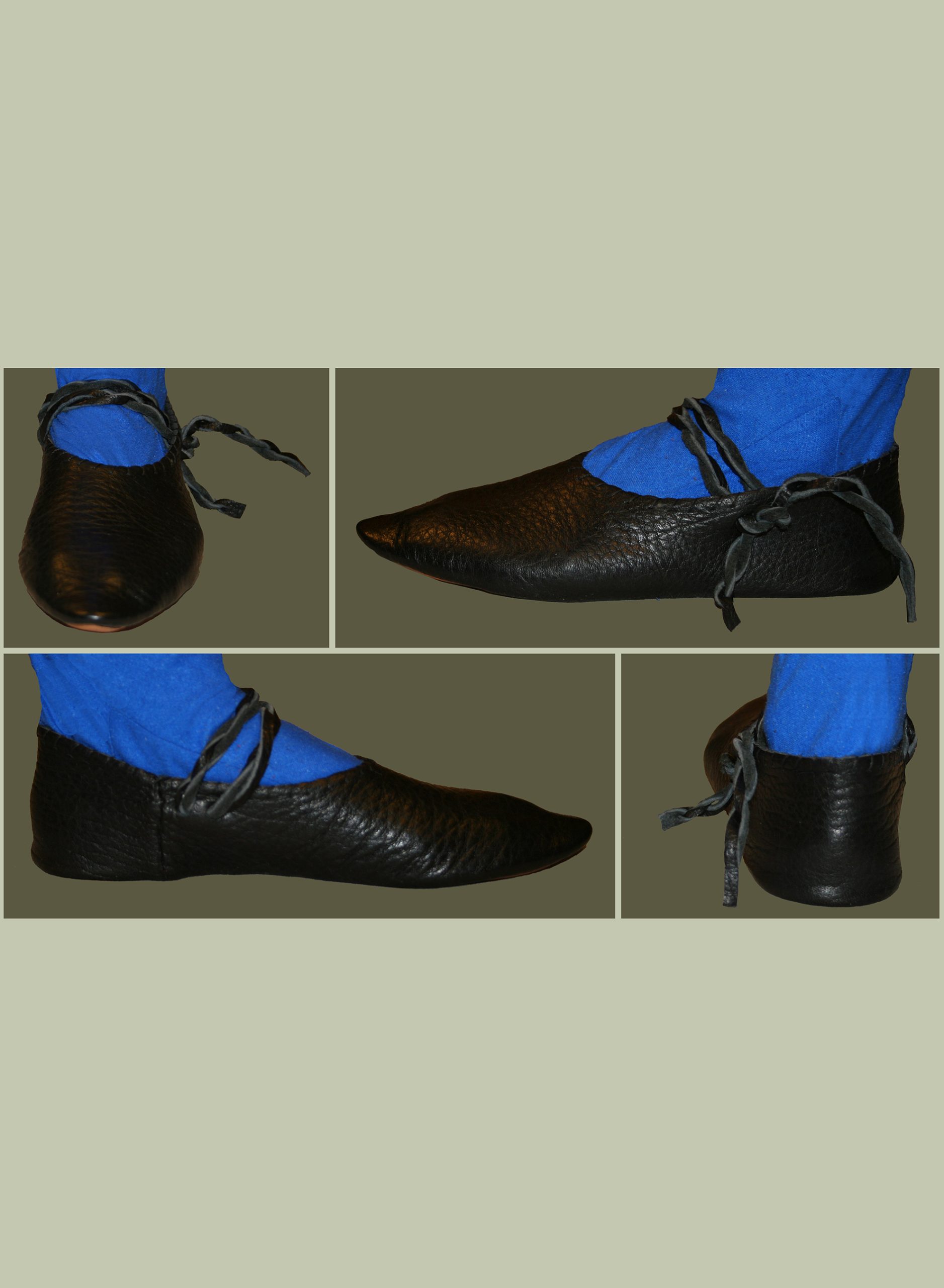 Many of our customers who have asked us to add a “correct” medieval turnshoe to our line for use in higher-level reenactments and on stage. We listened and we are proud to present you with the most authentic, highest quality medieval shoe available. Our medieval turn shoes are inspired by 14th-15th century shoes found in Schleswig, Germany, but are broadly similar to examples dating from the 8th century onward. The universality of medieval footwear also makes them quite similar to examples found in England and elsewhere in Western Europe. These shoes are constructed using only the authentic medieval stitching and techniques to produce a highly accurate recreation of the quintessential medieval shoe. They are made with correct medieval tunnel-stitching, sewn inside-out, then turned and finished. (Even better, they are also extremely comfortable to wear with little or no breaking-in necessary!) Please note the pebble finish varies as the hides the shoes are made from naturally vary. Our turnshoes currently come in a deep black, a rich golden brown, and are available in Men’s 3-14 whole sizes only, Ladies order 2 sizes smaller. The leather is pebbled; pebbling ranges from a generally smooth surface to a heavily pebbled one – a natural result of the tanning process – but is generally consistent within a pair of shoes. We have made these shoes with extra thick soles, since many modern feet are not used to the softness of period shoes, but we recommend choosing a size larger than you normally would so as to have plenty of room to add a modern insole.