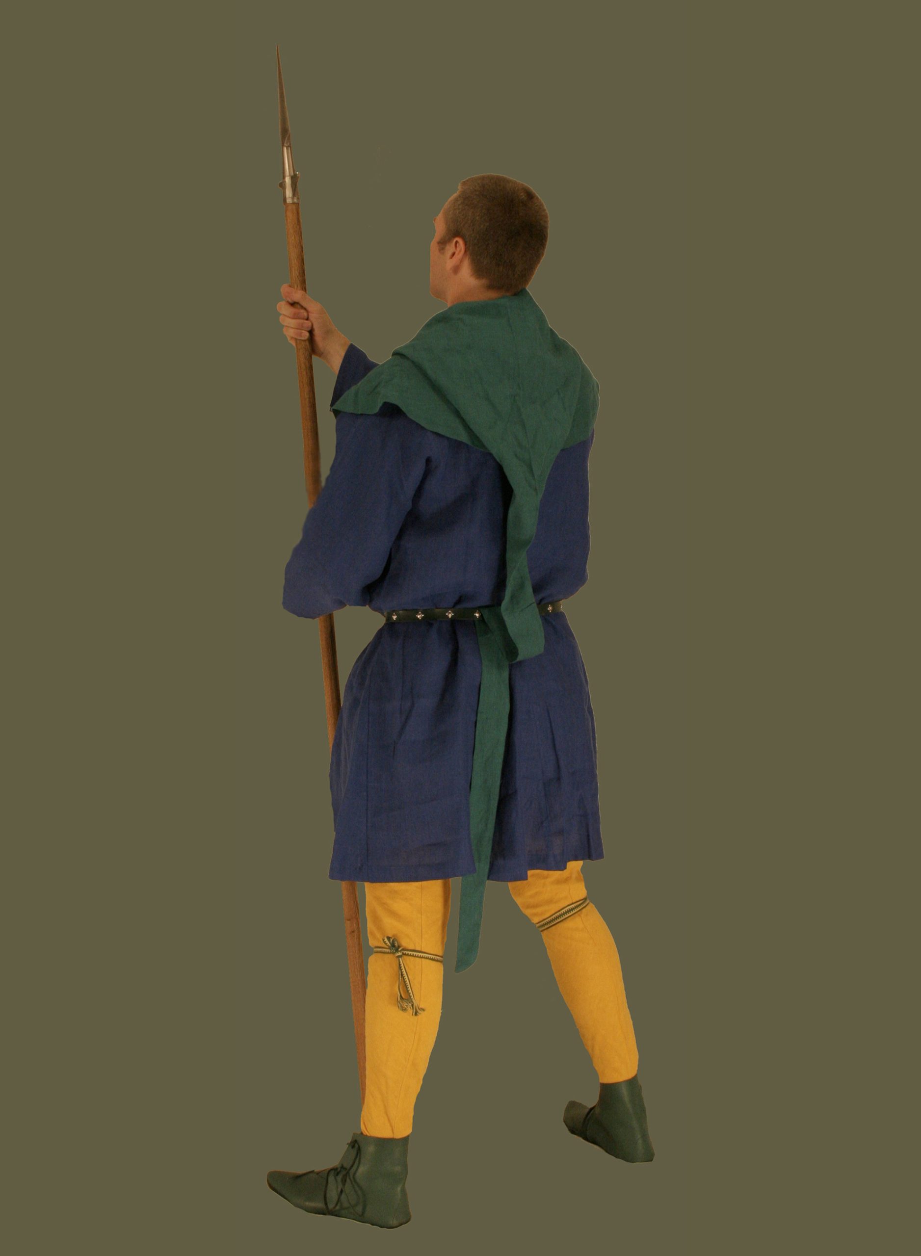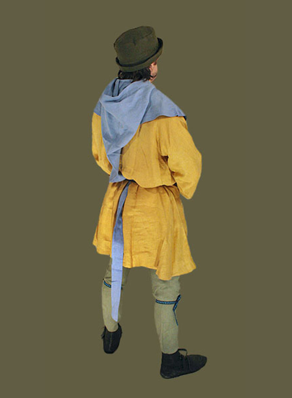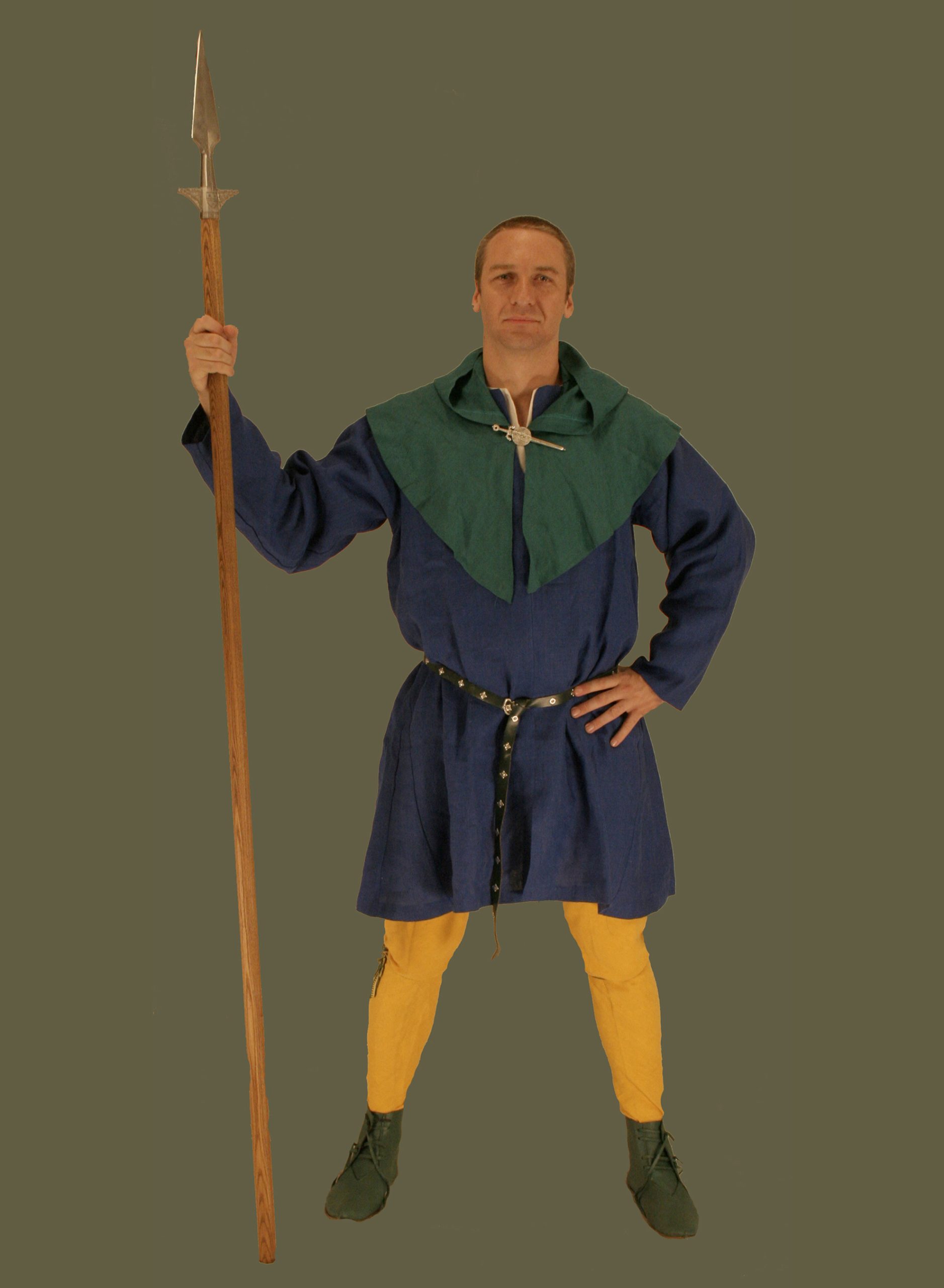 Head-coverings were a critical component of dress in the Middle Ages. Hoods were common with men and women of all classes, and came in a wide variety of forms: long tailed or liripipe, short-tailed, dagged or straight hems, either pull-over or with an open front that was buttoned or pinned closed. Only the sumptuousness of the fabric, elaborateness of the dagging, or extreme length of the tail distinguished the hood of a duke from that of a villain. Men wore their hoods alone or with a plain linen coif beneath or a hat over, while women seem to have worn the hoods alone or with a wimple. In general, the most extreme version of this style with the longest tail was typical in the mid to late fourteenth century while our short-tailed version is more typical of earlier fourteenth century portrayals. It is offered in the same colors as our popular linen tunics, cottes and gowns. This design has an open front that can be closed with your own brooch, or you can add your buttons to customize its look. Made of 100% linen this hood is a cool and authentic solution to keeping the sun at bay.