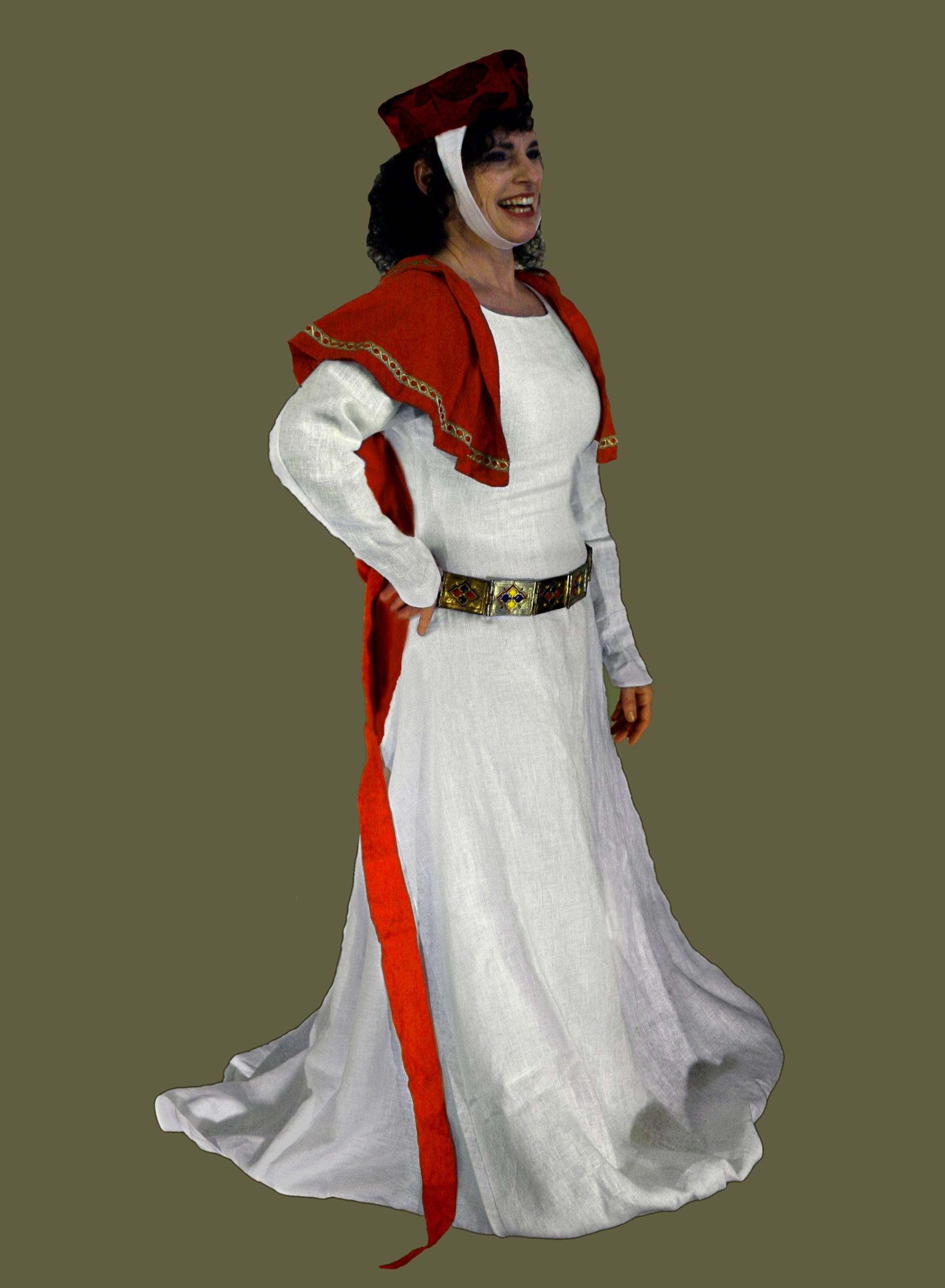 A Lady wears a bright red liripipe hood over a black Lancelot Gown with contrasting gold sleeves. Underneath she wears a red Linen Kirtle, gold Stockings, and a pair of black turnshoes.