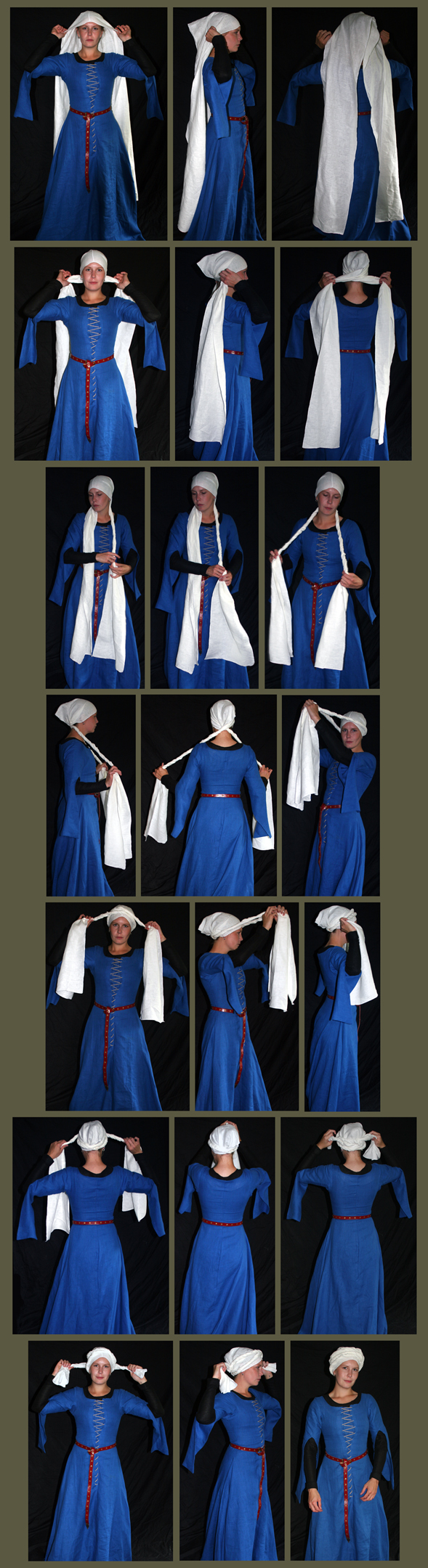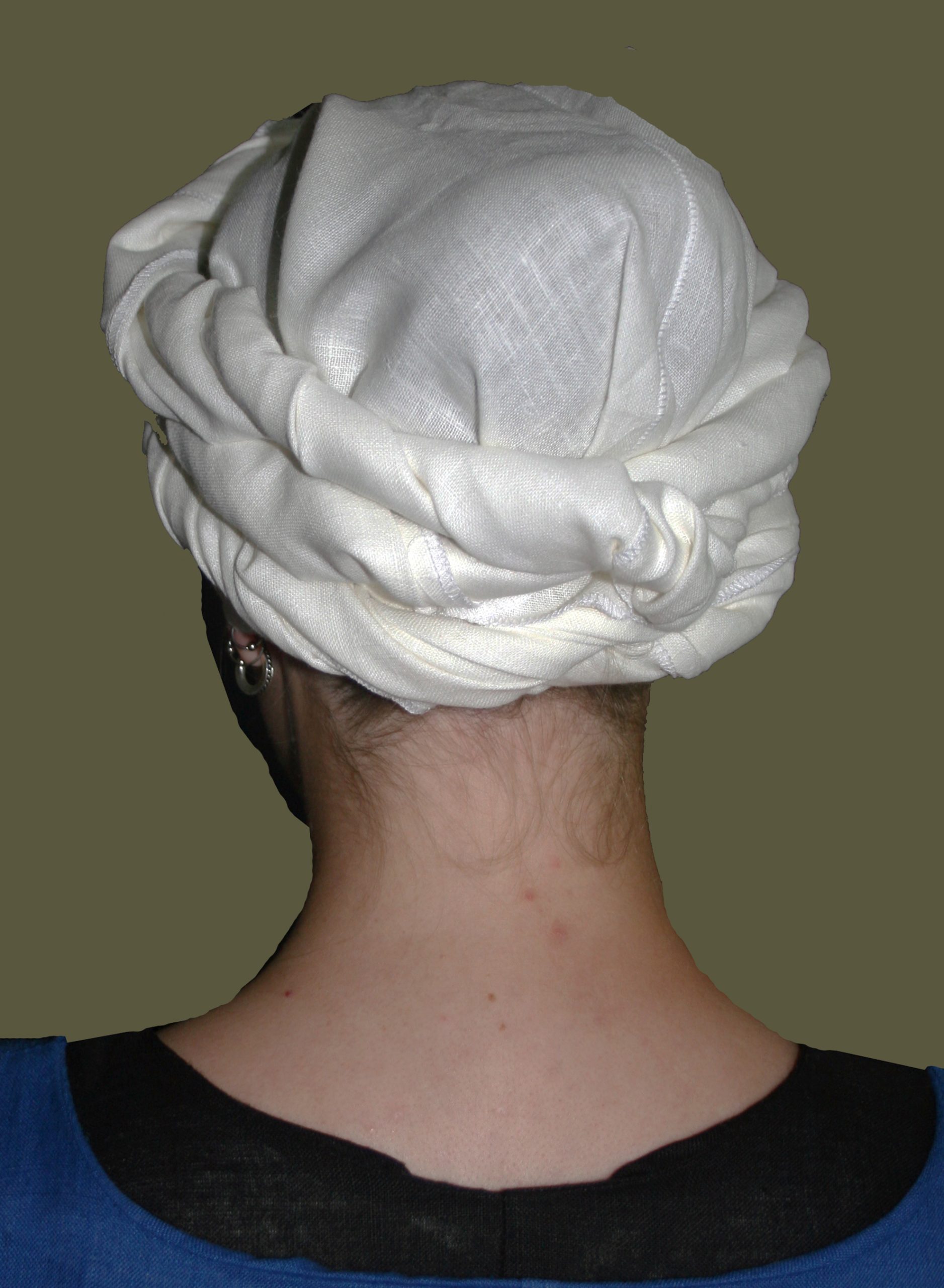 “What do I do with my hair?!?” has been the anguished cry of women frustrated with a “bad hair day” or keeping their long locks out of their way while working for centuries. And, of course, in many times and places throughout the Middle Ages a married woman or lady of station was expected to keep her hair covered. While noblewomen often relied on the veil, or the veil and wimple, a far simple and more practical style developed amongst the working classes in the 13th century, and became a common fashion for the next two centuries, particularly in the Italian and German principalities and free cities. Likely developed from a practical “ad hoc” solution by bathers wishing to keep their hair dry, a long piece of linen was wrapped about the head into a tight turban, sometimes worn with a rectangular veil added over top, especially in Italy. A perfect, simple, comfortable and historical way to keep your hair out the way and in the heat of summer you can even soak it with cool water before wearing – kind of medieval air conditioning!