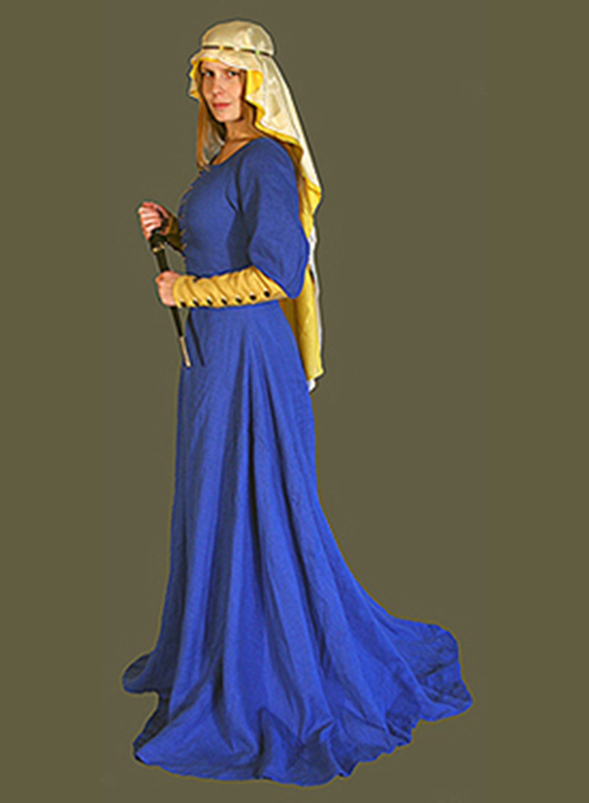 In the Middle Ages, the well-dressed (and well-behaved) lady did not run about town with her head completely uncovered like a maid. Even if she decided to forego any sort of elaborate headdress, she would be adorned with the simple veil. Throughout the period veils came in both oval and rectangular configurations, which could be worn in a wide variety of ways – both alone or with wimples, barbettes, or any number of different headdresses and hats. We have replicated both shapes in white linen, and generously sized them to create an elegant, flowing look. For more formal wear, and in order to secure the veil to your head, we offer both a barbette and a wimple. The barbette‘s origin has been attributed to Eleanor of Aquitaine in the mid-12th century, and was a simple band of cloth used to secure a veil or hat, worn vertically around the head and fastened closed with a pin. It remained in use into the 14th century. The wimple also developed in the 12th century as a way to conceal feminine charms, and was adopted by both modest and fashionable women. Although less ubiquitous by the 14th century than in earlier centuries, the wimple remained a common piece of female attire throughout the period, and was a natural way to attach the veil. Our wimple has a smooth, elegant line that frames the face, and is specifically designed to be integrated with our veils. It can be worn to completely conceal the hair or not, as you choose. We have made all these items out of lightweight linen for comfort, even during the heat of summer.