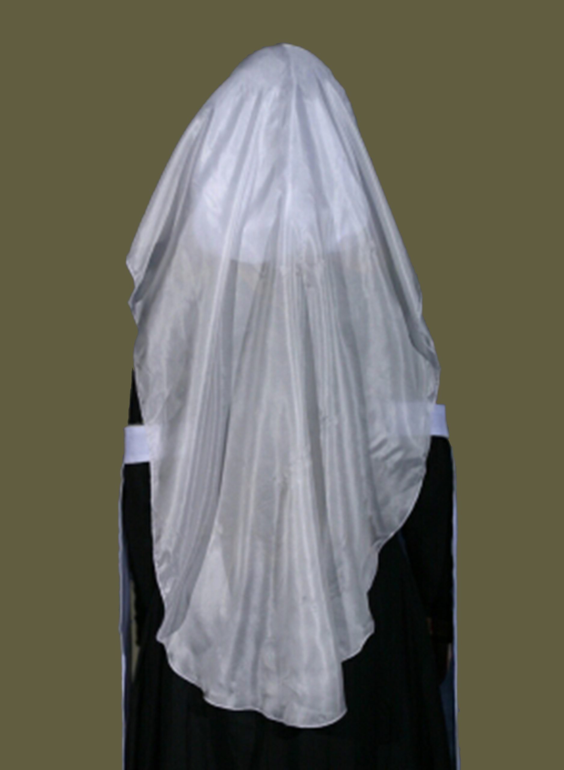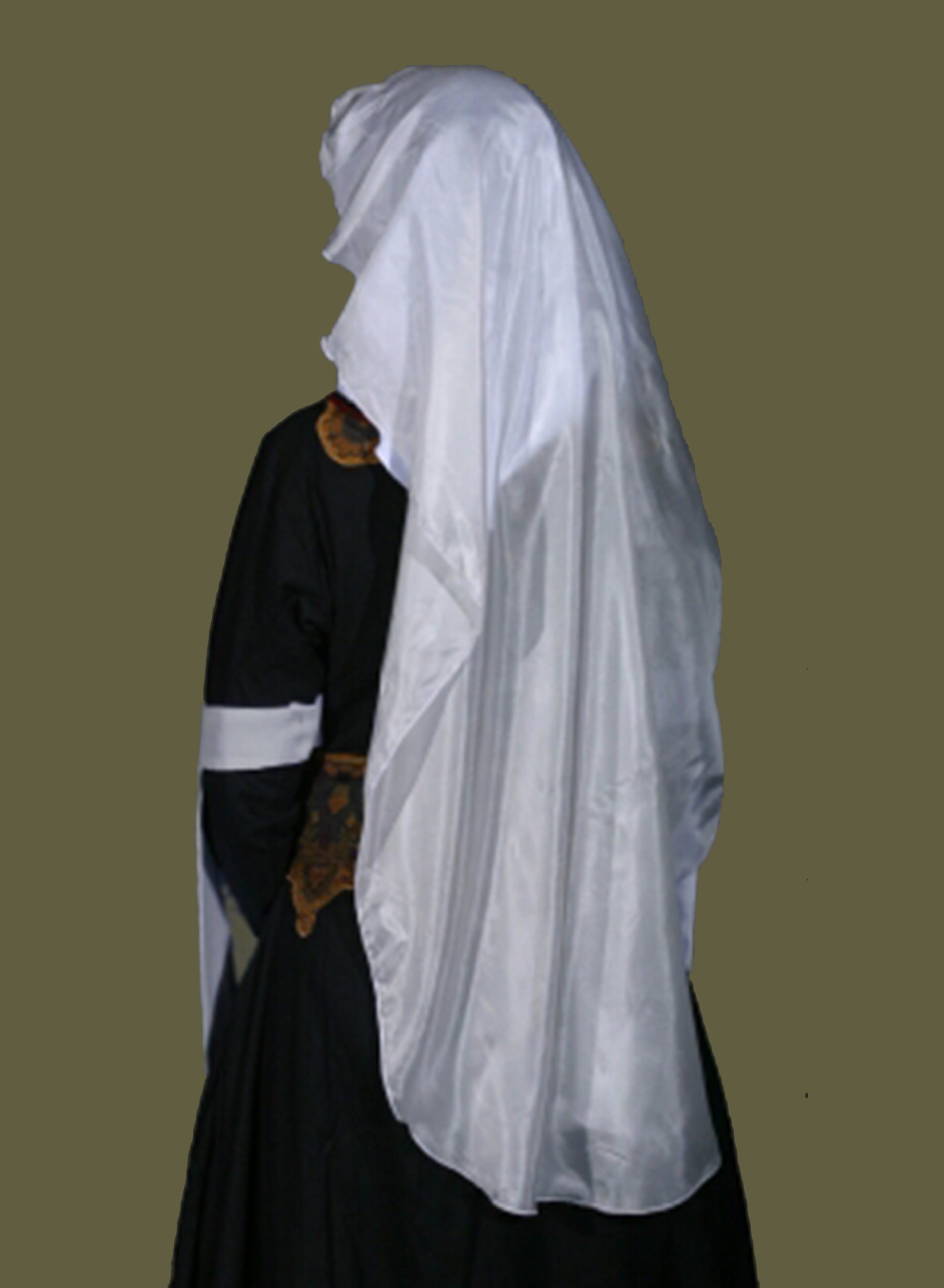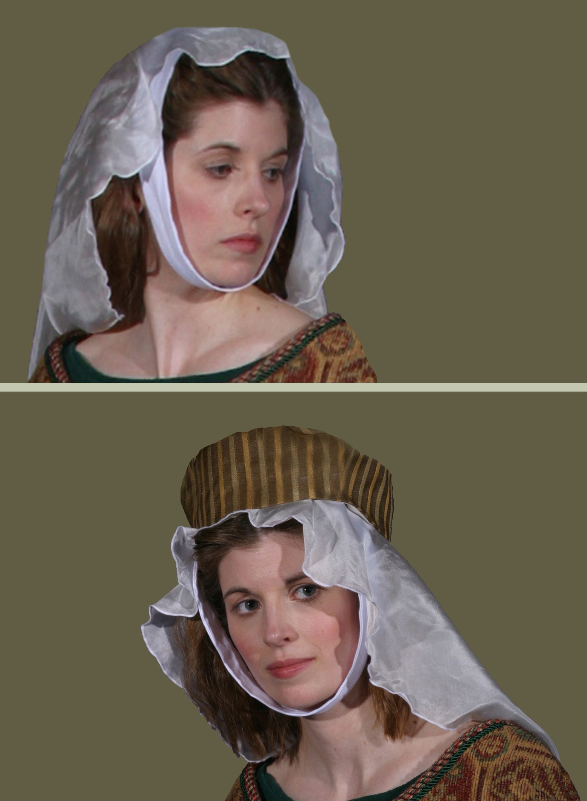 A woman in a gold and red parti-colored backlace gown, wearing a wimple with our silk veil pinned to it.