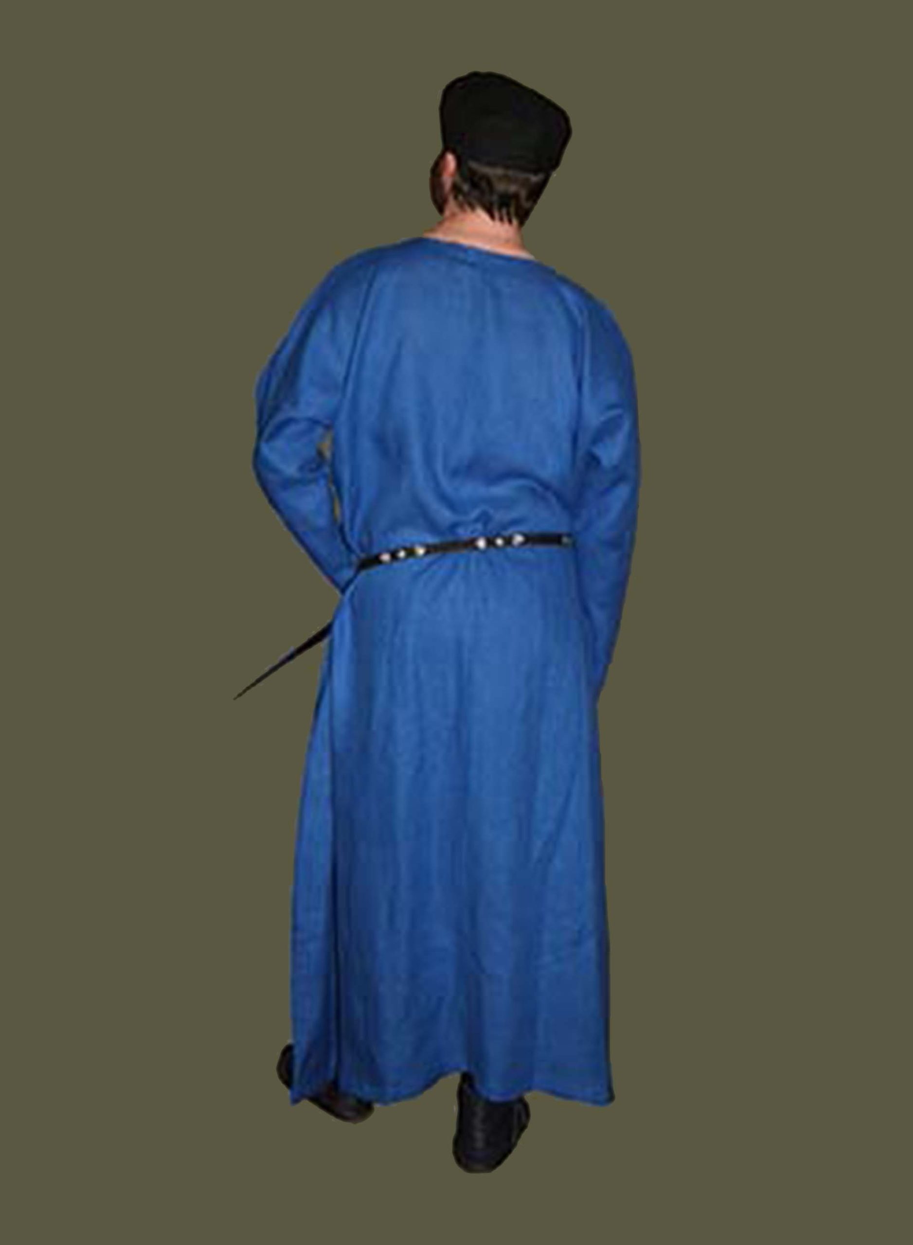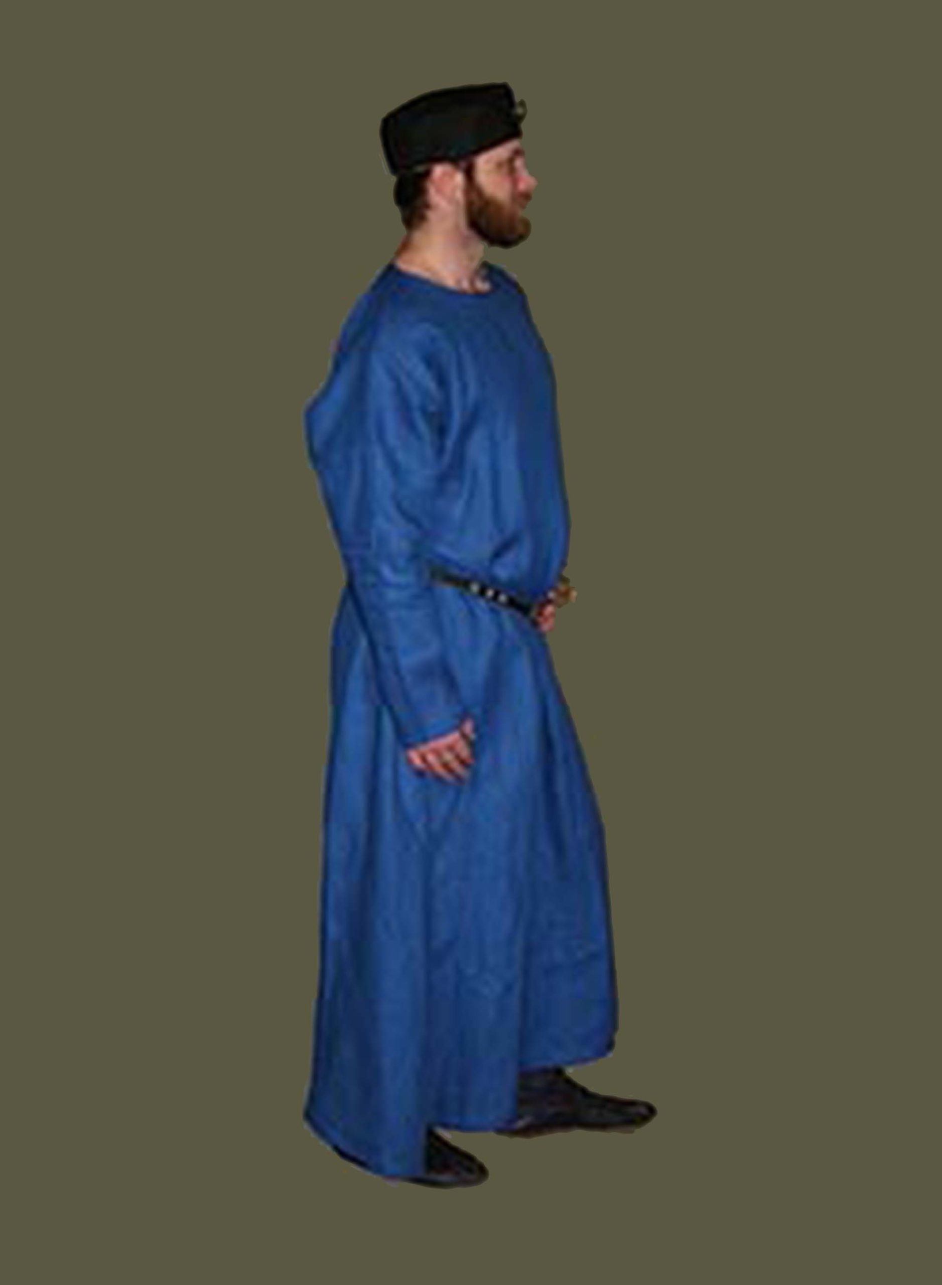 From late Antiquity through the early 14th century, the basic male ensemble for all levels of society was a combination of a linen shirt or tunic worn under a second, colored tunic or dalmatic; only size, fullness of cut, sumptuousness of fabric and detail of decoration denoting any real difference in status. In the 11th century the tunic began to grow longer and fuller, a trend that continued with the ankle-length bliauts and dalmatics that were popular with men in the 12th century. We have chosen to produce a style of long, shaped but flowing tunic popular in Europe during this period and throughout most of the Byzantine era. Made of 100% linen, this tunic a comfortable garment that can be worn by itself or under a supertunic.