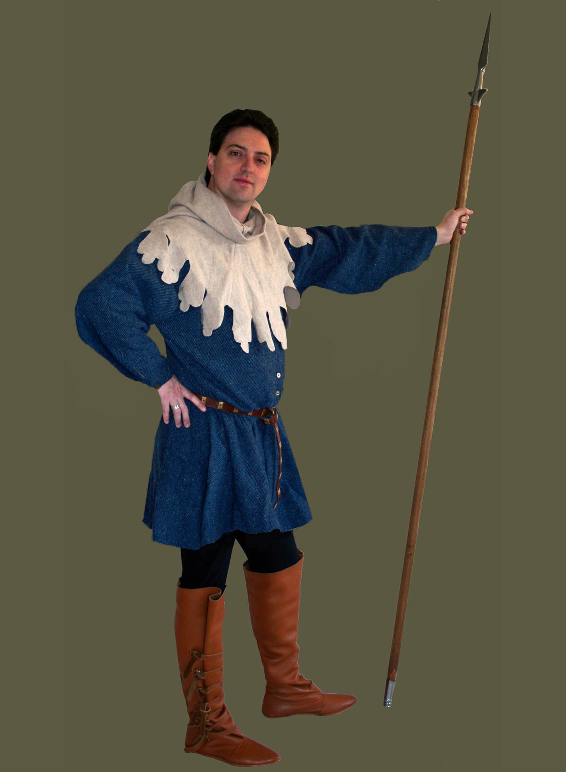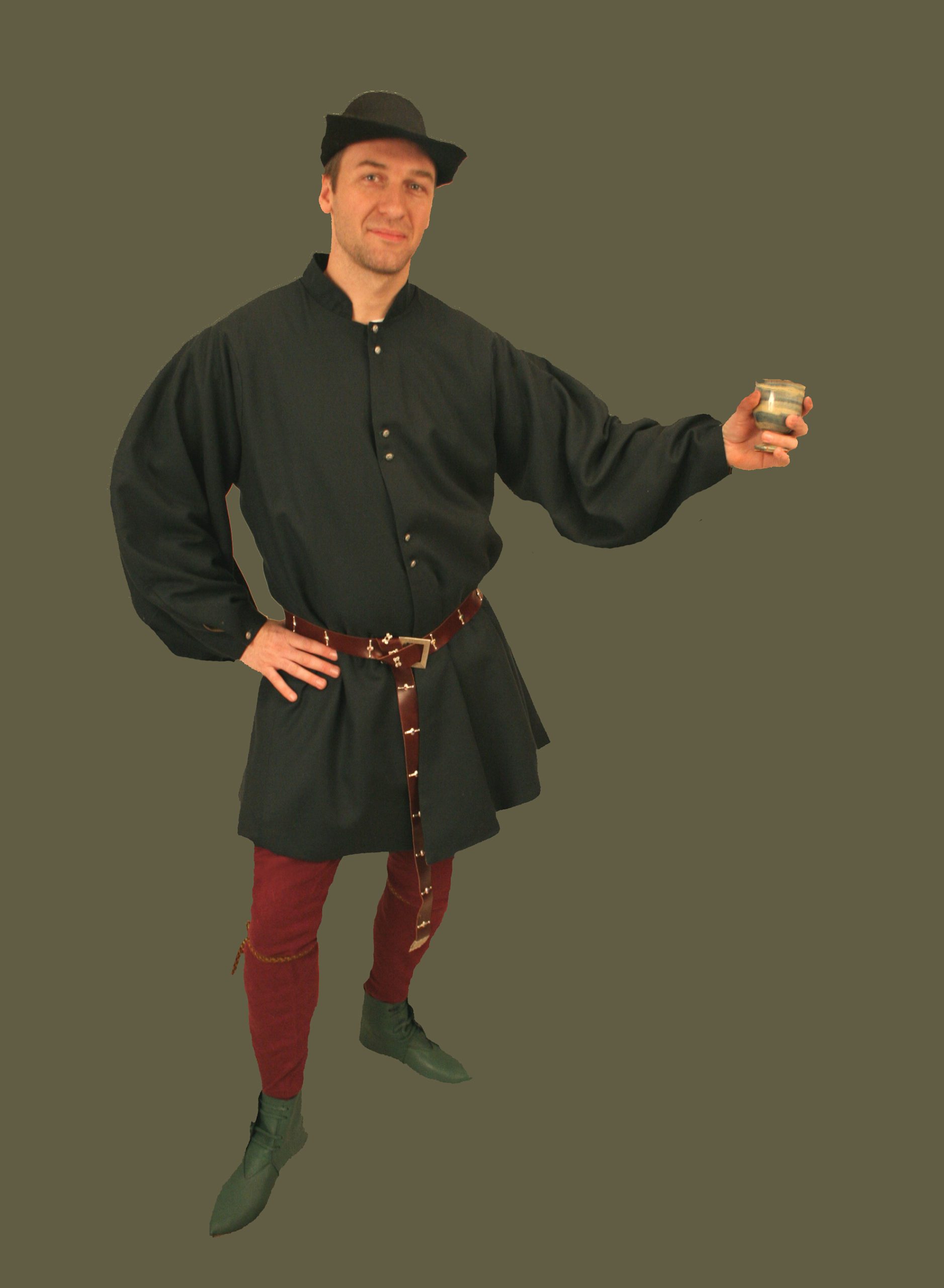 This gentleman stands proud and fierce in his black wool bagged sleeved Tunic and burgundy wool Chauses. Beneath he conceals his Shirt and Braies. He fastens his Chauses with Wool Garters, and a Leather Belt at his waist. To protect his head from the cold he wears a burgundy linen Liripipe Hood. He closes it with a Decorative Badge