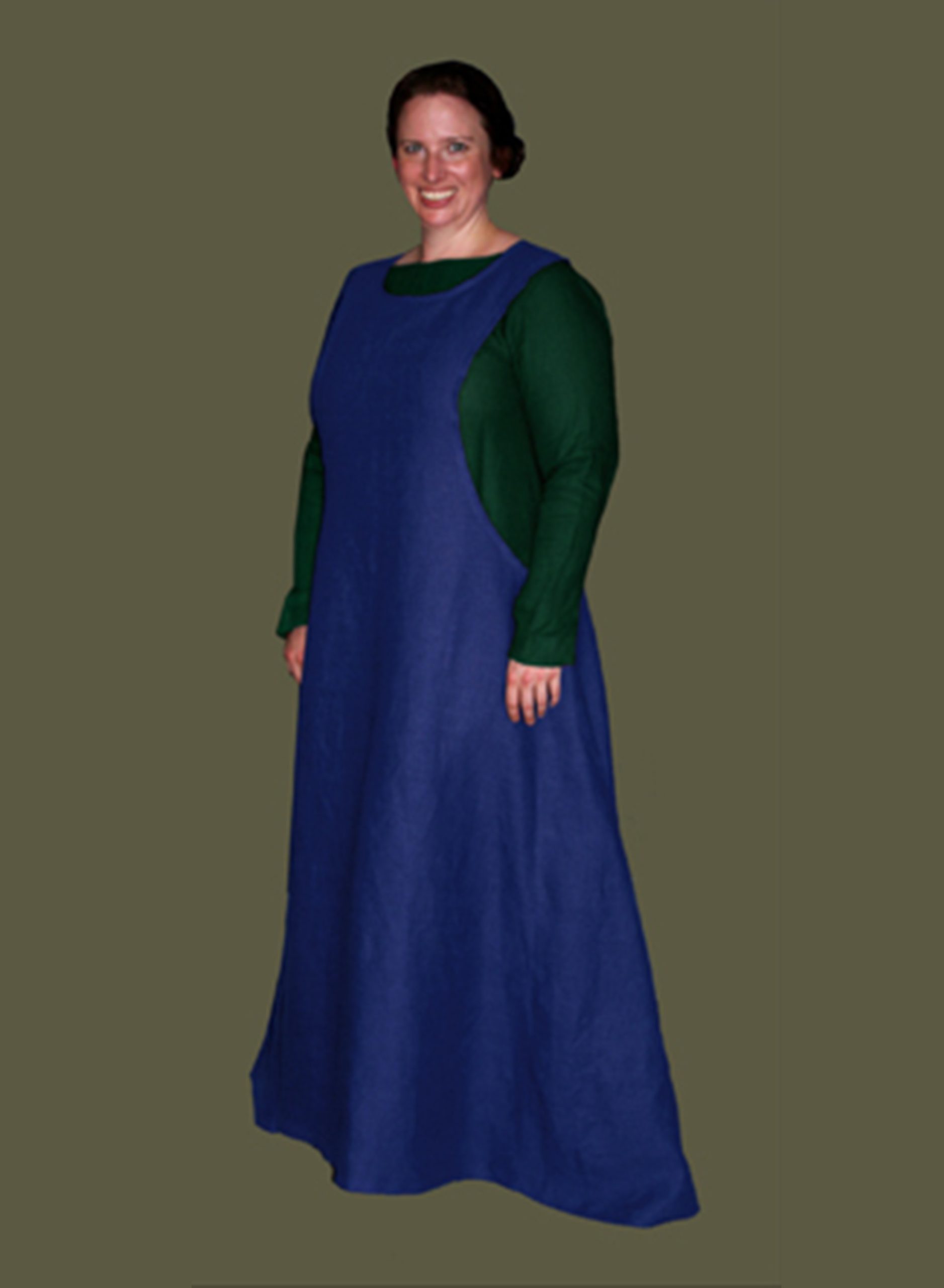 Surcoats were made of any variety of fabrics and patterns – from simple linen and wool in solid colors to elaborately patterned silks, velvets and brocades; wealthy women often trimming or lining their garments with fur. Our full-length surcoats are based on historical artwork from the mid-14th century and are made of a mid-weight linen, wool, brocade and velvet brocade with self bias edging on neck and armholes.