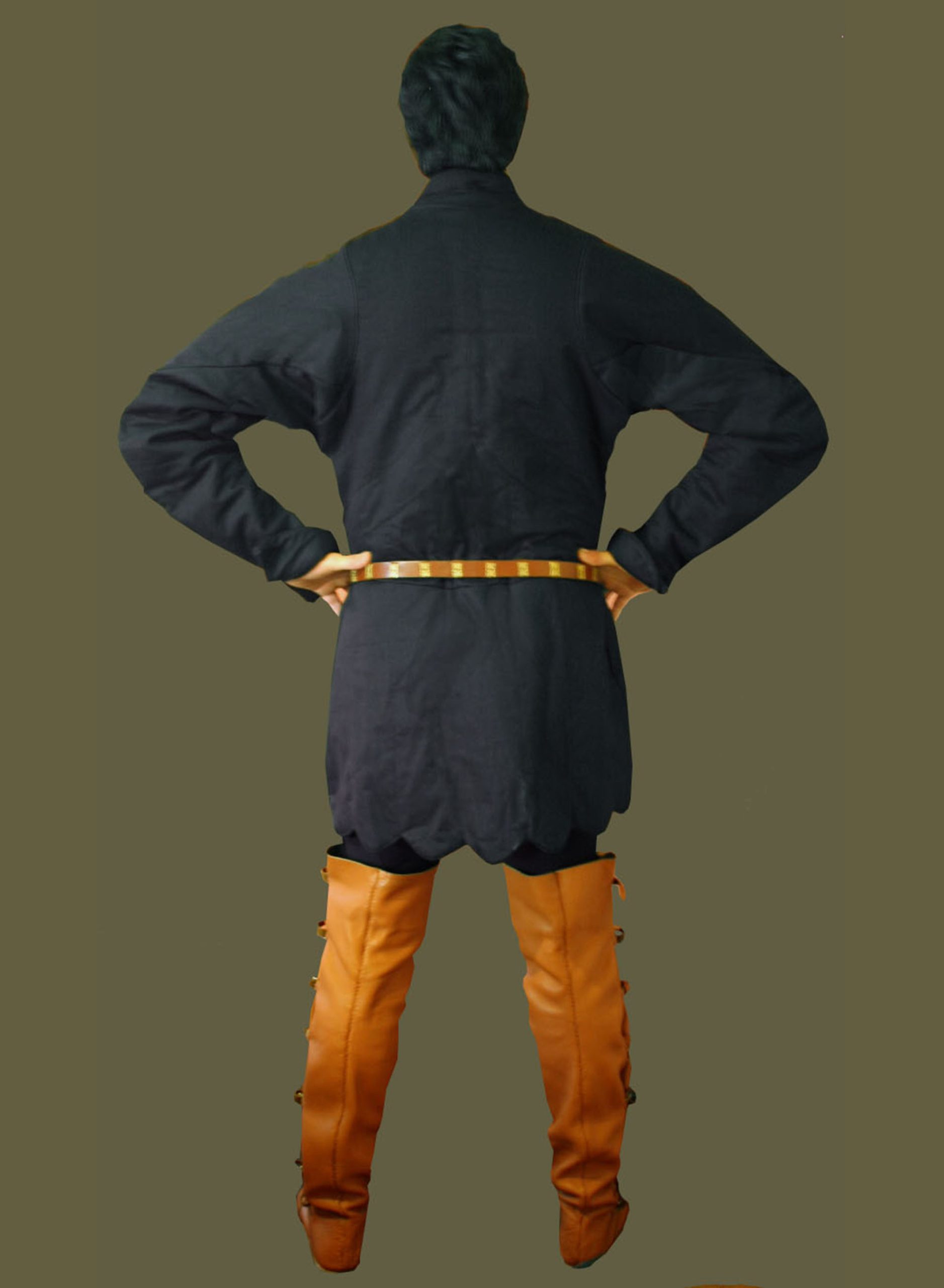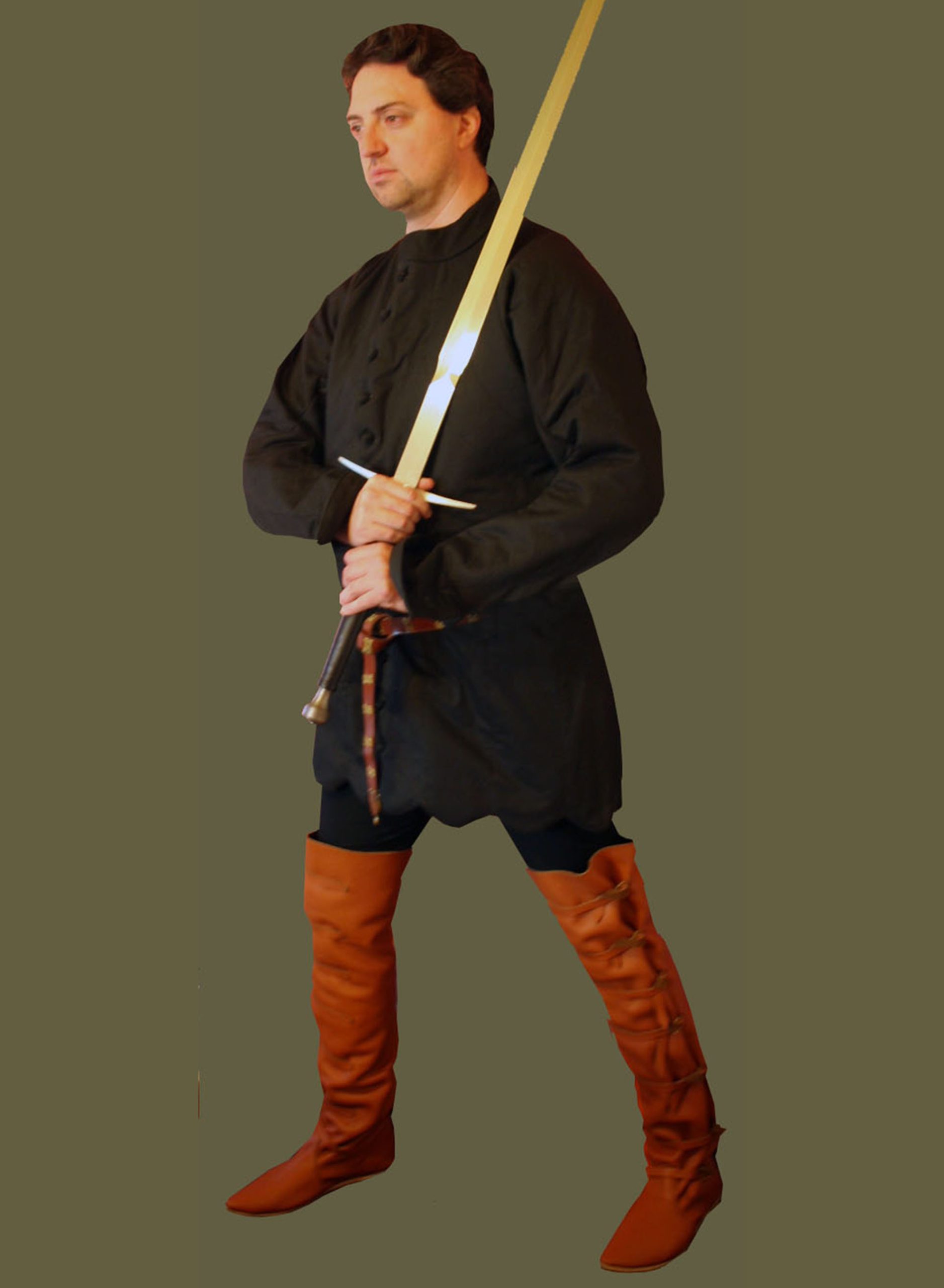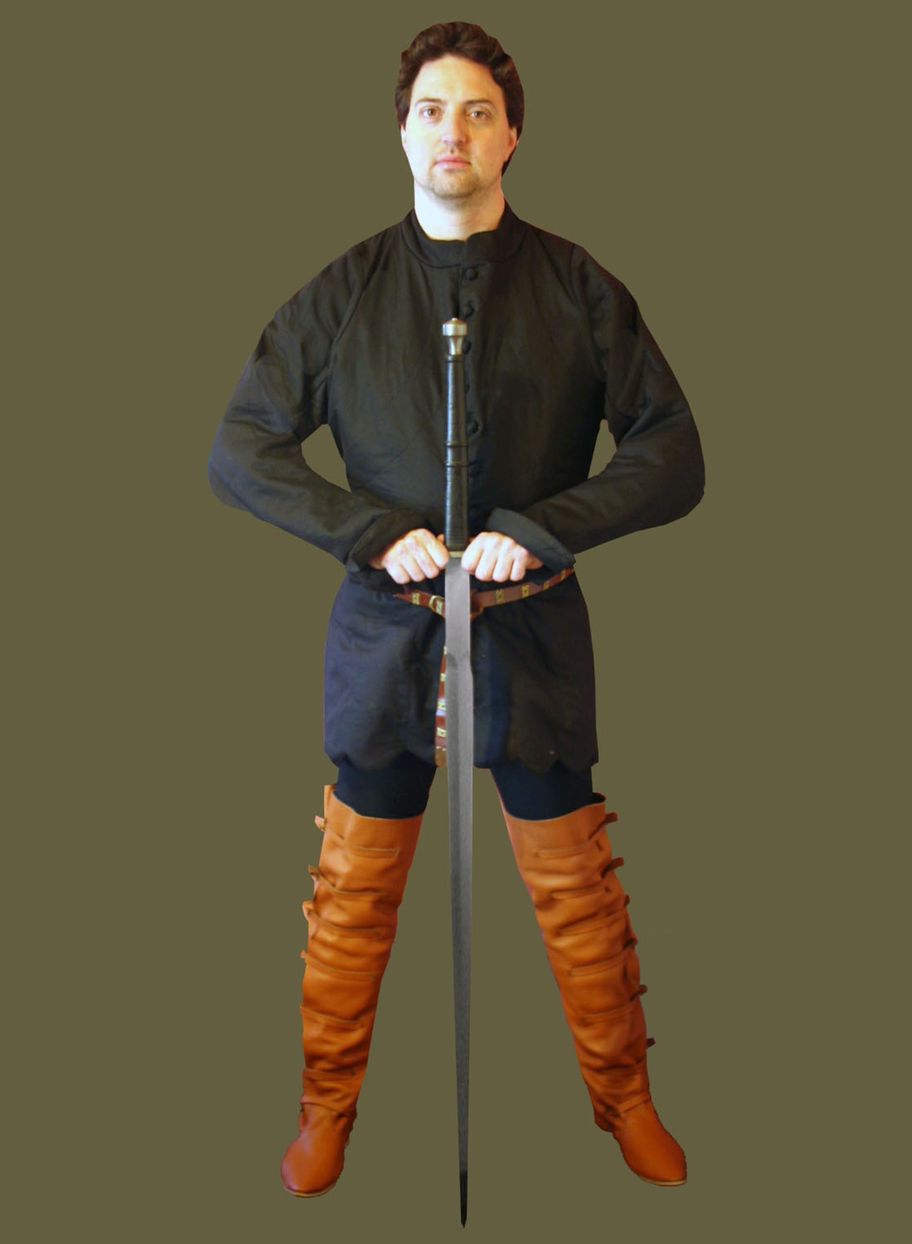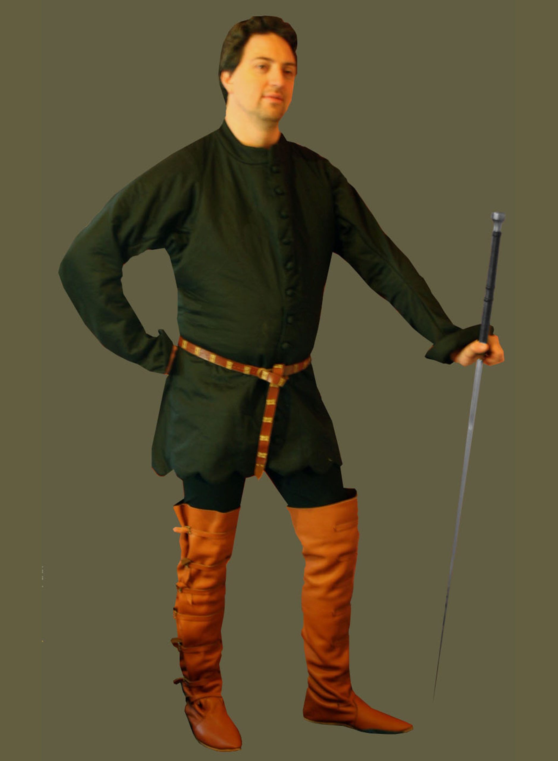 Fighter in black Cotton Gambeson, Medieval Men’s Shirt, black Simple Hose, Decorated Medieval Belt, and brown Tall Boots.