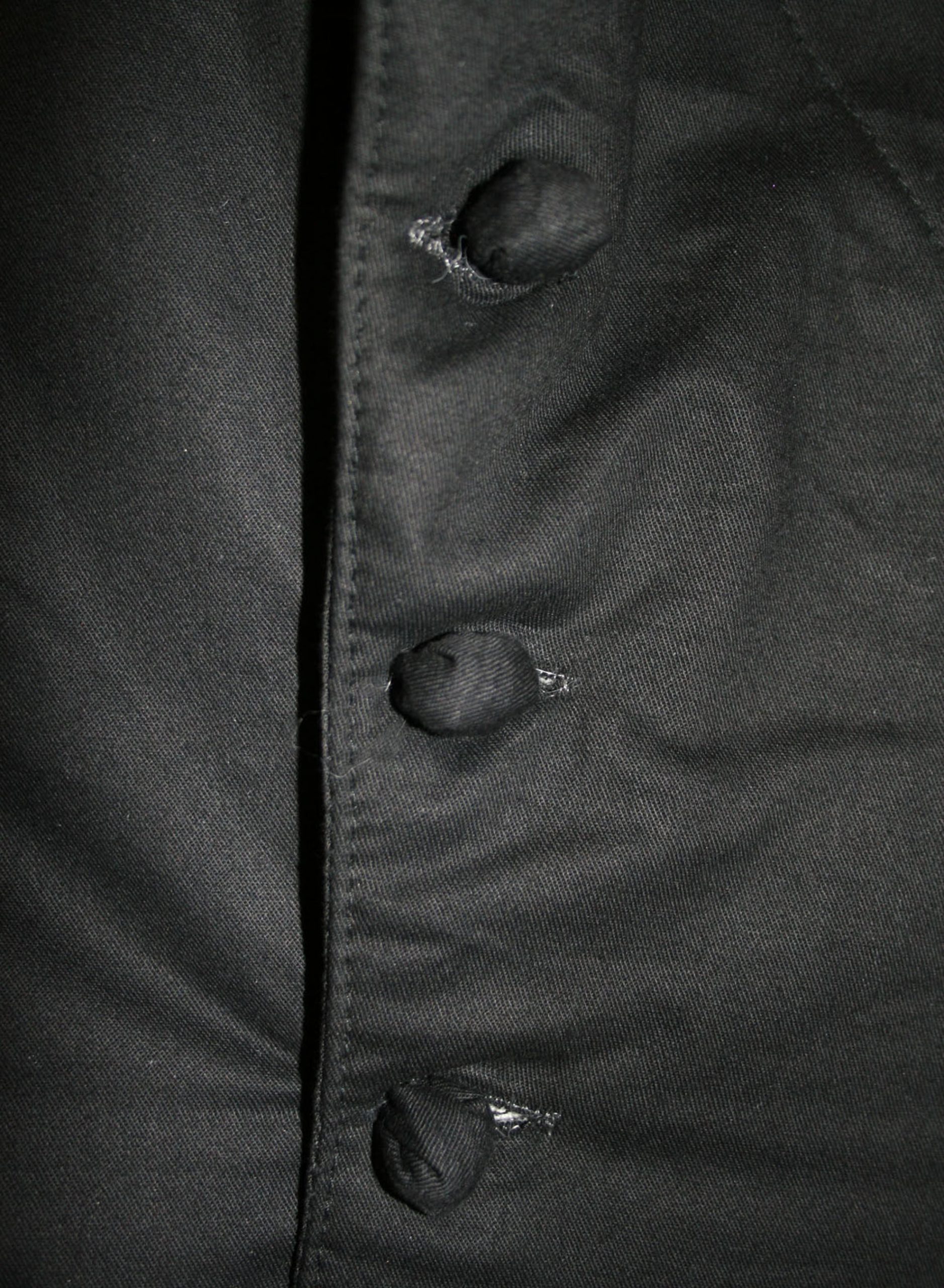 Close up of front closure detail. Note the fabric buttons as well as top stitching to ensure sturdy closure.