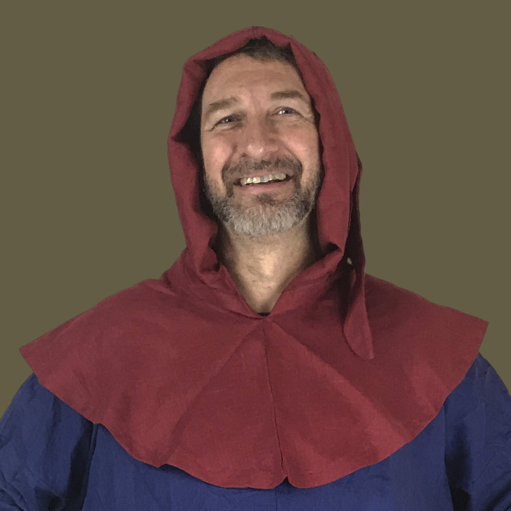 Head-coverings were a critical component of dress in the Middle Ages. Hoods were common with men and women of all classes, and came in a wide variety of forms: long tailed or liripipe, short-tailed, dagged or straight hems, either pull-over or with an open front that was buttoned or pinned closed. Only the sumptuousness of the fabric, elaborateness of the dagging, or extreme length of the tail distinguished the hood of a duke from that of a villein. Men wore their hoods alone or with a plain linen coif beneath or a hat over, while women seem to have worn the hoods alone or with a wimple. In general, the most extreme version of this style with the longest tail or, liripipe, was typical in the mid to late fourteenth century while our short-tailed version is more typical of earlier fourteenth century portrayals. It is offered in the same colors as our popular linen tunics, cottes and gowns. Made of 100% linen this hood is joined in the front for the ease of pull-over wear and is a cool and authentic solution to keeping the sun at bay.