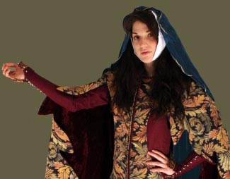 This outfit was featured in Renaissance Magazine’s 2007 wedding issue, and combines elegance and boldness in late 14 th century style! The model is wearing our back-laced gown in wine linen under a tapestry winged surcoat lined in wine velvet. The is gown has been customized with tiny period buttons running from cuff to upper […]