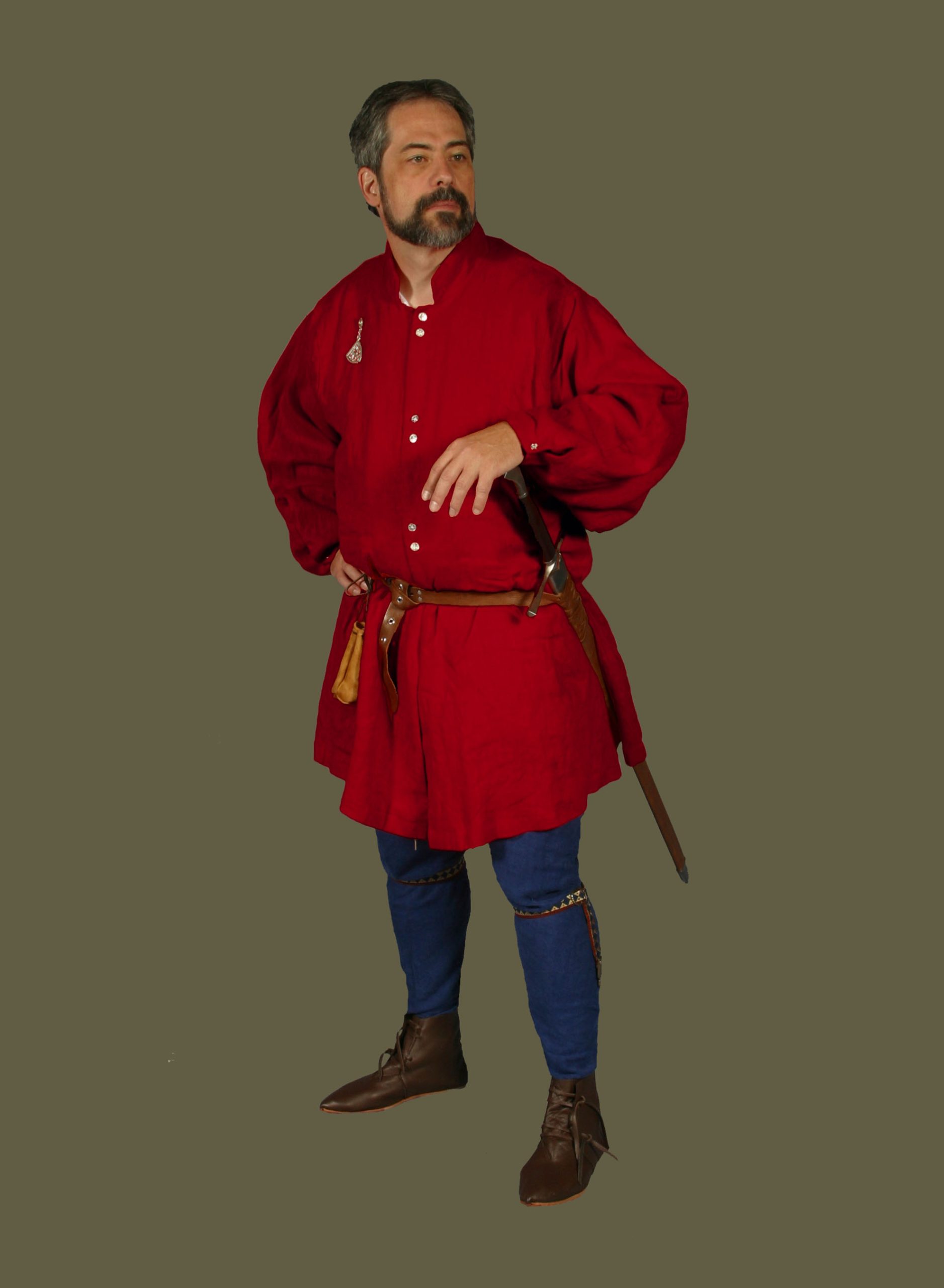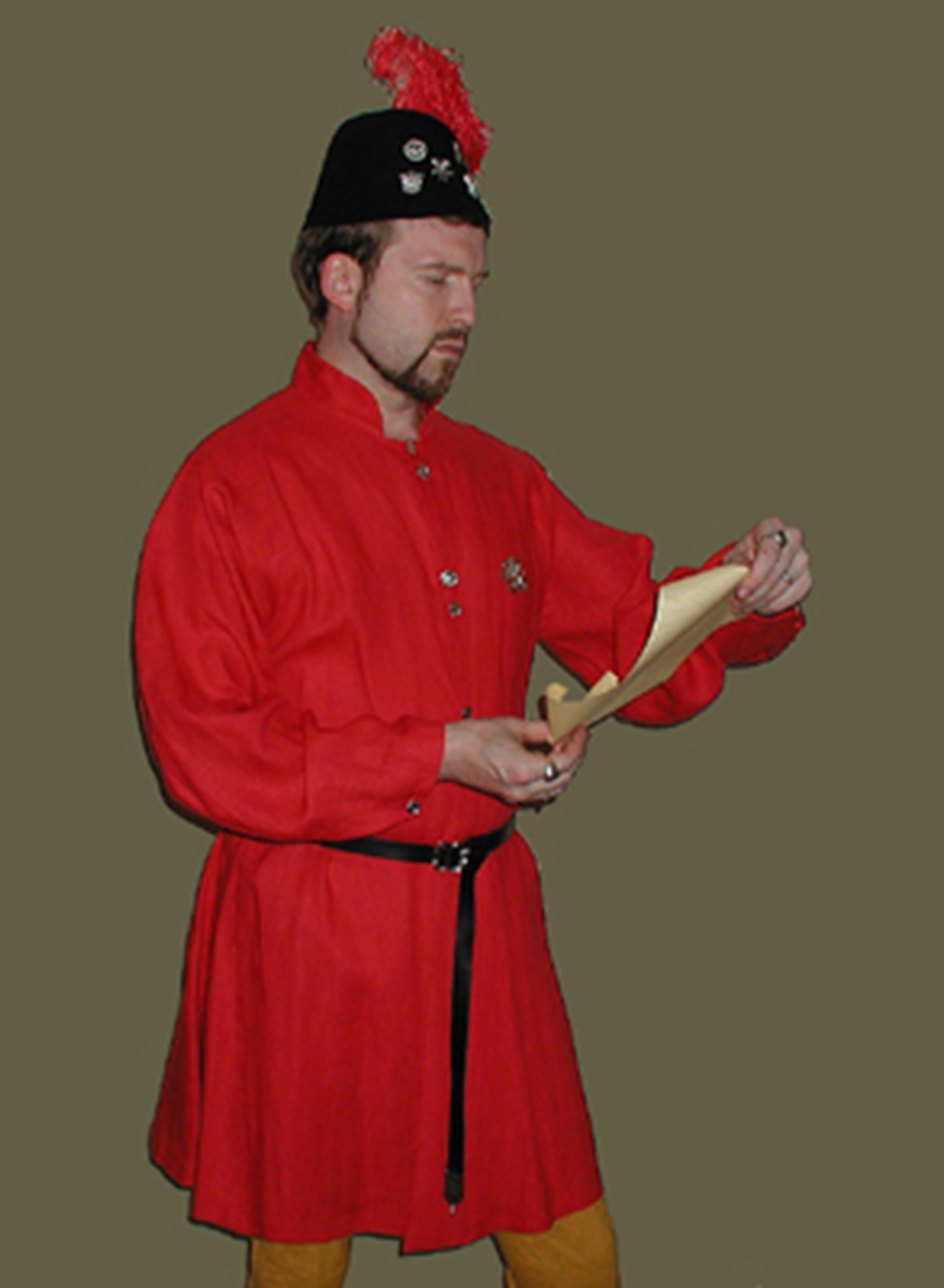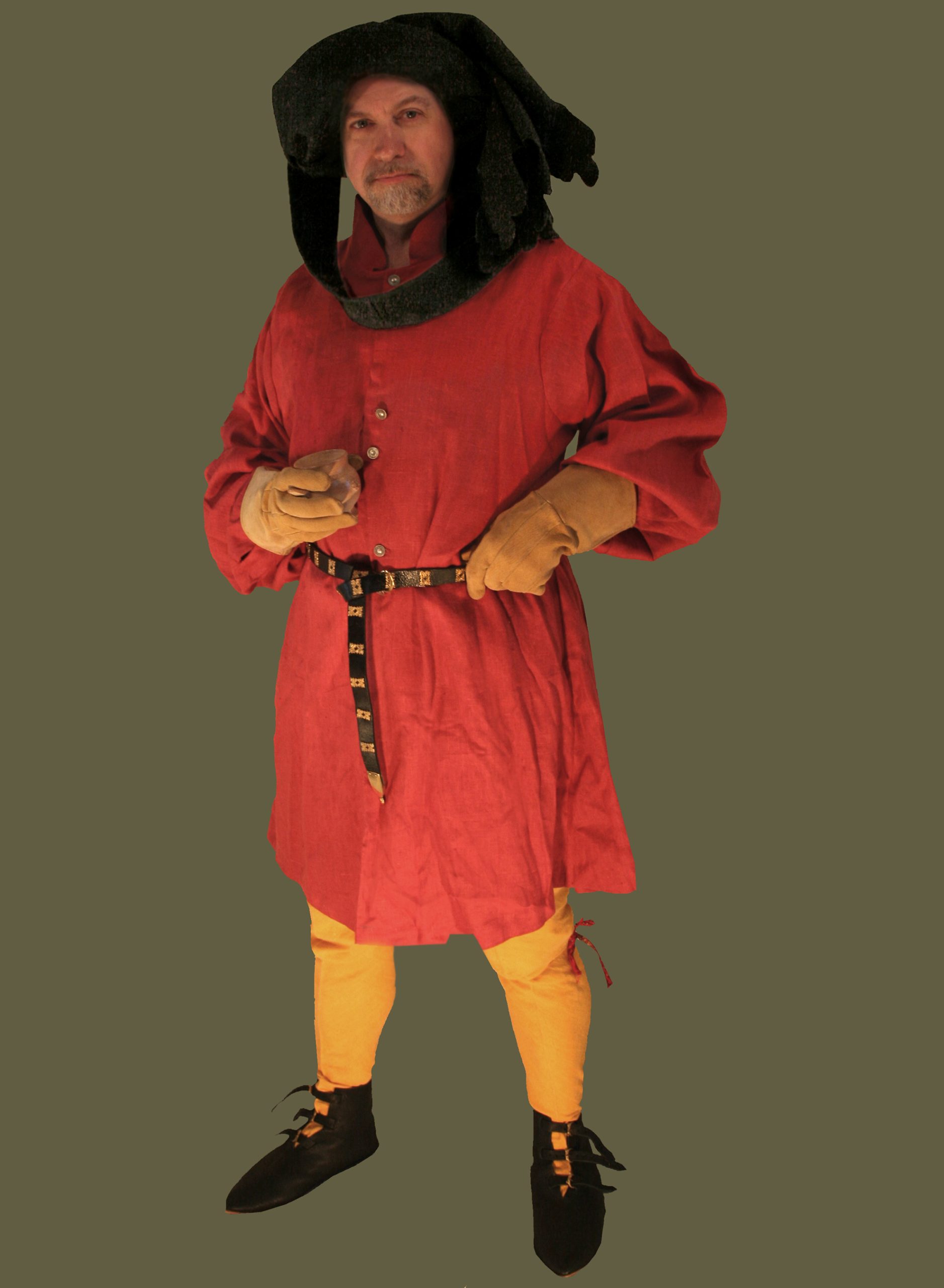 This Lord stands valiantly in a red linen Cotte and gold linen Chauses. Hidden beneath are his Shirt and Braies. He narrows his waist with a decorated Belt. His black Ankle Boots match with his black wool Dagged Hood