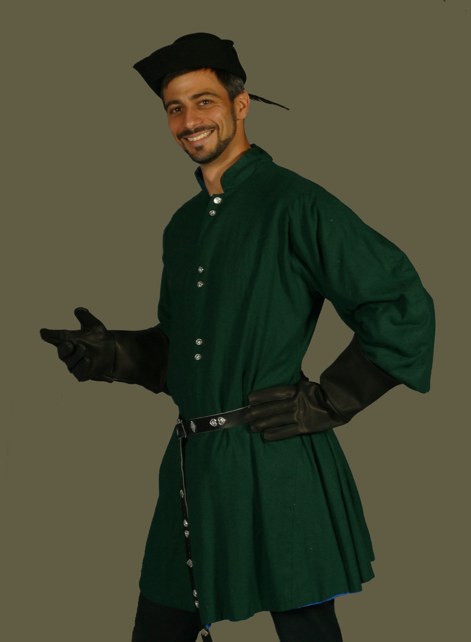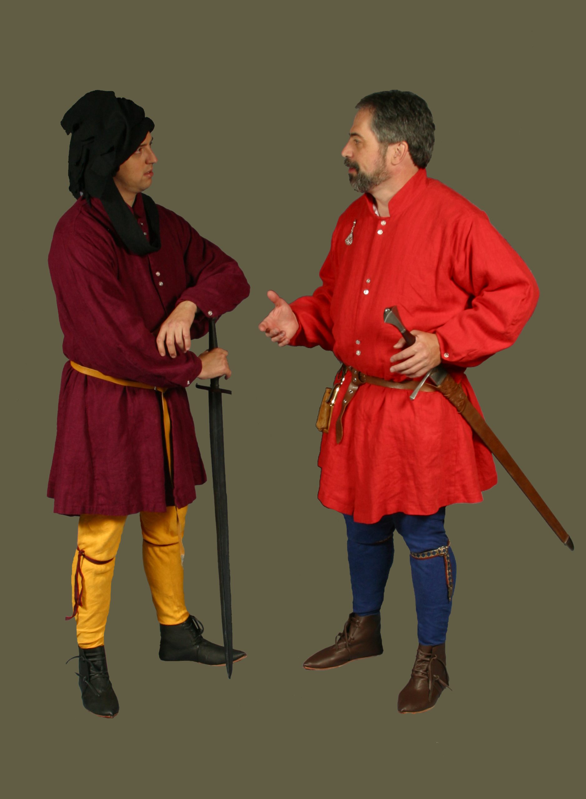 Our cotte is based on contemporary artwork from a variety of sources. We have retained all of the classic elements of the historical design: long, full sleeves that taper at the wrists, a body that flares at the hips, and cast pewter buttons based on a contemporary pattern and arranged in a uniquely medieval placement. As was done in the 14th century, this cotte can be worn alone over a linen shirt, or beneath a houppelande. Revival cottes are available in linen – the ubiquitous fabric of medieval Europe -, wool, and raw silk for the man of means. All edges are finished or fully enclosed, improving both aesthetics and durability.