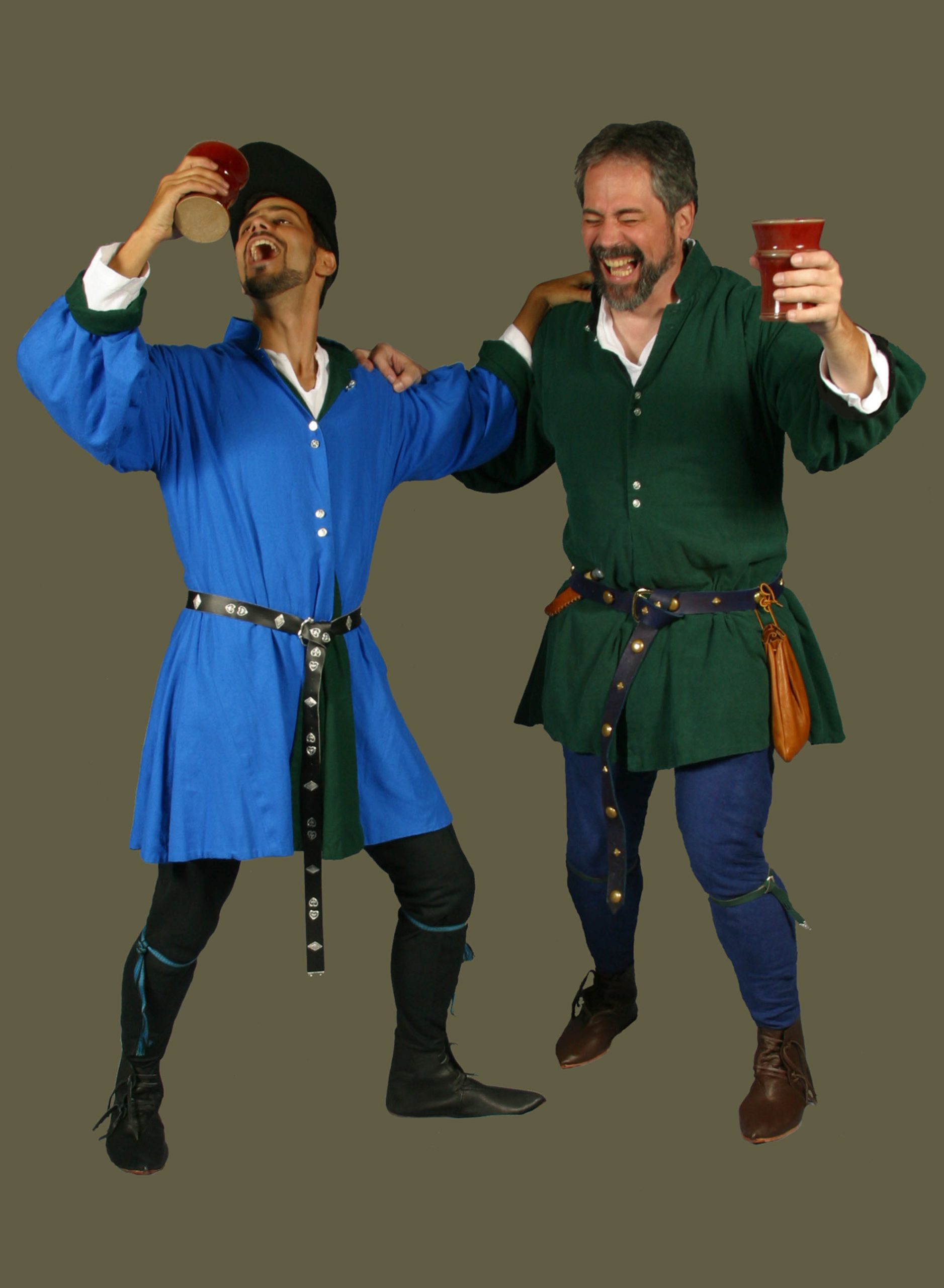 Right: This lord matches his Lady with a green and black linen Cotte. He matches his red Liripipe Hood to his linen Chauses. It is pinned closed with a Decorative Badge. Beneath his Cotte he wears a Shirt and Braies.